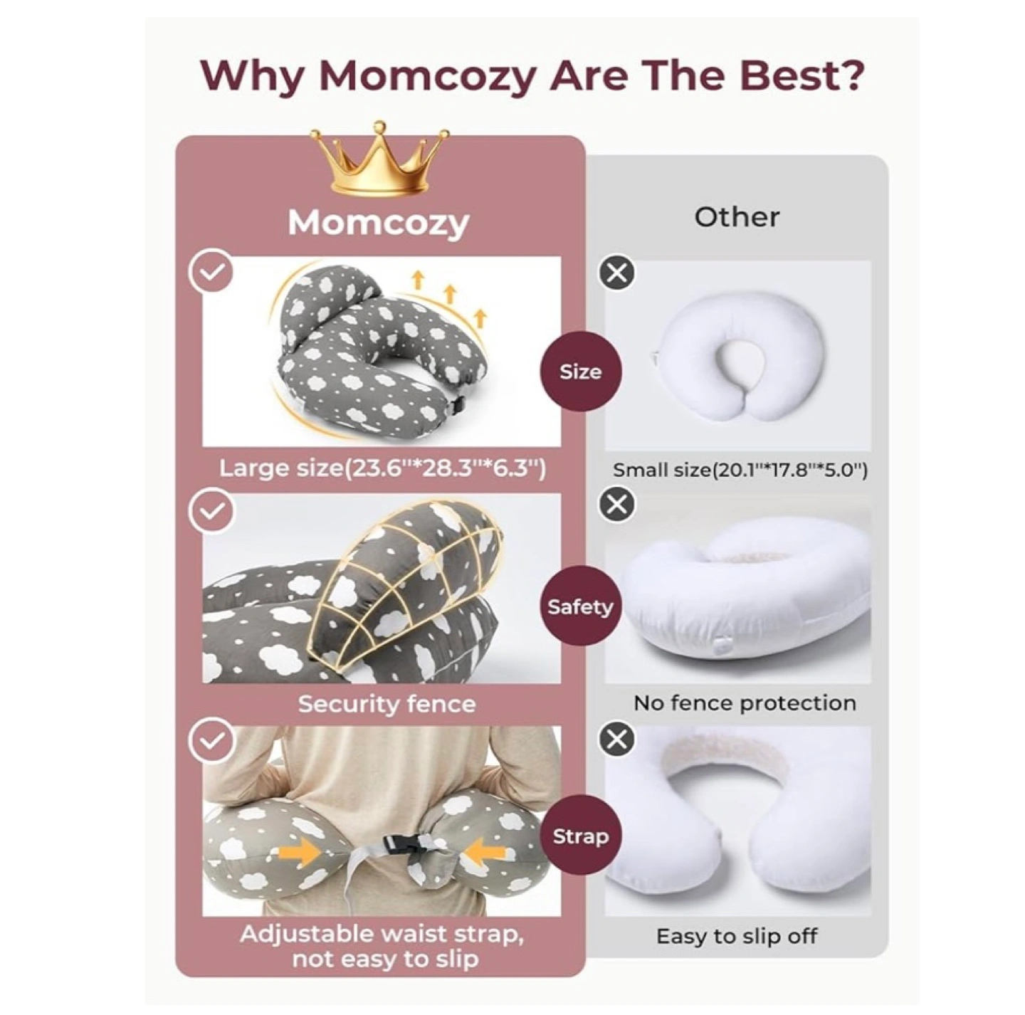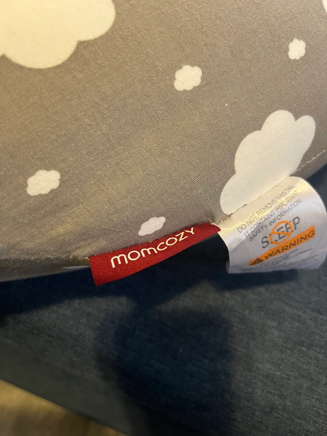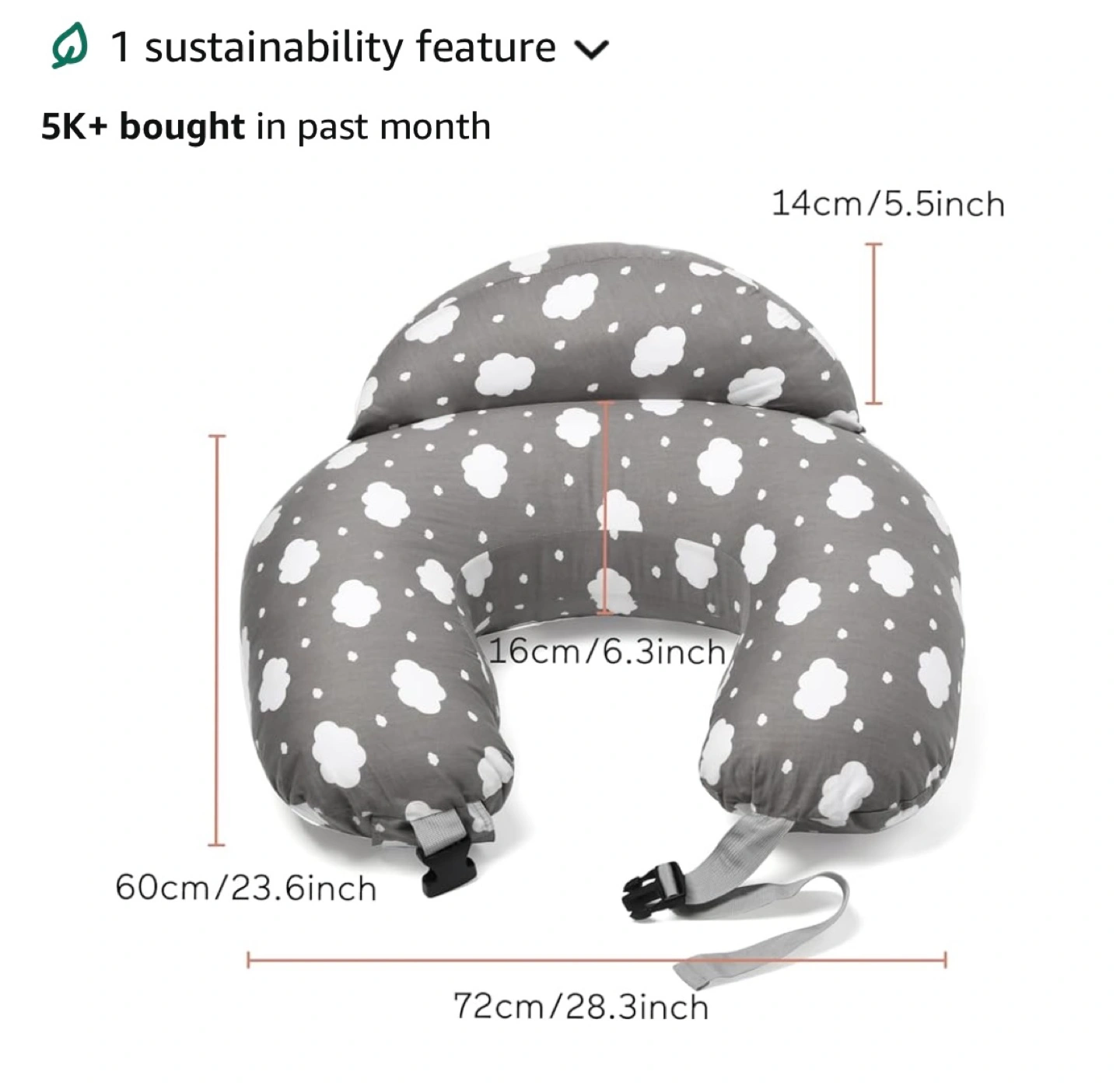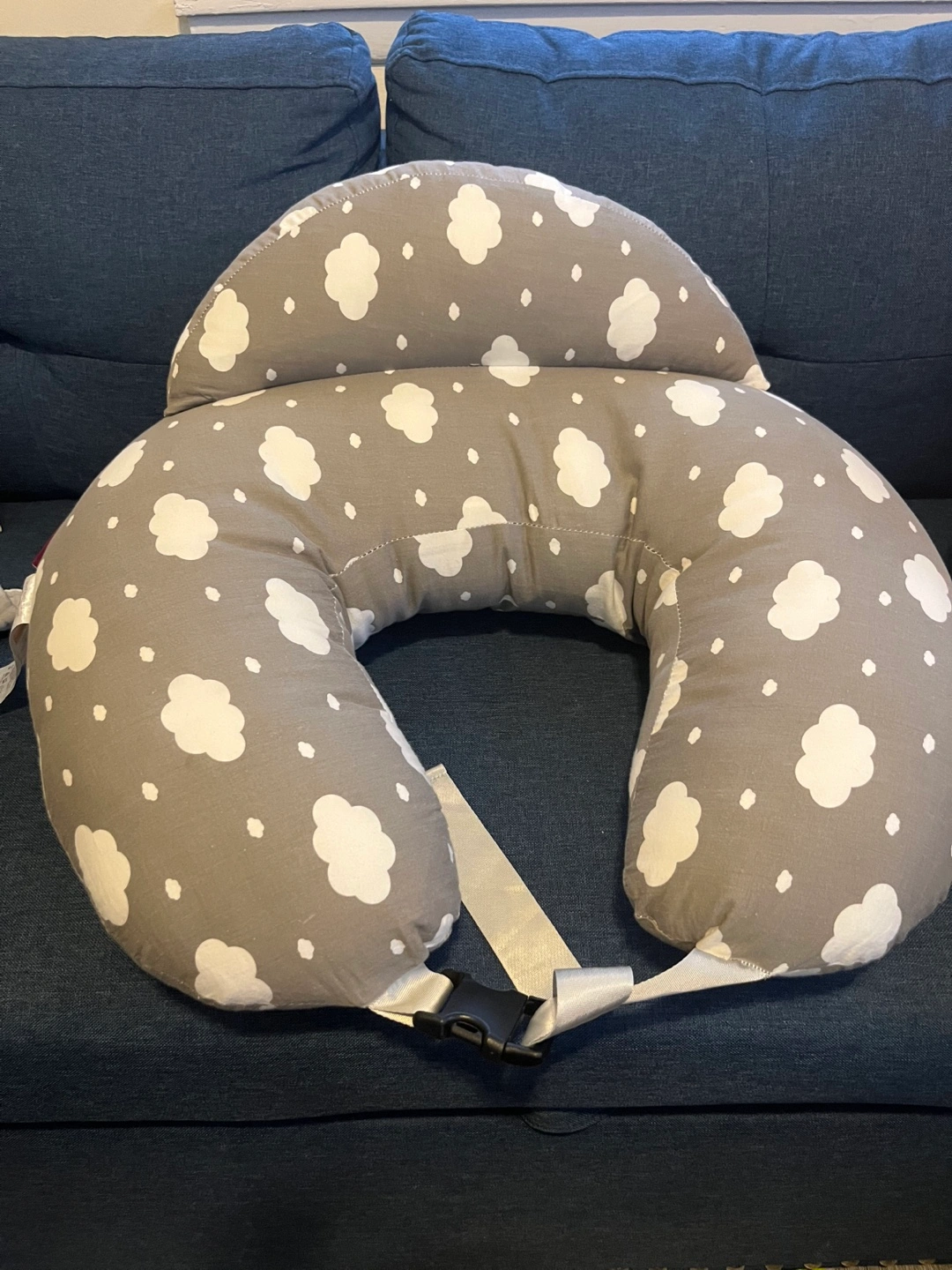 Grey and white cloud print nursing pillow. U-shaped design. Removable cover & machine washable. Adjustable strap.
