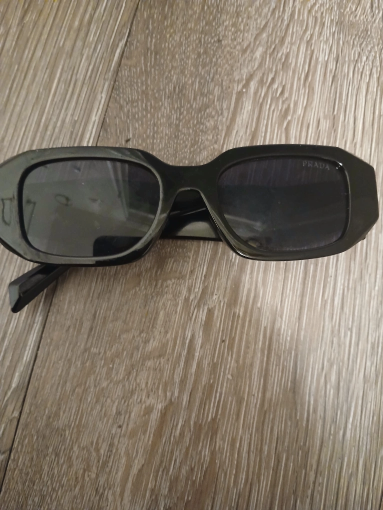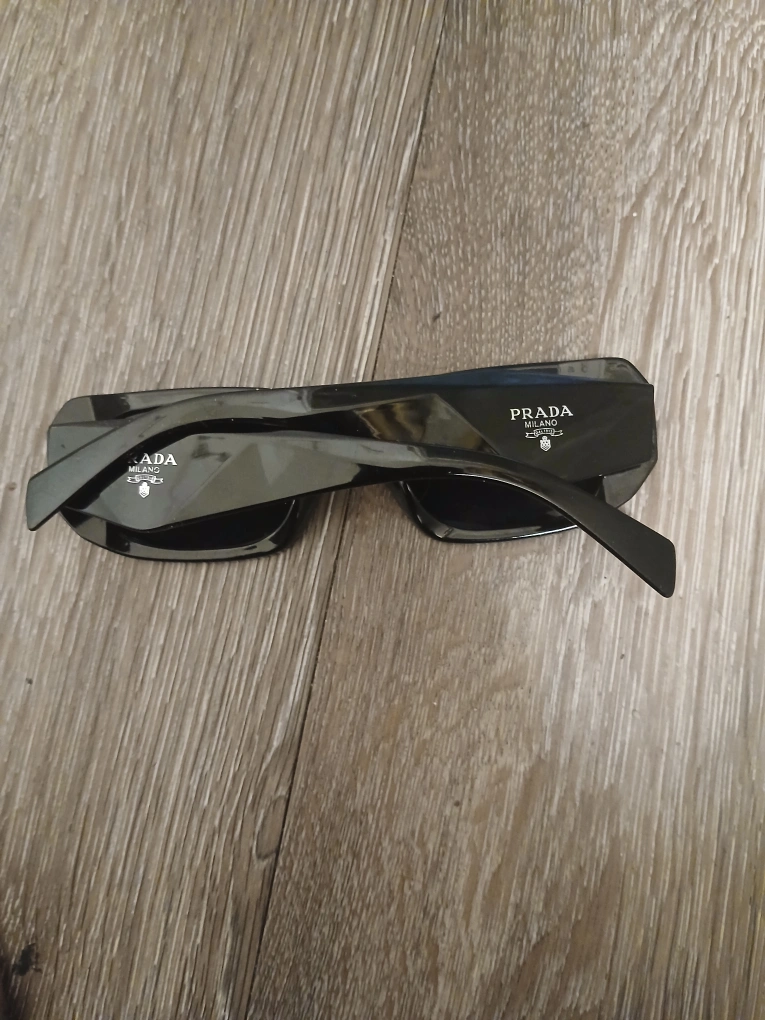 Black rectangular sunglasses. Classic style. Prada logo on arms.