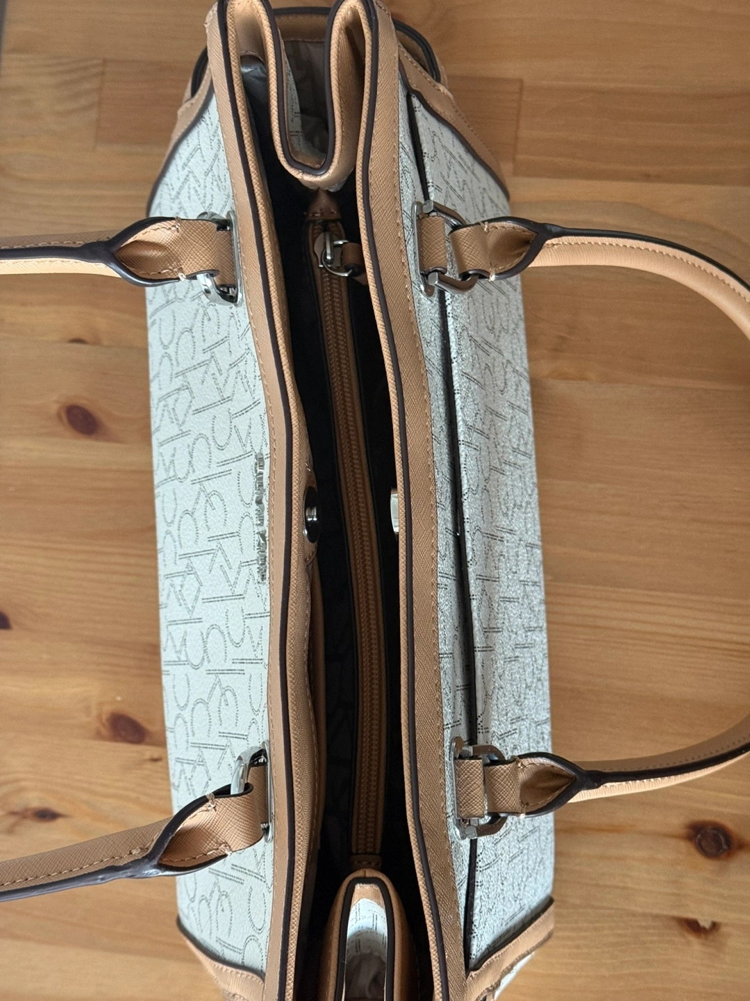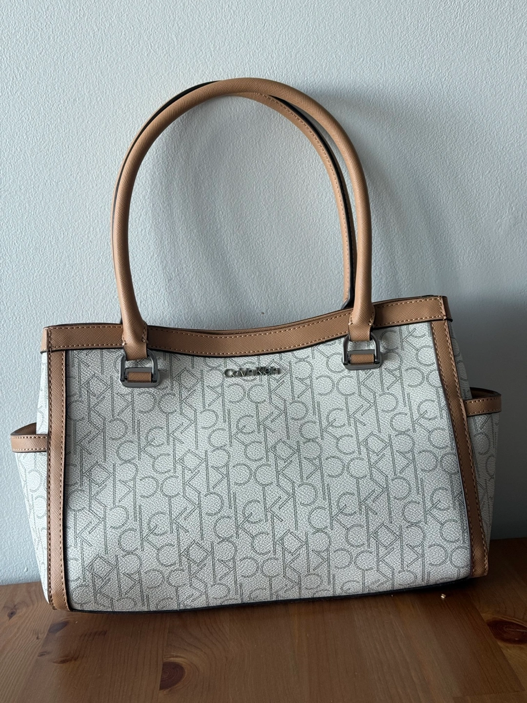 Brand new bag. Newer used. Stylish tote bag. Cream coloured with tan trim. Features double top handles and multiple interior pockets. Great for everyday use.