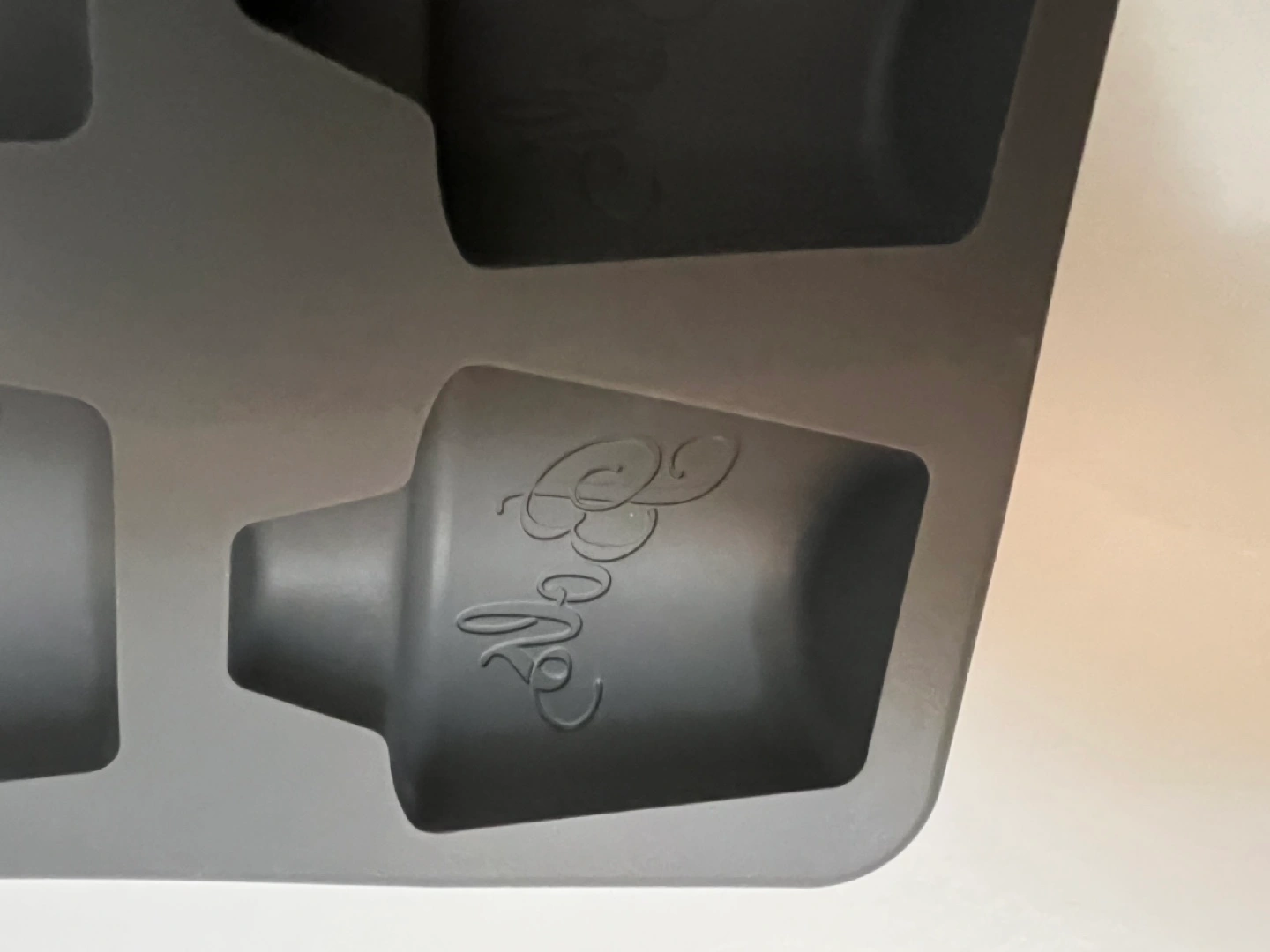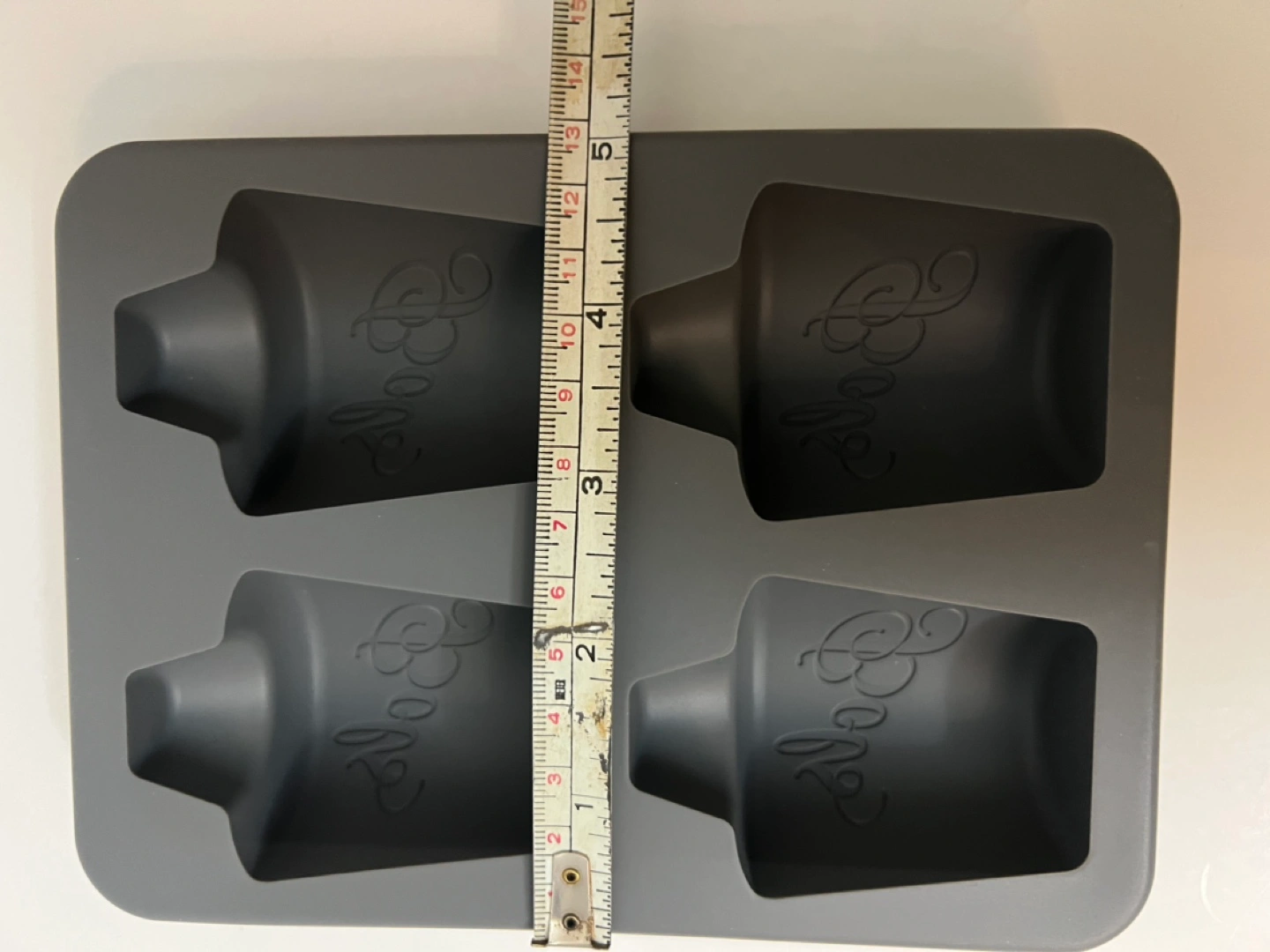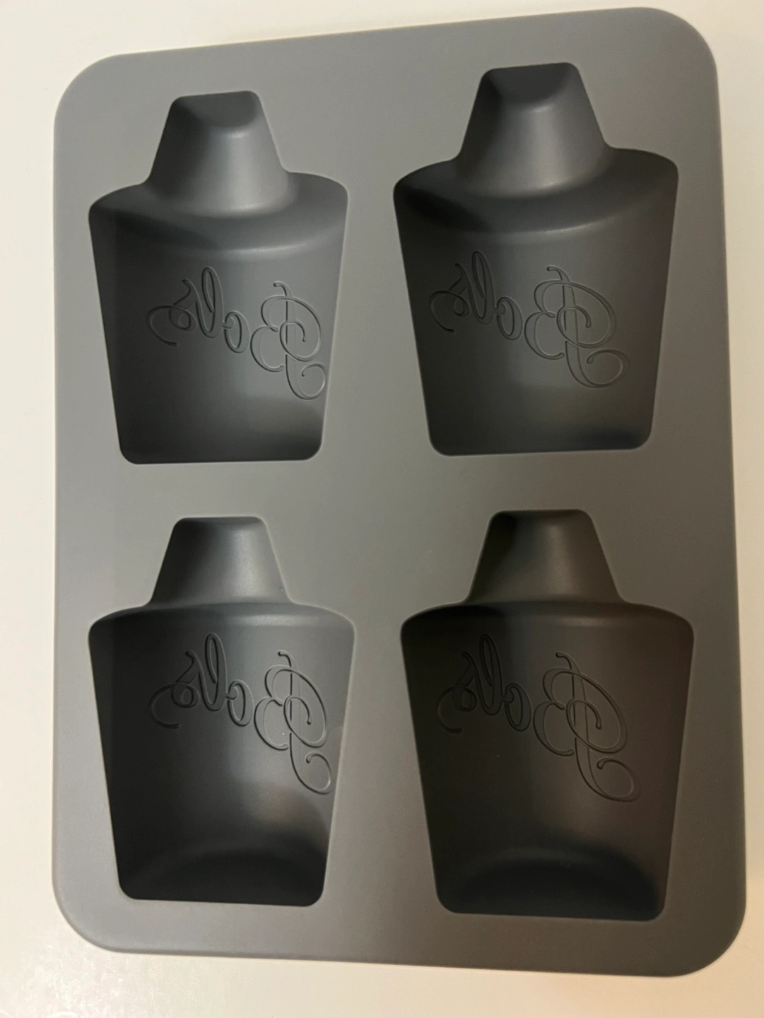 Silicone ice cube tray. Makes four large ice cubes shaped like mini liquor bottles. Gray color. Great for parties!
