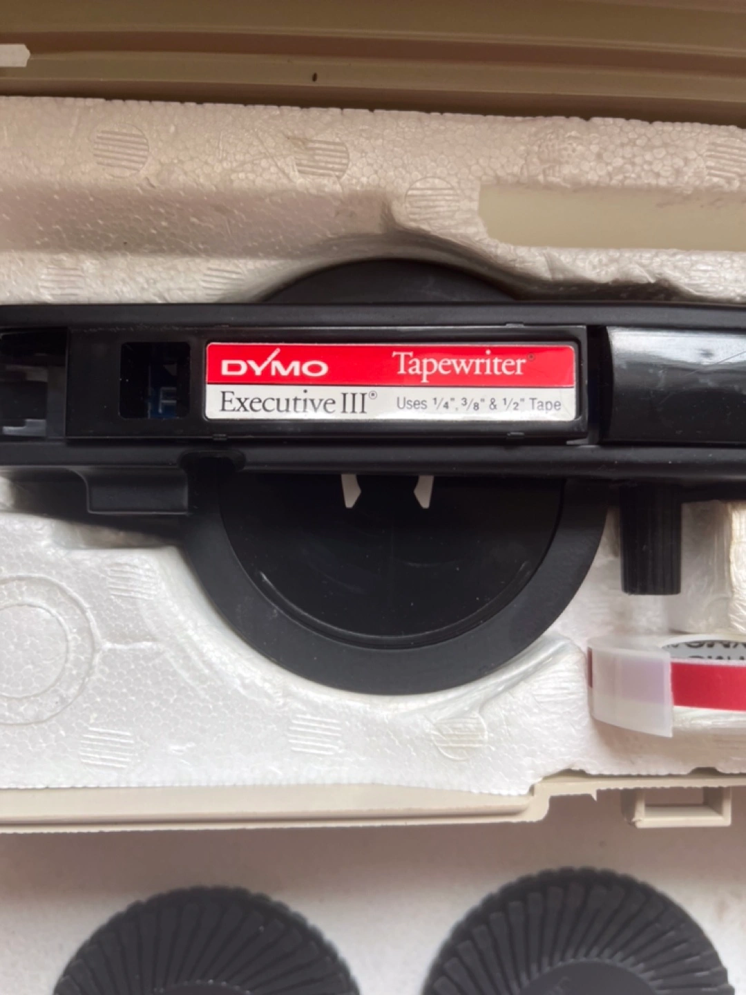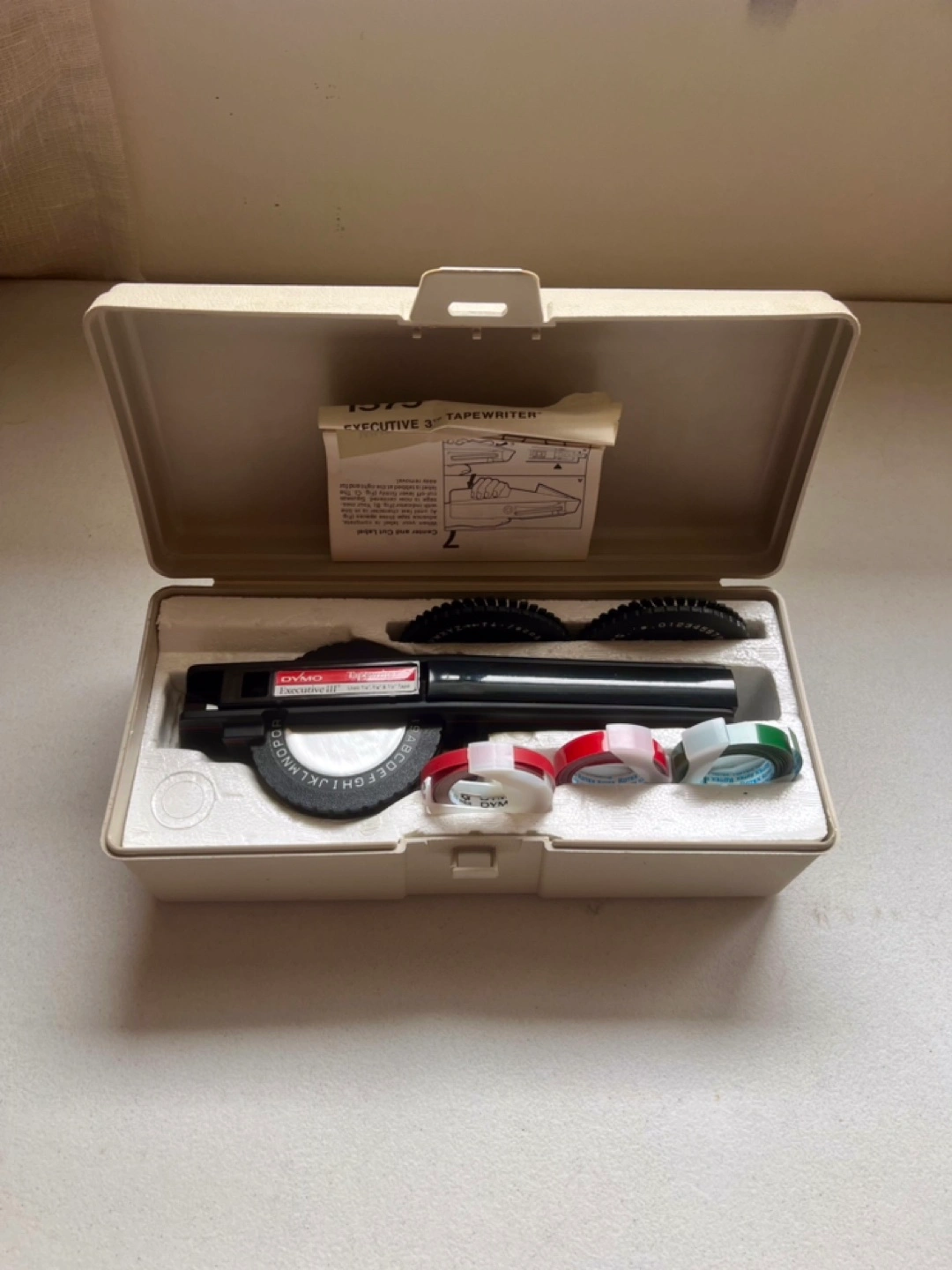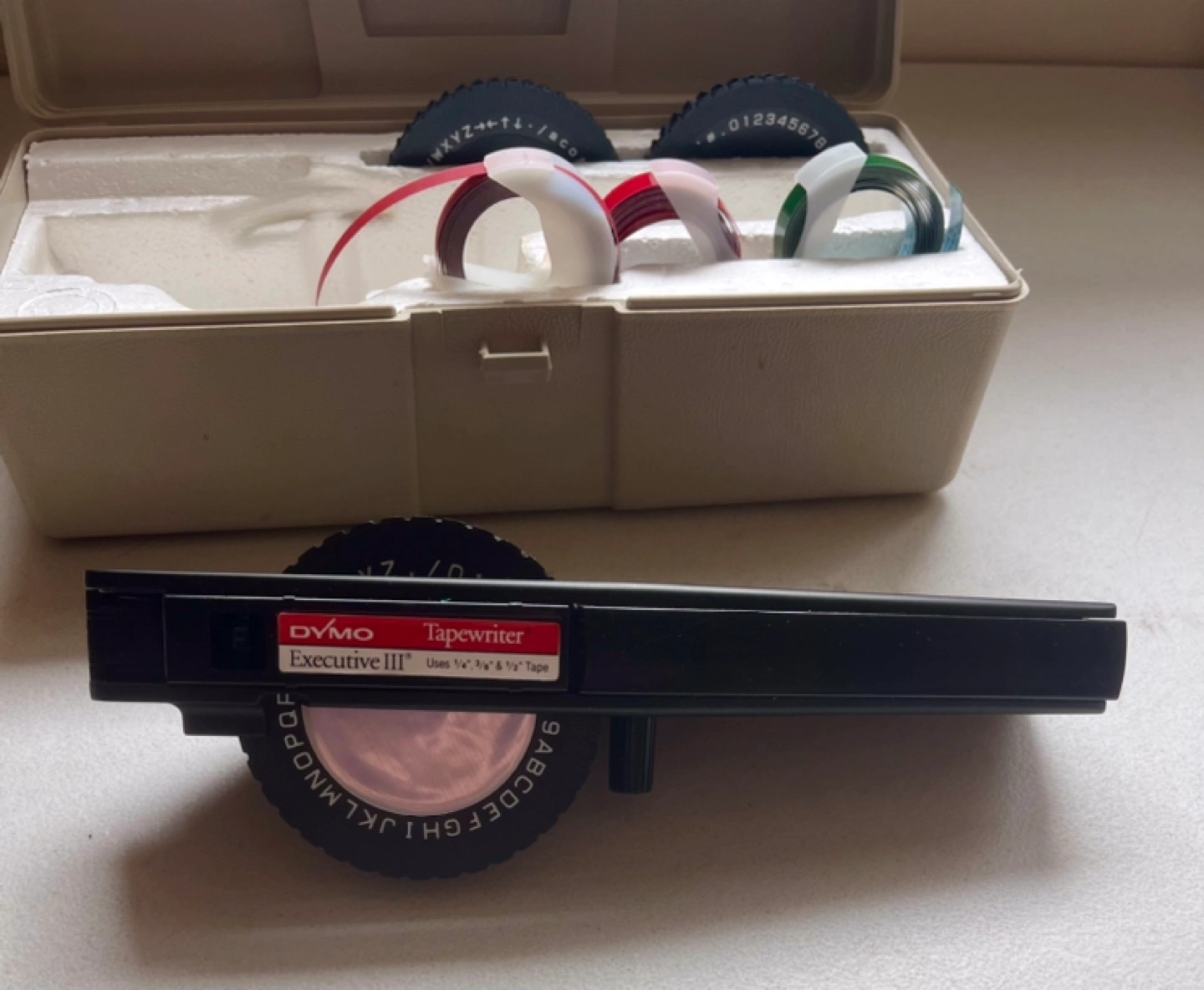 75Dymo 1575 Executive III Tapewriter. Includes carrying case and extra tape. Vintage label maker in great condition. Uses 1/4" & 1/2" tape.