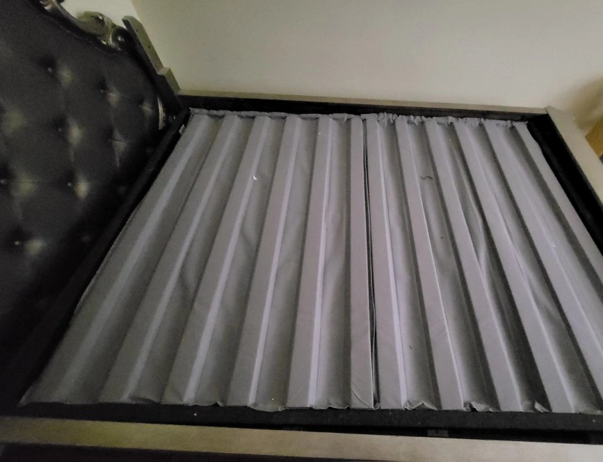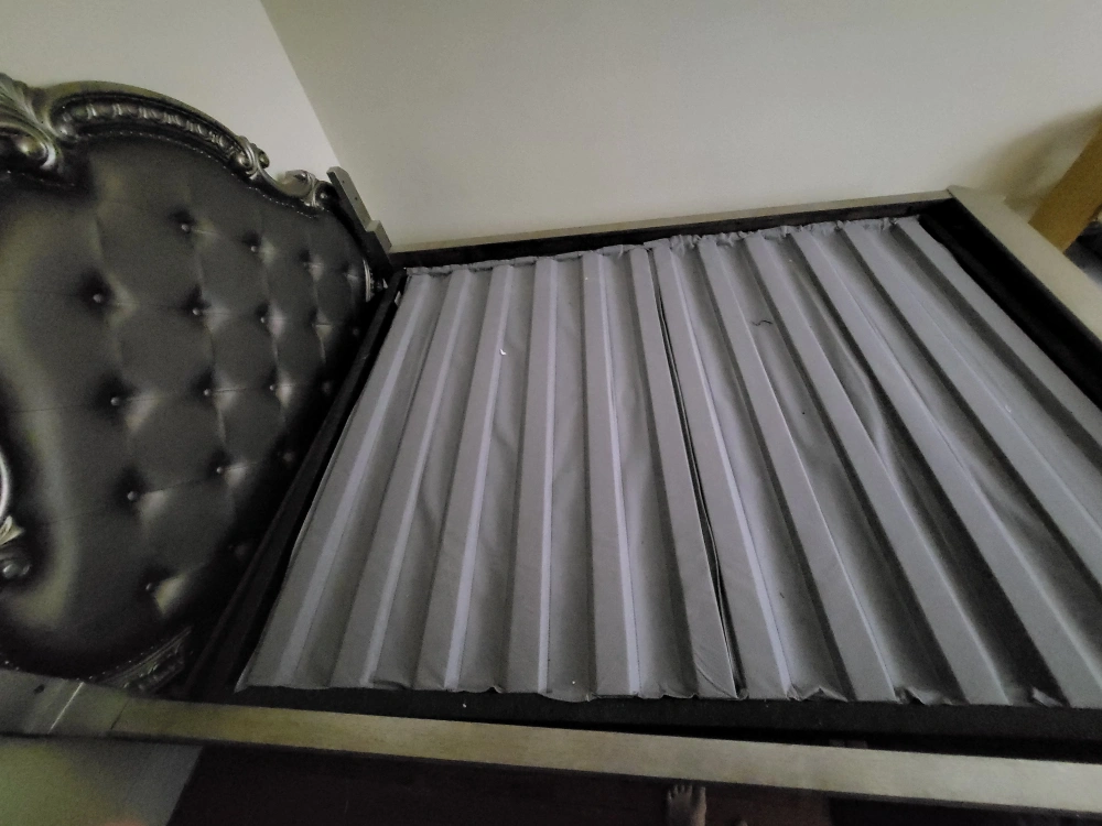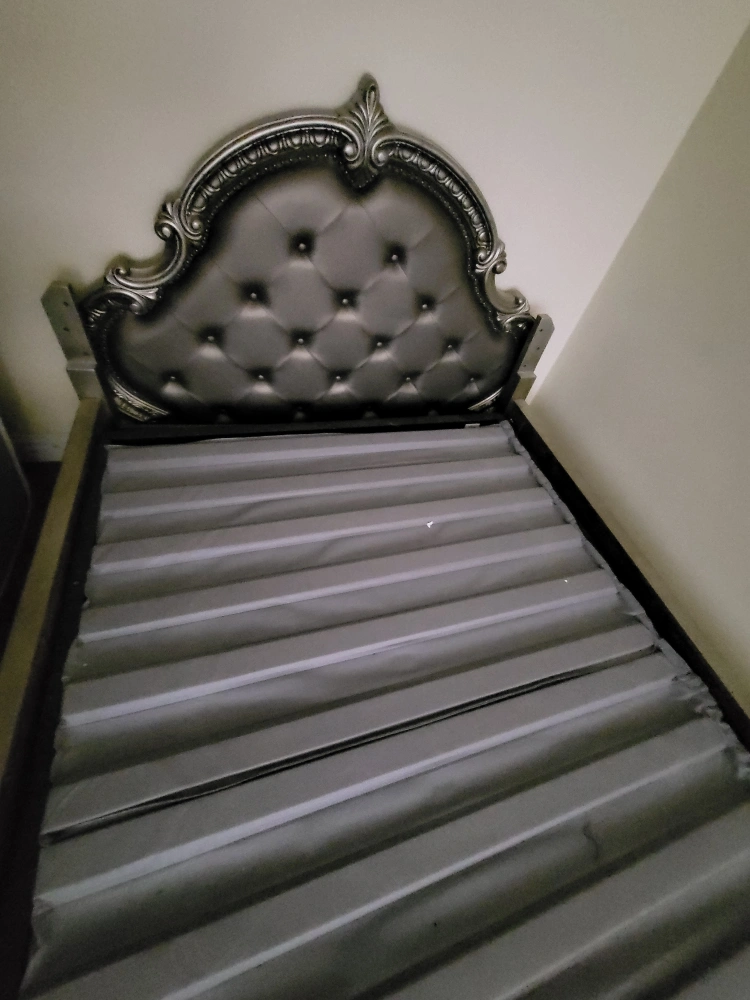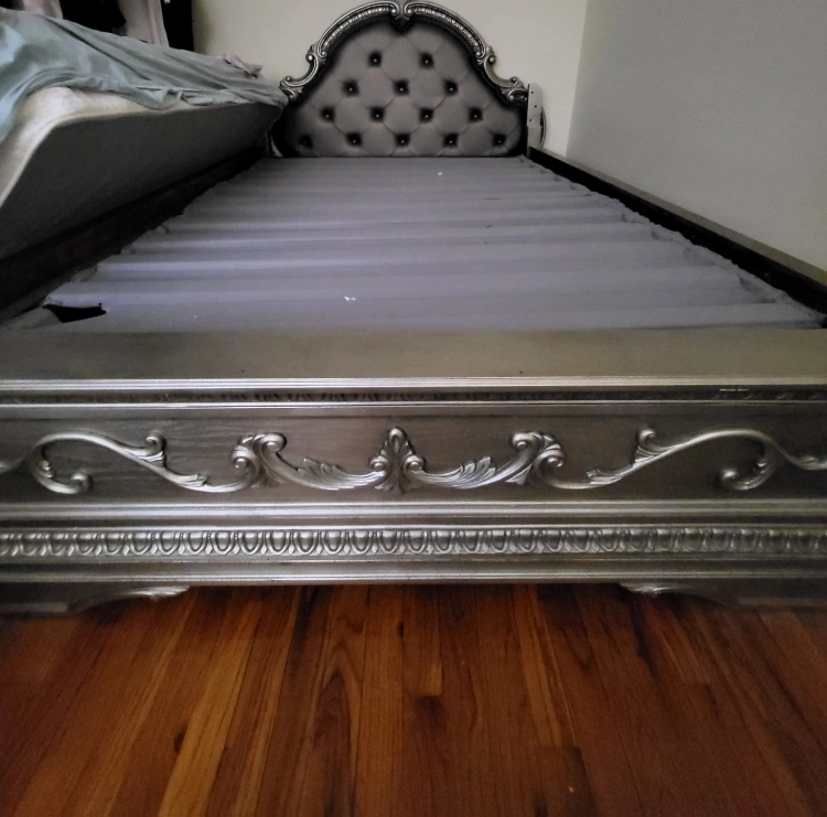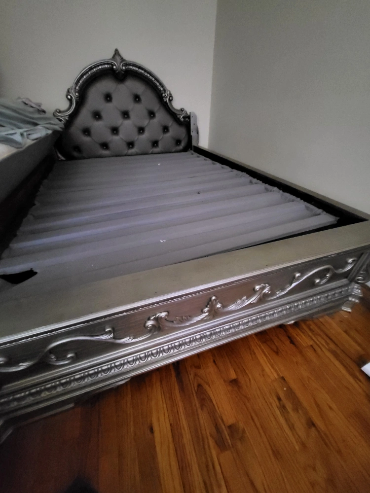 Queen bed frame. Silver metal and wood. USED GOOD condition ( box spring shown in photo is mine and does not come with bed) box spring is Casper brand. Easy to assemble. Average amount of scuff marks and splinters all over the frame that were there when I got it delivered. It's hard to deliver. Expect more marks when you get it delivered to your place. Bed is 3 years old and still looks excellent. Nothing broken. Headboard is in very nice condition. Bed is low rise. Frame is very study. Includes 4 support slats to support the frame on the bottom. I will take the frame apart for delivery and try to include all the screws and pieces. Free Local pickup in queens nyc.