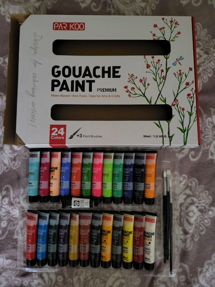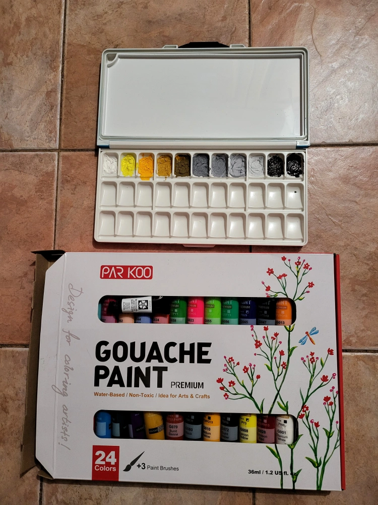 price negotiable Parkoo brand : Gouche paint 24 colors(most colors unopened) 3 unused brushes included Daniel Smith extra fine watercolor- black color included. It's the small black tube with white label lying the middle of the plastic. 33 hole paint palette (can be bought separately $20) only used top row