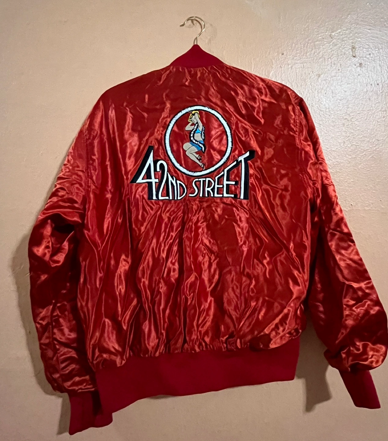 Red satin bomber jacket. Features embroidered 42nd Street logo on the back. Snap button closure. Men's size large. Pre-owned.