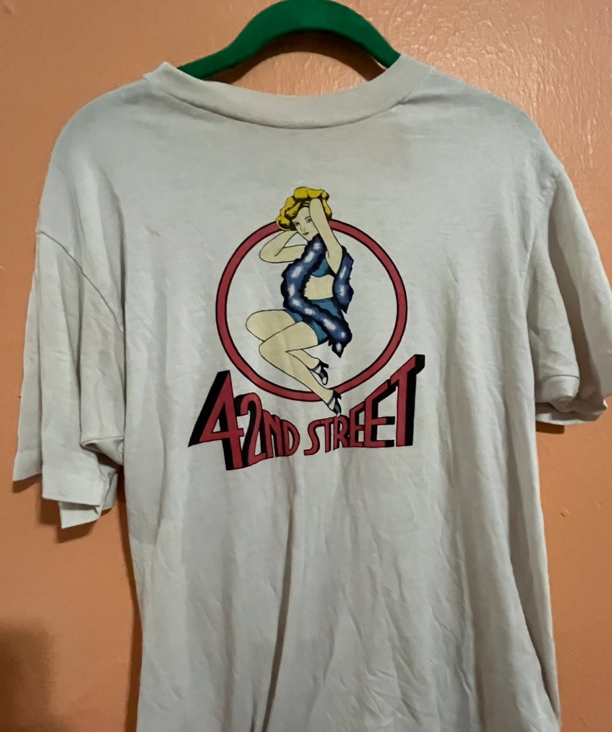 White short sleeve graphic tee. Features a pinup girl design with 42nd Street text. Pre-owned.