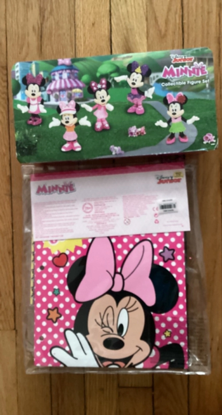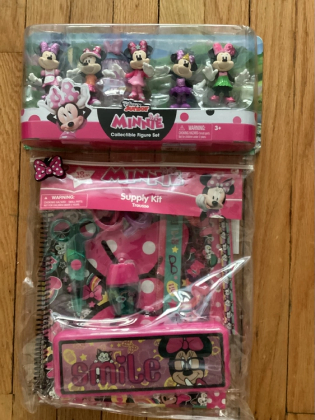 Minnie Mouse collectible figure set. 5 figures included. Also, a Minnie Mouse school supply kit. Includes a notebook, scissors, pencil sharpener, and more. Both are new.