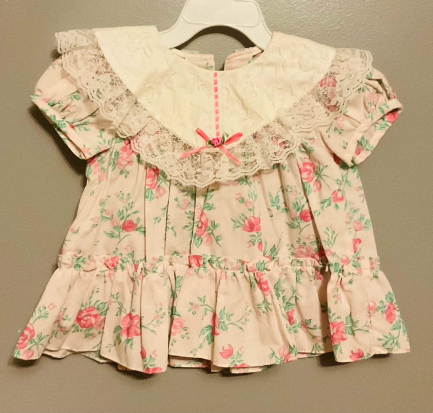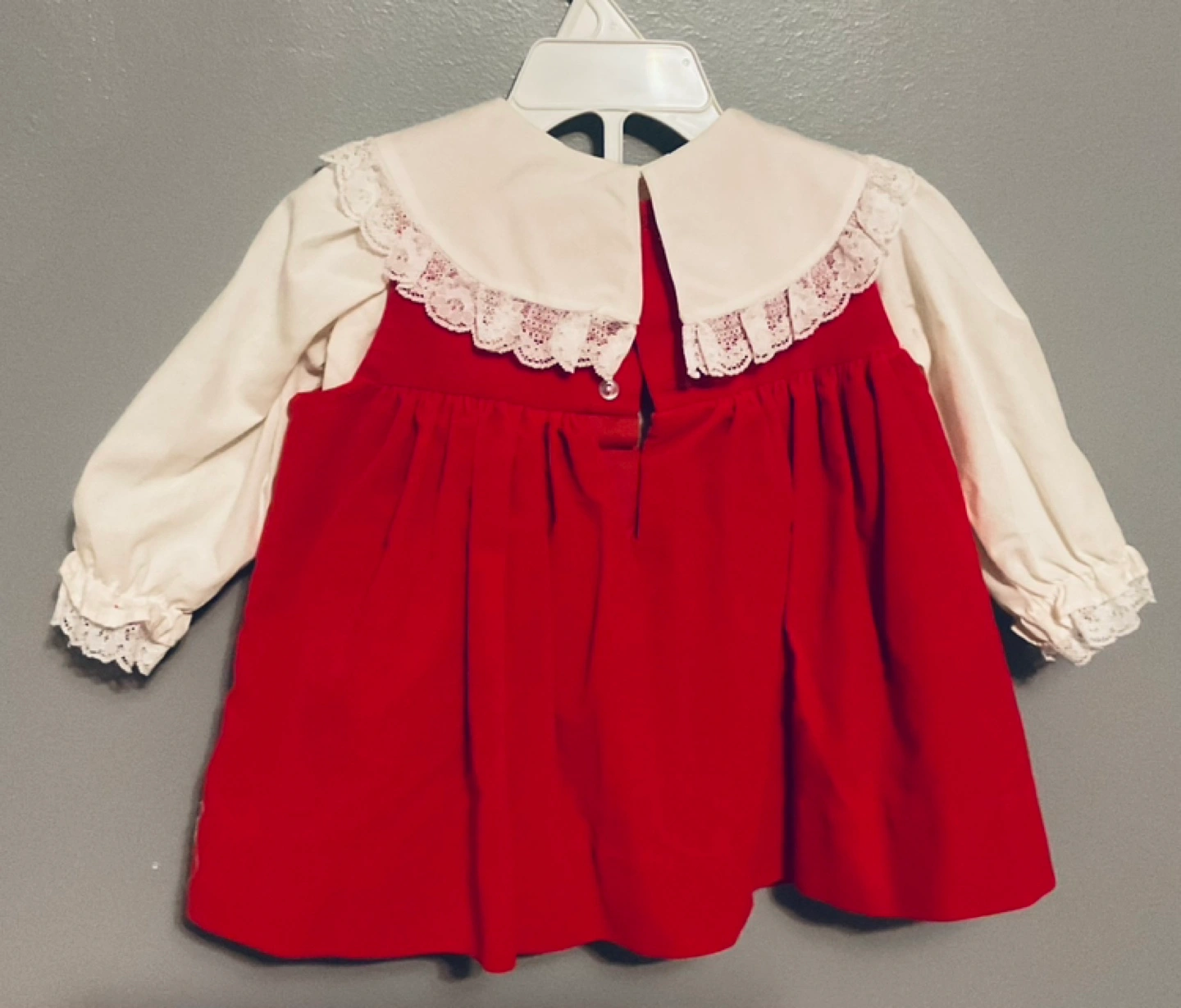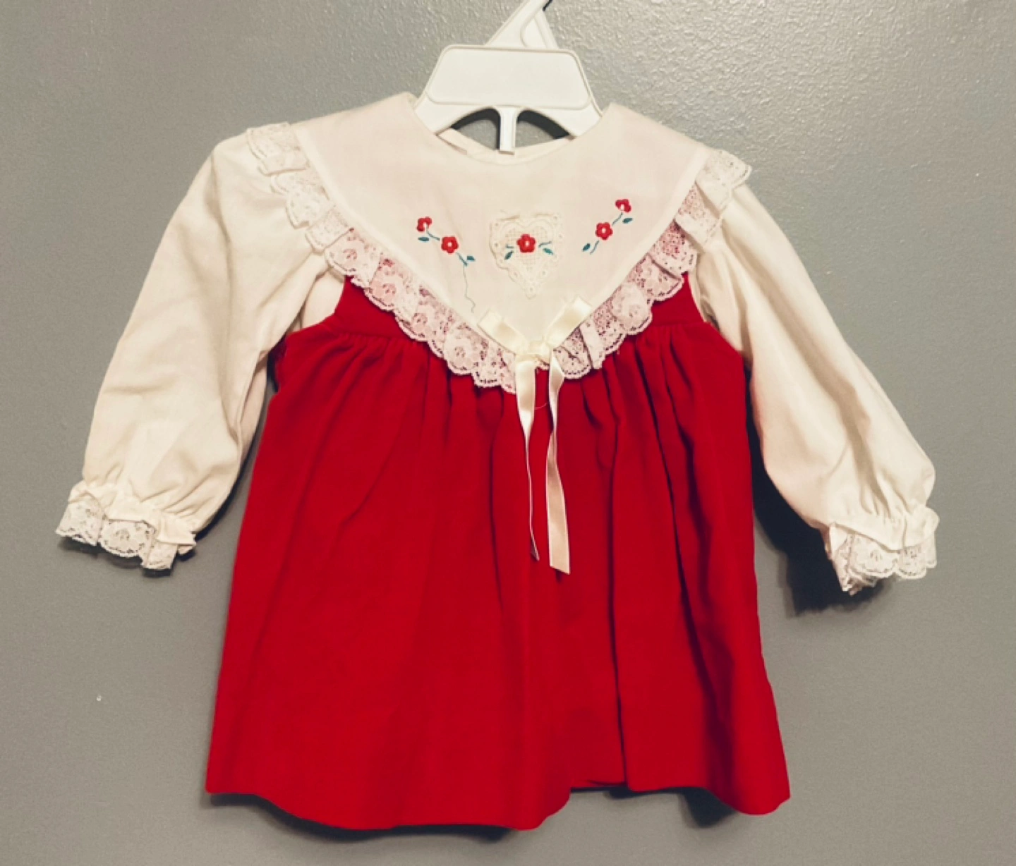Adorable vintage baby girl's dress set. Includes a red velvet dress and a floral print dress. Both feature lace trim and embroidered details. Perfect for special occasions or photoshoots. Size 12 to 24 months $10 each or take em all $25π