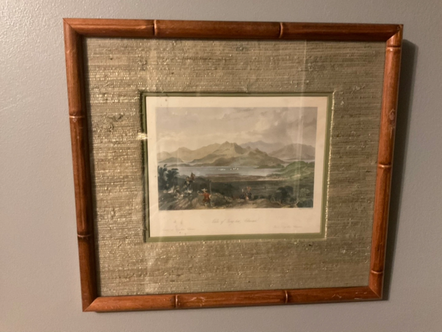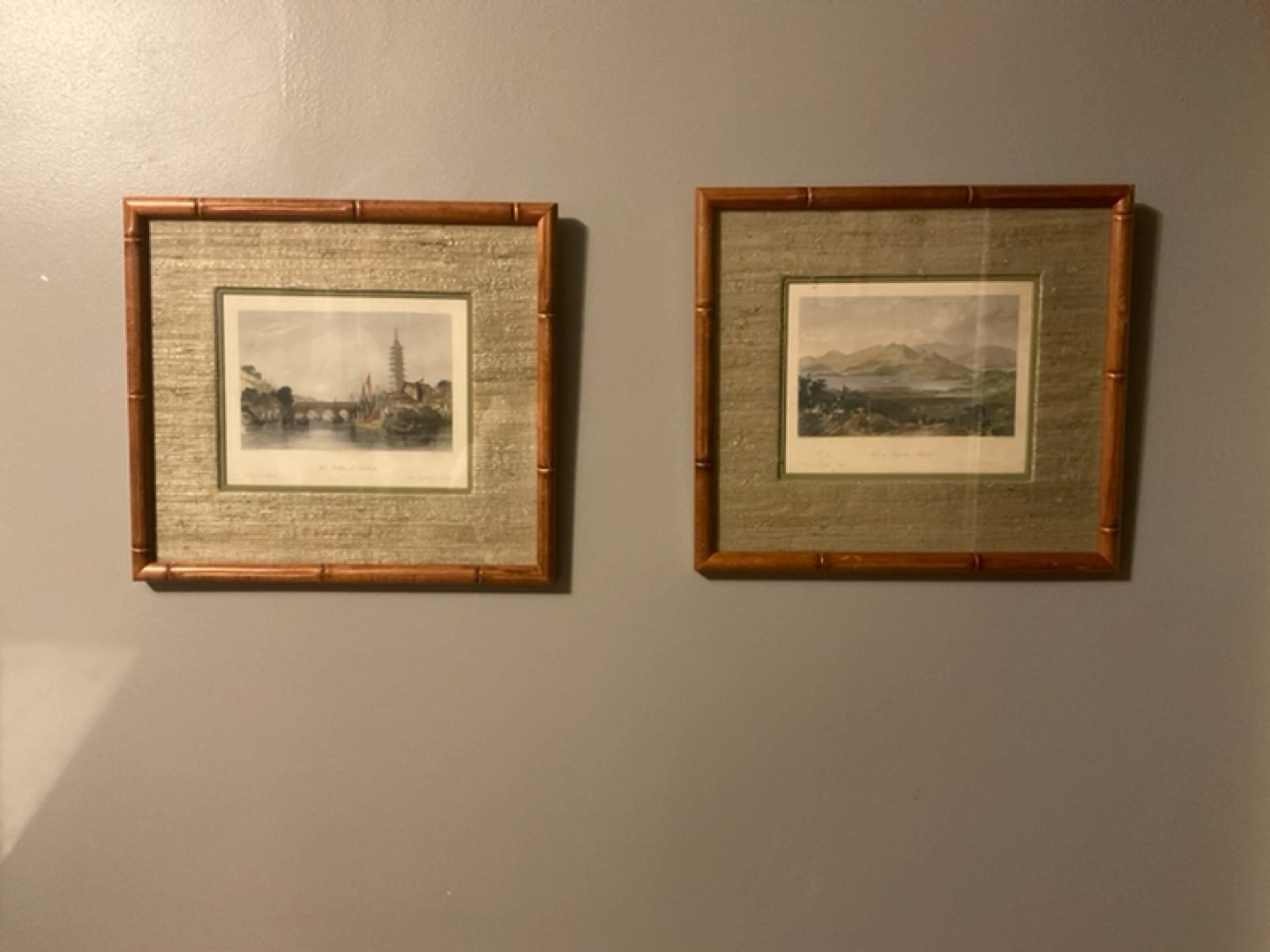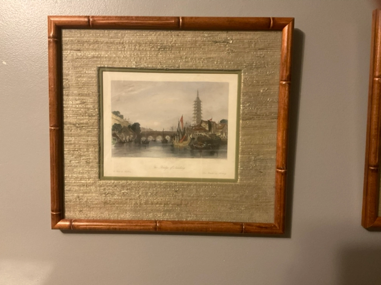 Two framed prints. One depicts Bay of Killarney, Ireland. other shows Bridge of Canton, China. Bamboo frames. Nice decorative accents. Slight scratches on frames