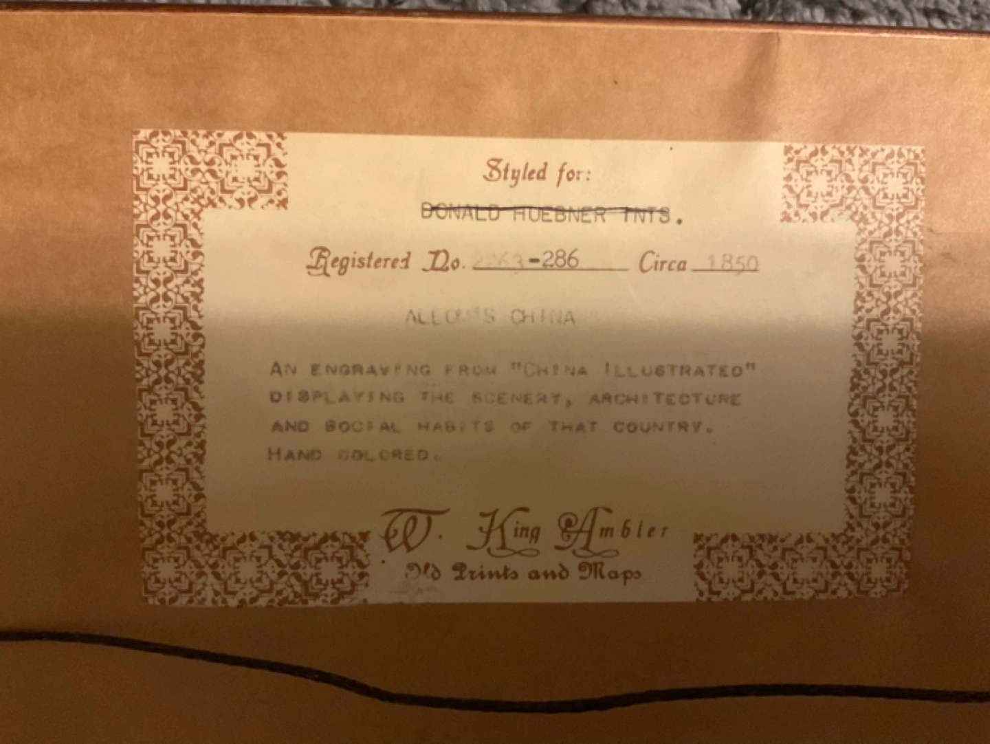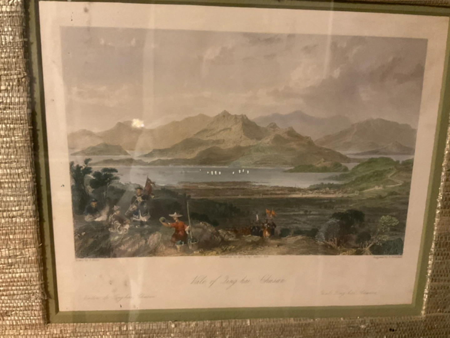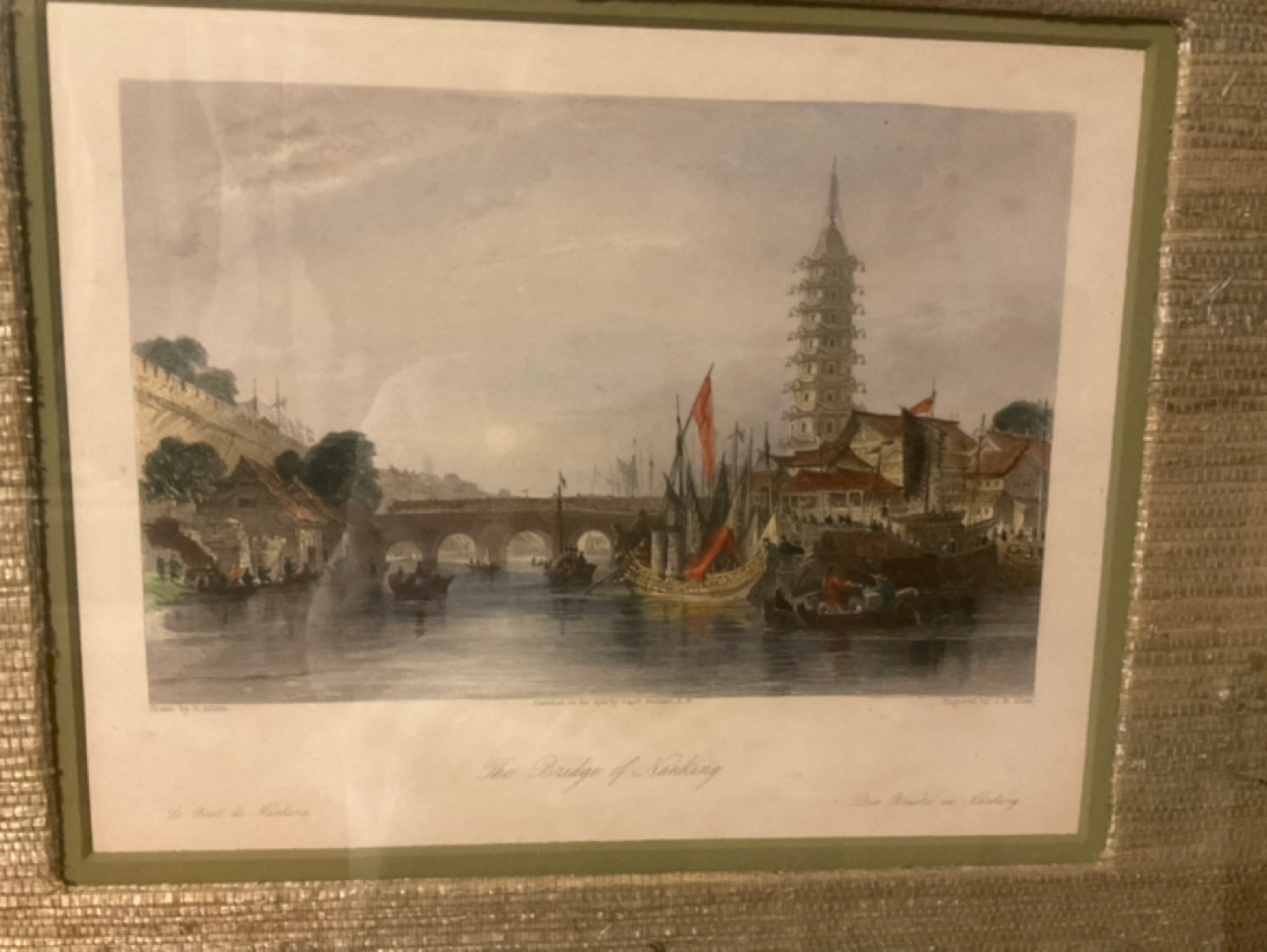 Two framed prints. One depicts Bay of Killarney, Ireland. other shows Bridge of Canton, China. Bamboo frames. Nice decorative accents. Slight scratches on frames