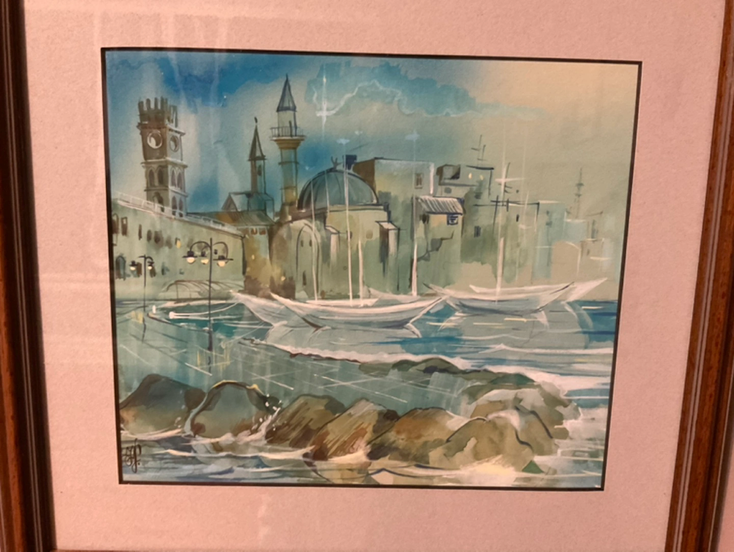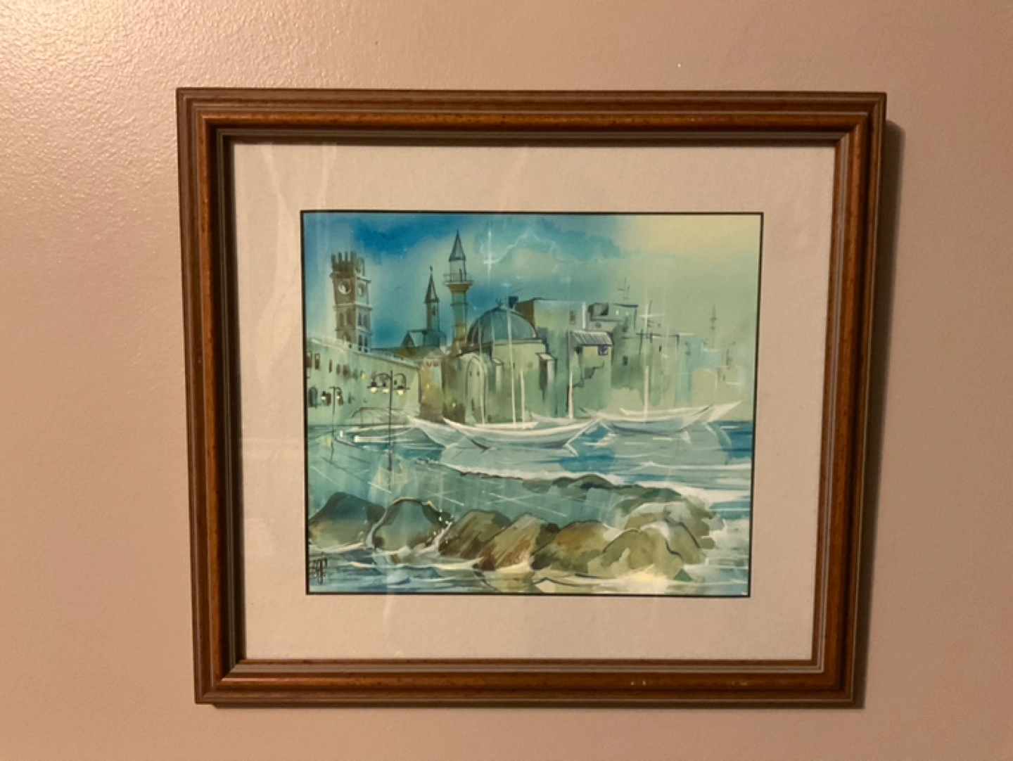 Beautiful watercolor painting, framed. Depicts a harbor scene with boats and buildings. Artist's signature present. Framed by FastFrame.