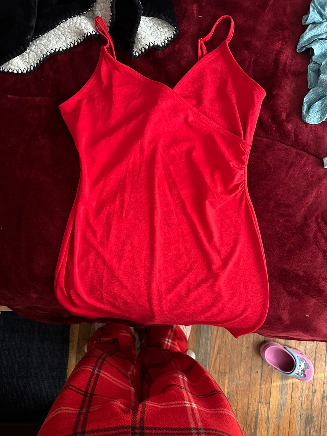 106Red jersey knit cami dress. Wrap style. Spaghetti straps. Lightweight material. Good for summer.