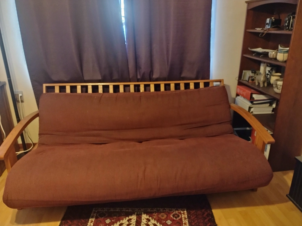 Sofa bed. Futon firm. Good condition. Dark red. Solid oak frame. 6'-8". Can be easily disassembled for transport. Cash only Pick up. Delivery possible nearby. (extra $10).