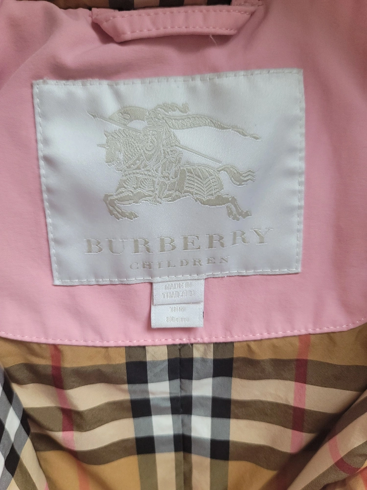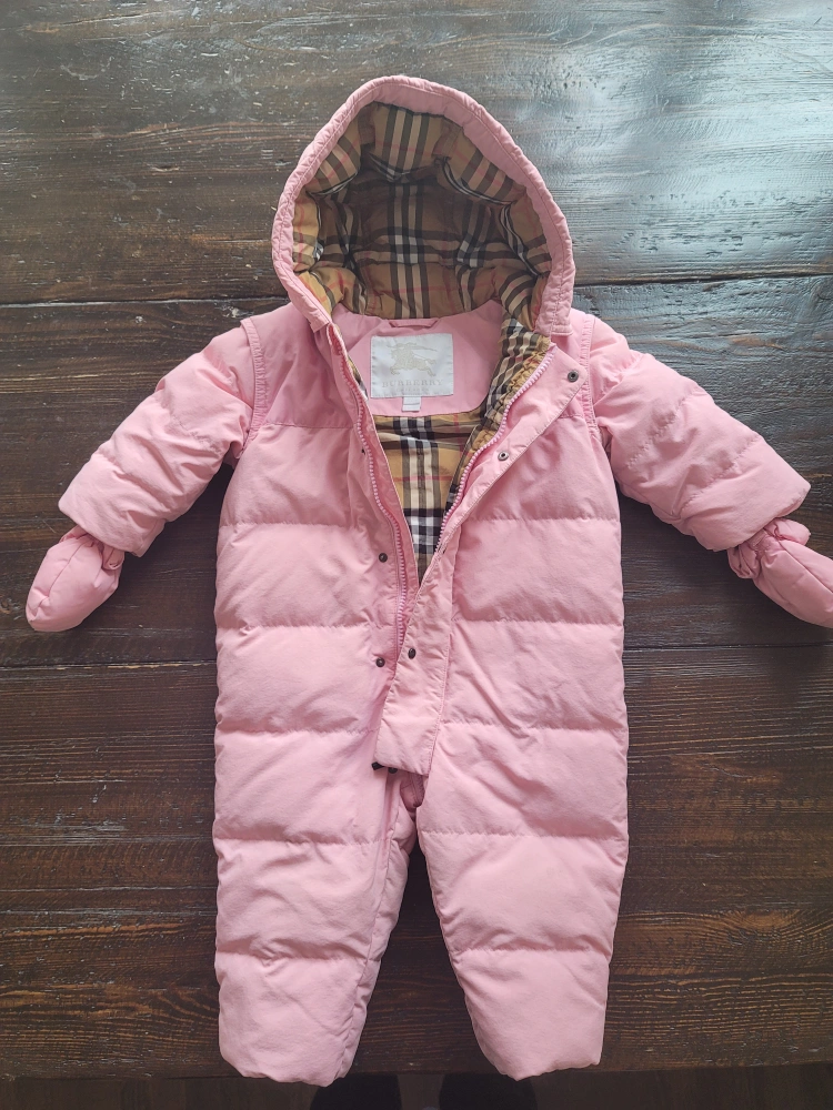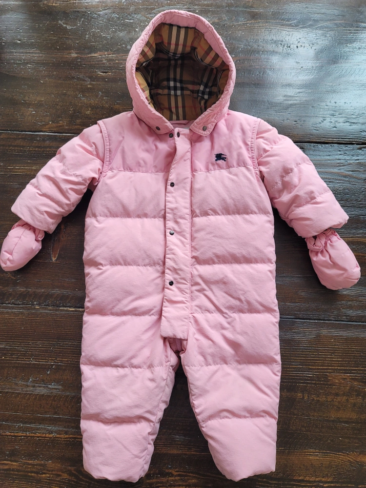 Adorable pink baby snowsuit. Attached hood with signature Burberry check lining. Snap closures. Includes attached mittens. Perfect for winter.