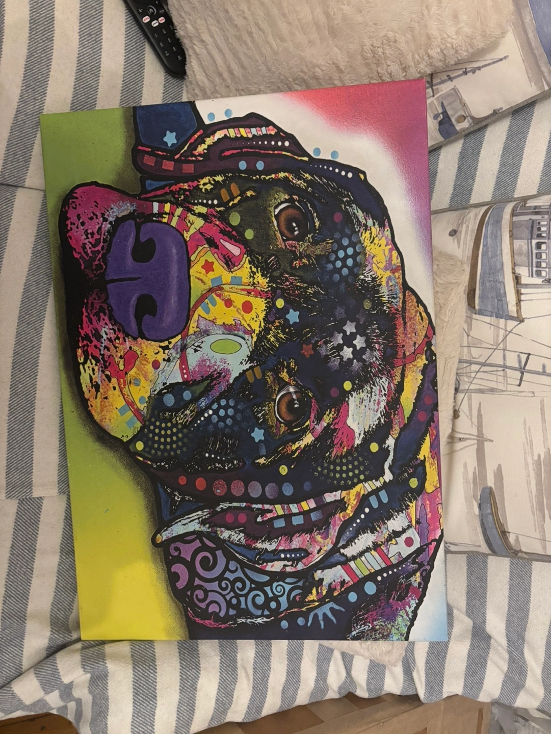 174Vibrant artwork featuring a dog's face. Canvas print. Bold colors and patterns. Unique style.
