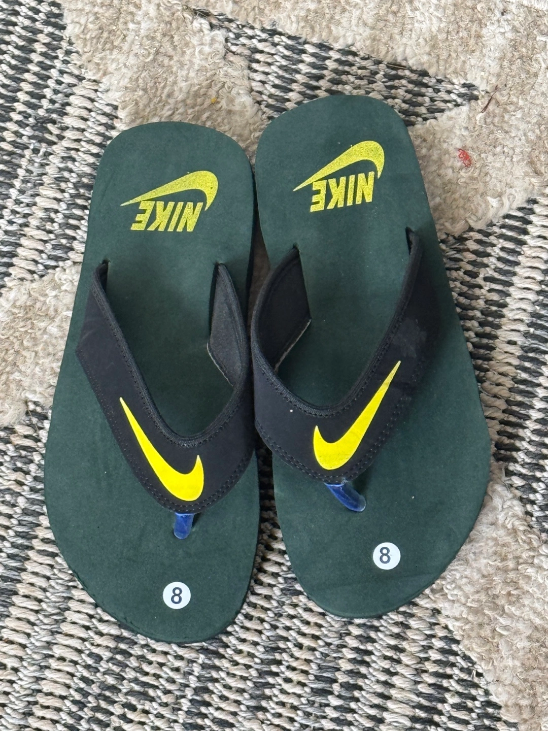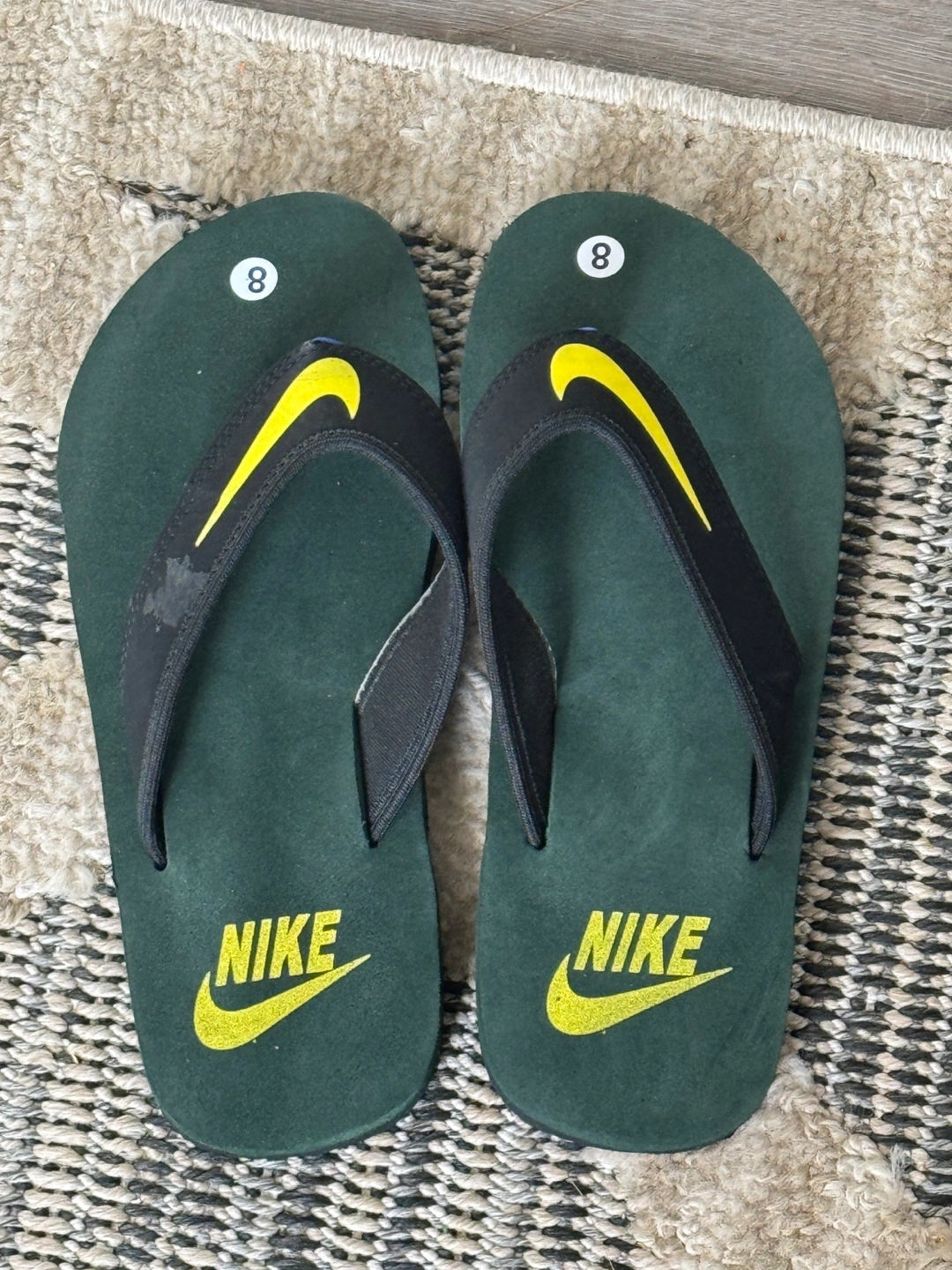 103Pair of men's size 8 Nike flip-flops. Dark green and black. Yellow Nike swoosh logo. Used condition. Available for local pickup by Schaumburg and Barrington Road in Schaumburg IL 60194 or shipping to your doorstep for one low price with tracking included for free. Comes from a virus free, smoke free and pet free home.
