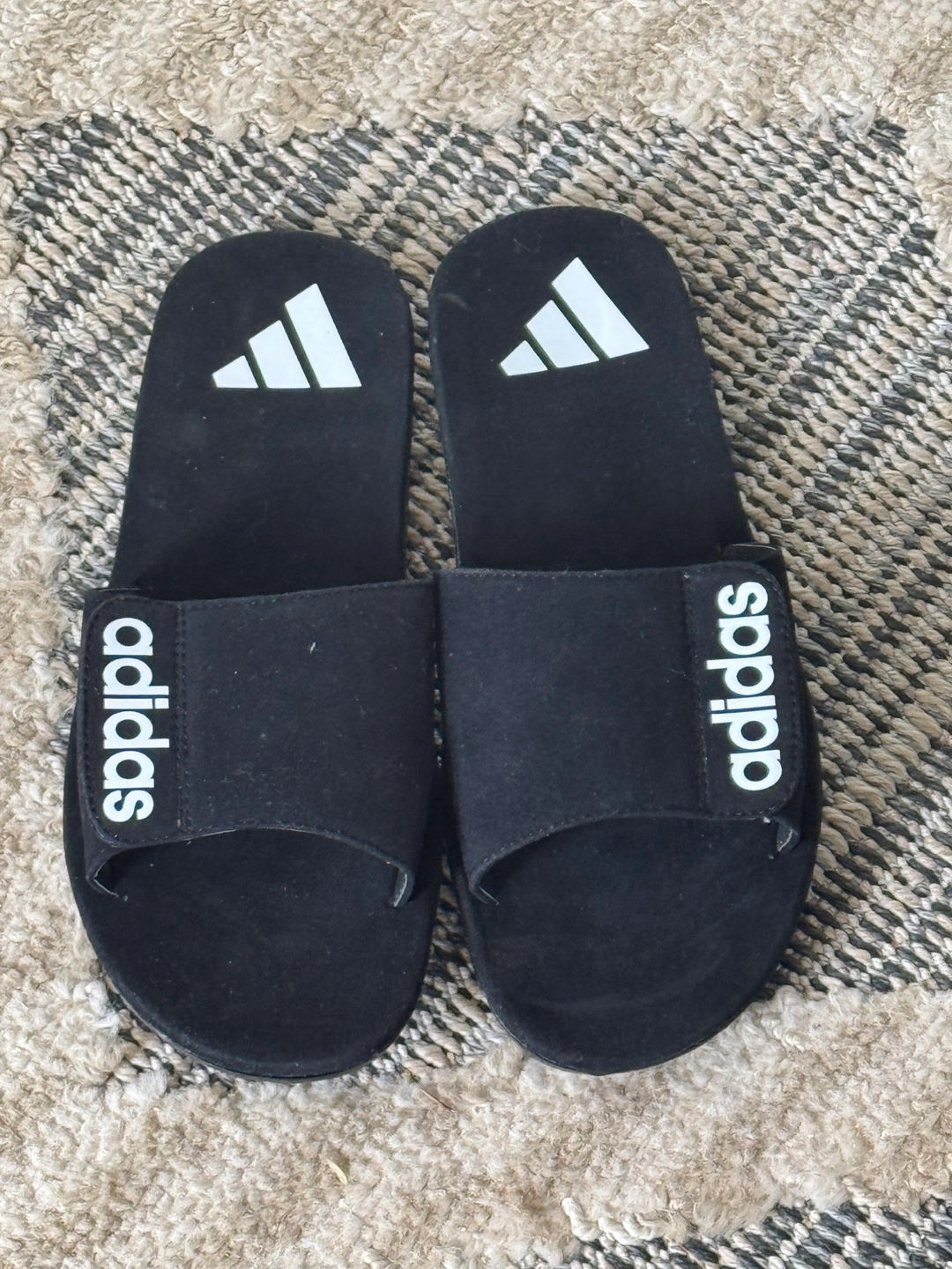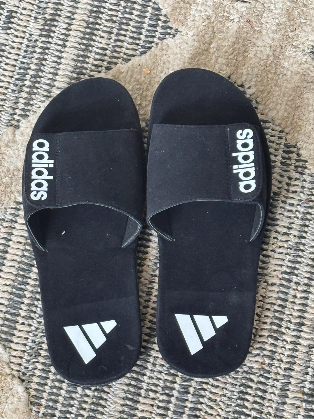 103Black Adidas slides. Comfortable and easy to wear. Good for summer. Size 9. Available for local pickup by Schaumburg and Barrington Road in Schaumburg IL 60194 or shipping to your doorstep for one low price with tracking included for free. Comes from a virus free, smoke free and pet free home.