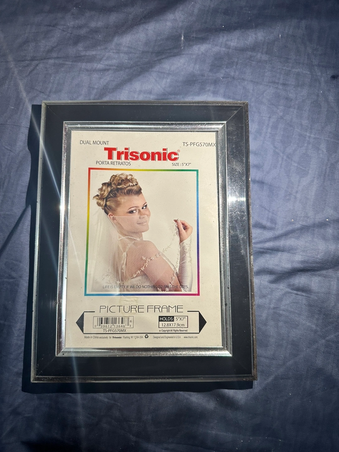 1000+Black frame with silver accents. Holds a 5x7" photo. Dual mount design. Made in China.