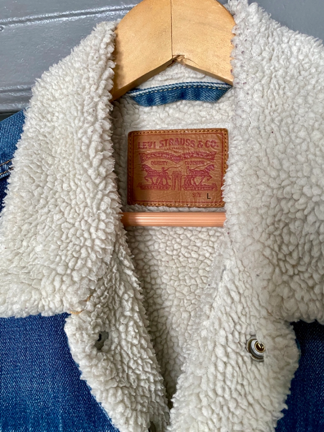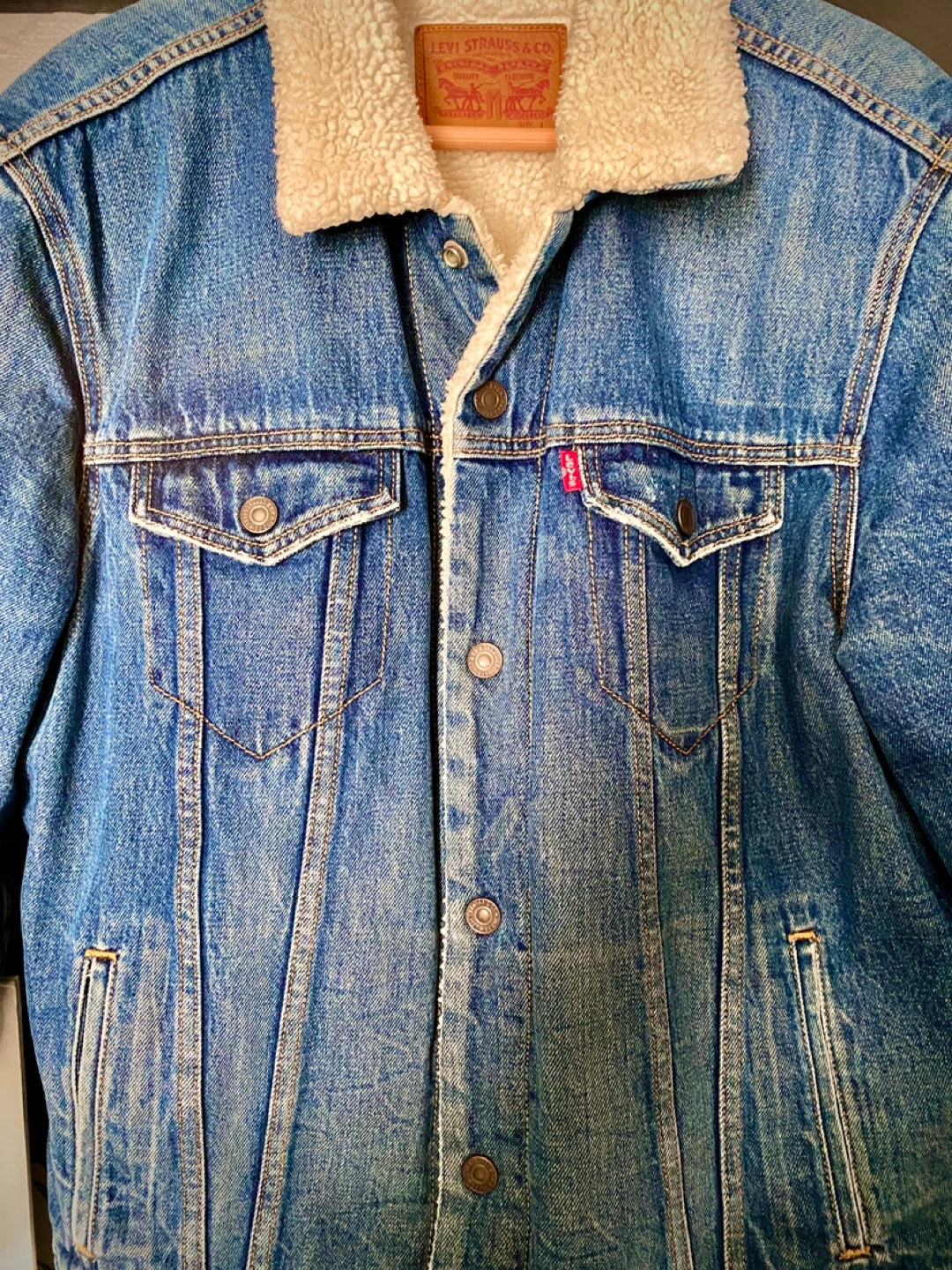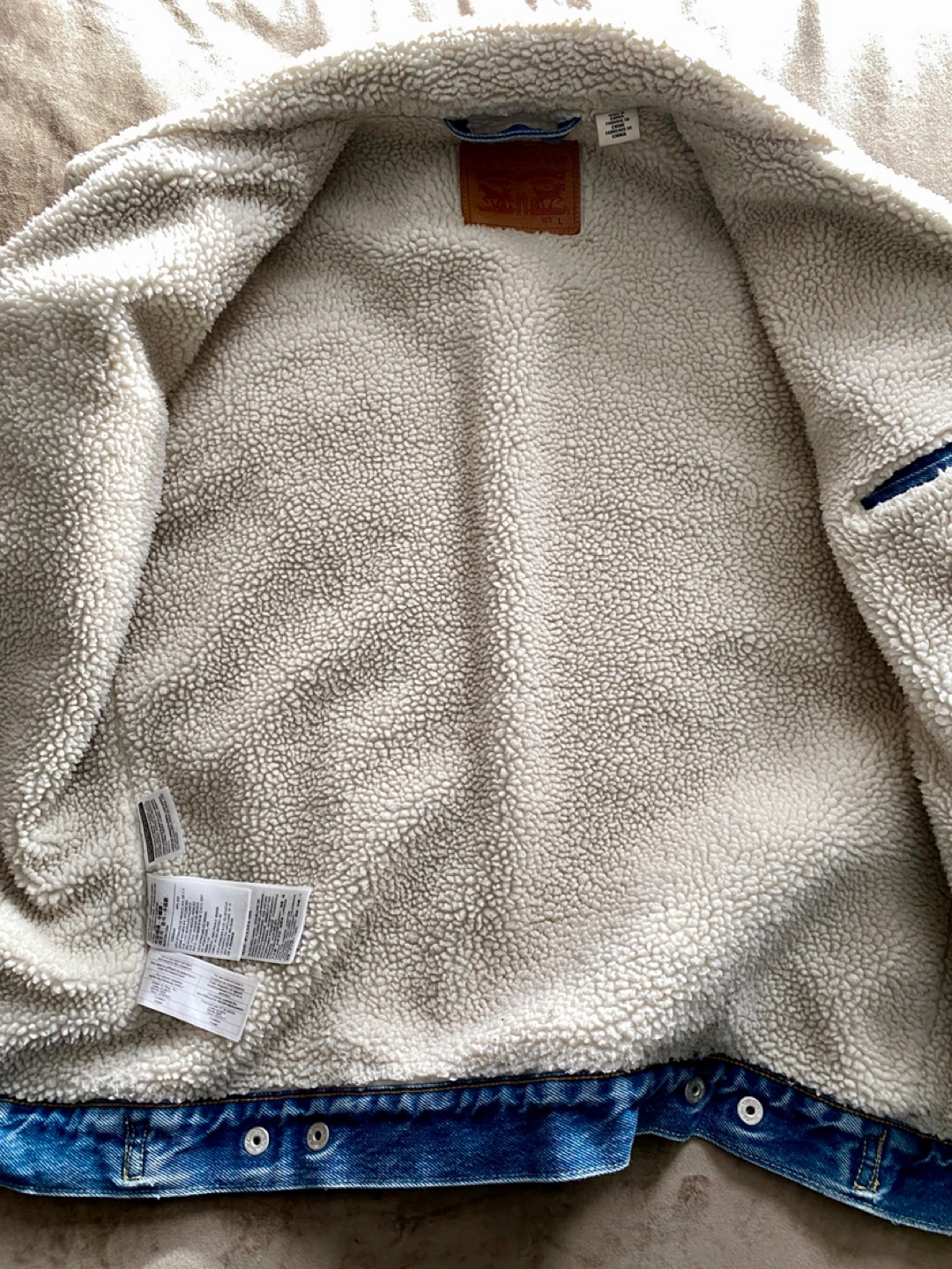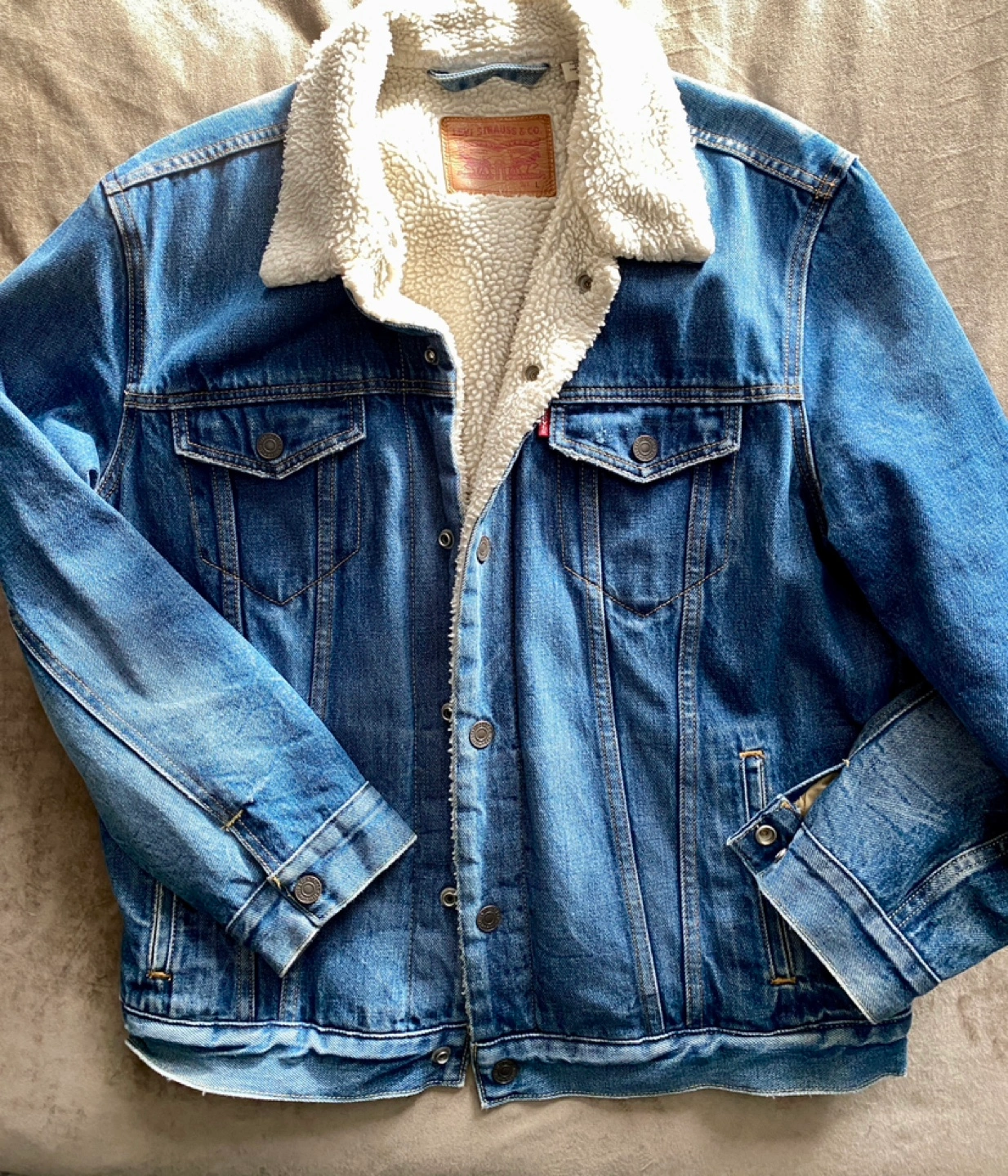 328Men's Levi's denim jacket. Features sherpa lining. Button closure. Classic style. Size Large. In great shape and clean condition. Pickup on Astoria Blvd South.