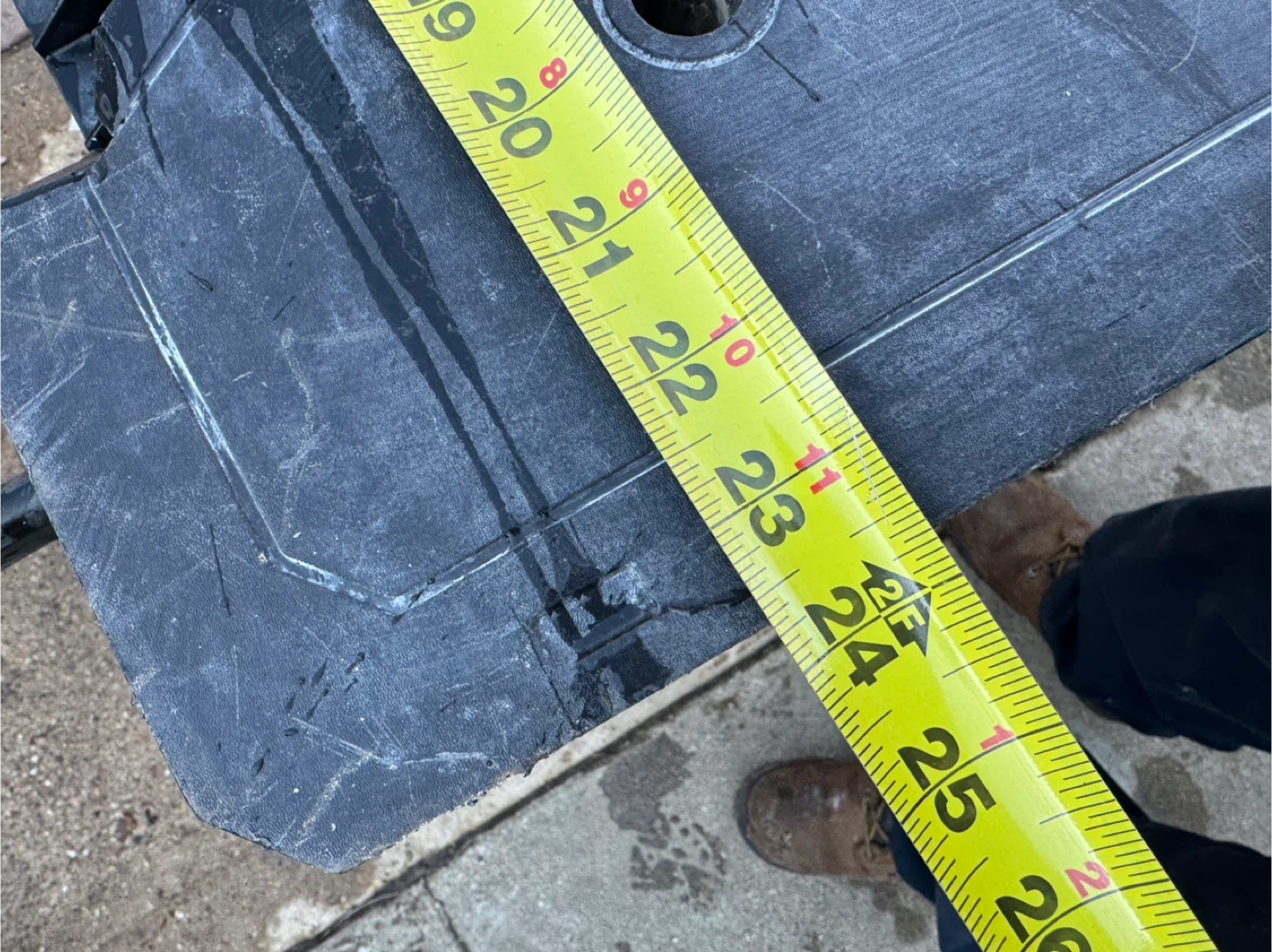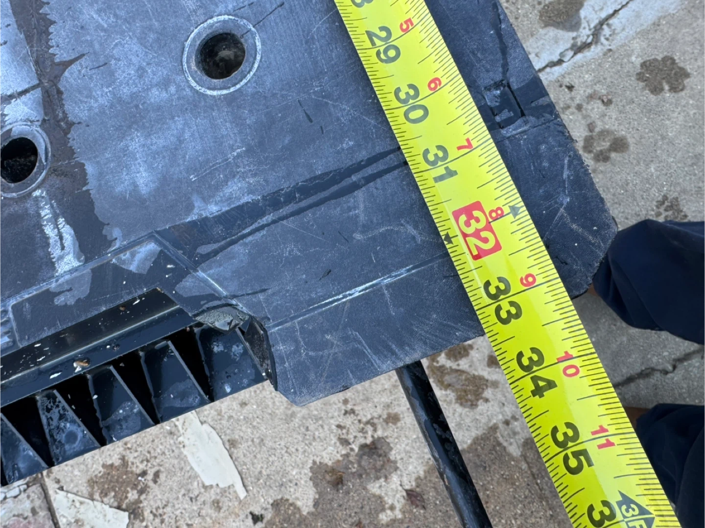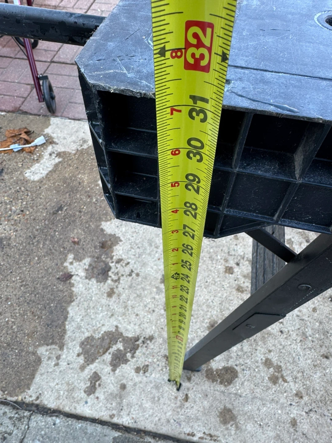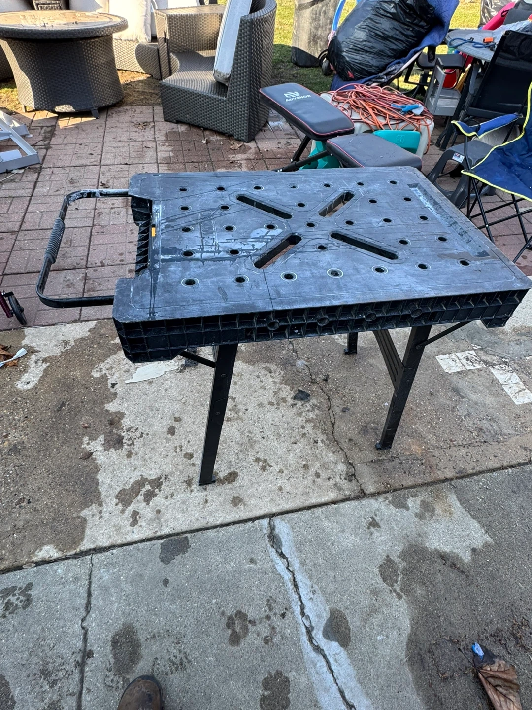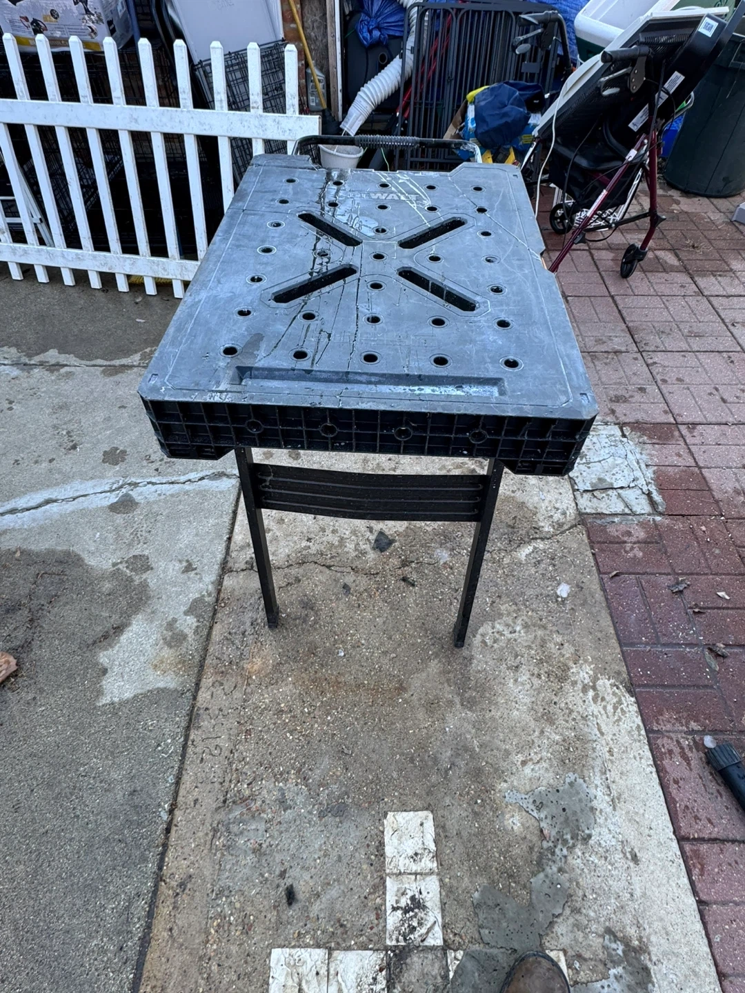 Portable folding work table with DEWALT branding. It has a black plastic surface with numerous holes and a fold-out metal handle. The approximate dimensions are 33 inches wide and 23 inches deep. It's a sturdy surface for various projects.