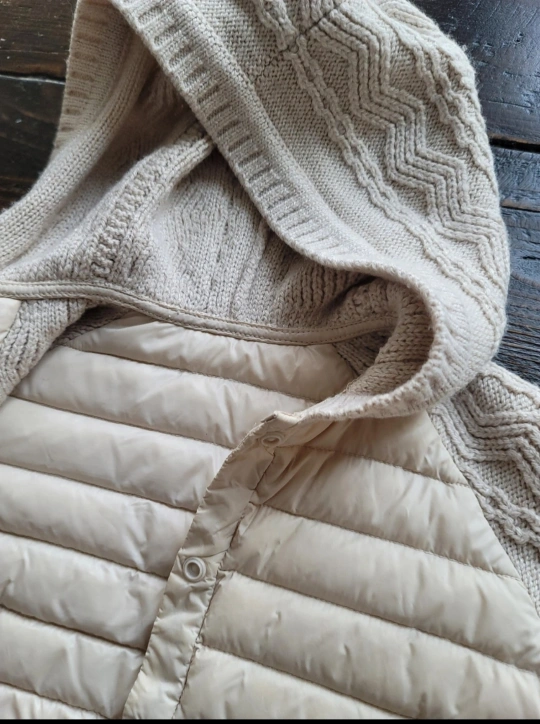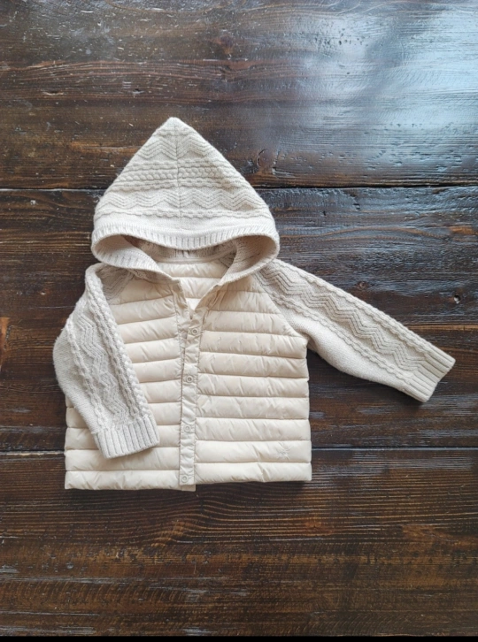 Adorable baby girl's jacket. Cream-colored, lightweight down-filled puffer with a knit hooded overlay. Snap closure. Perfect for layering. 12 months