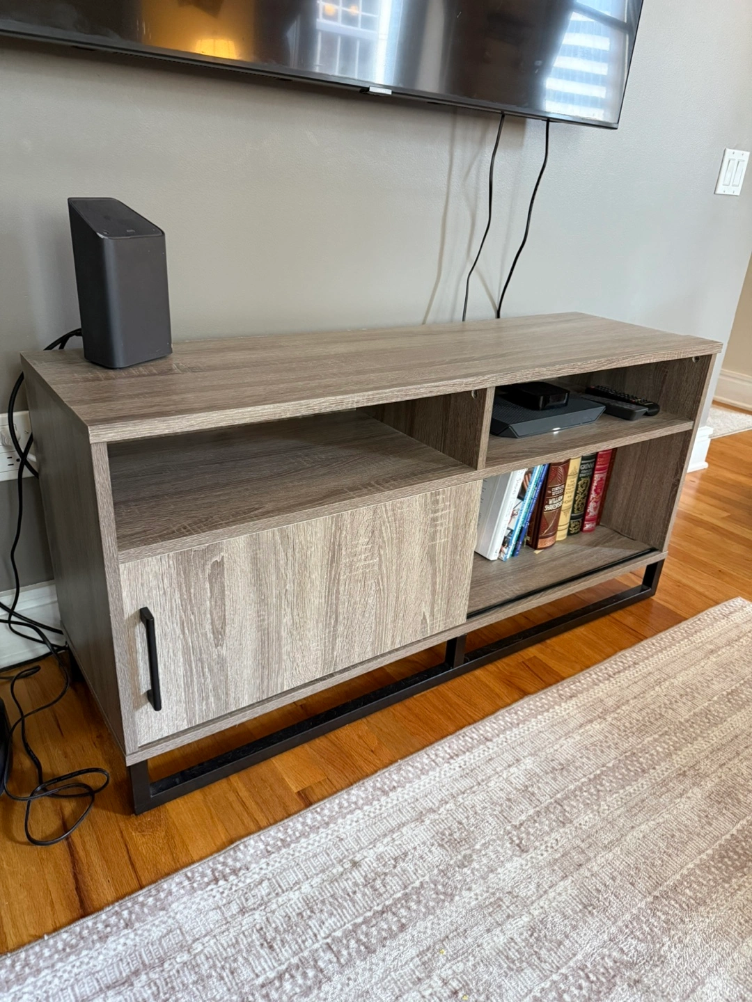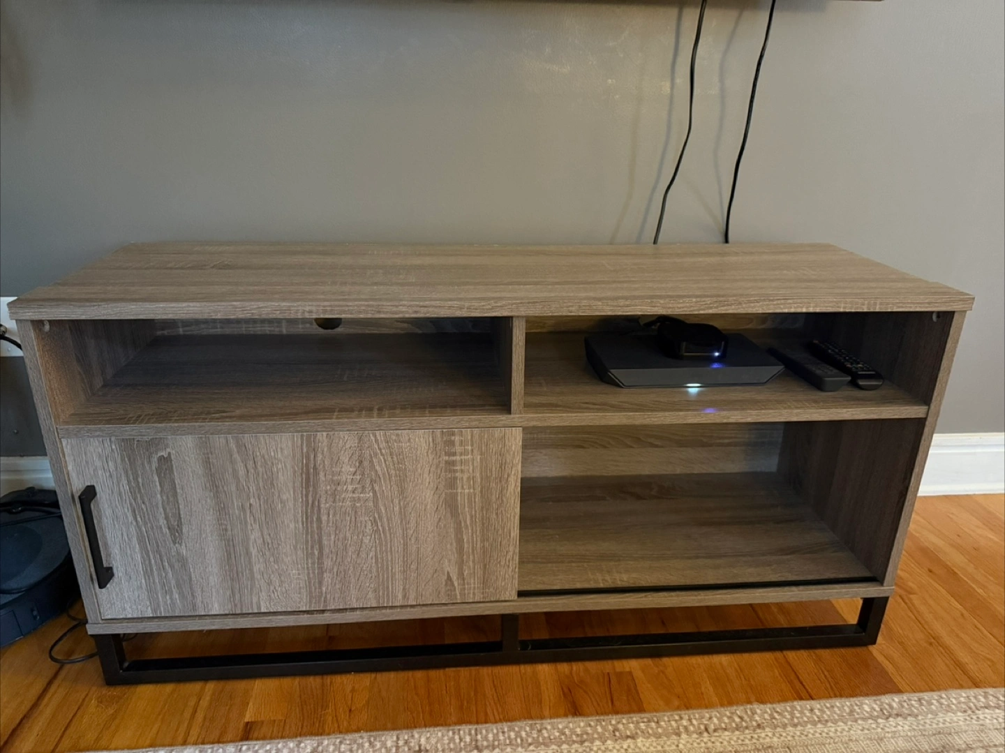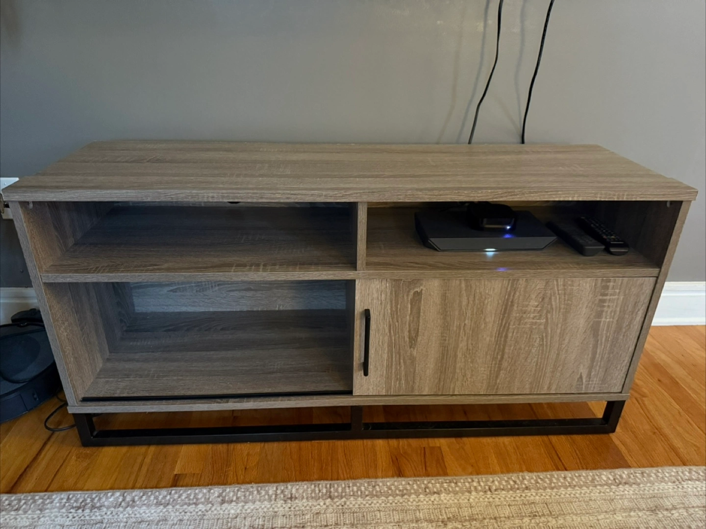 Selling a wood TV stand! It has a modern look with a light gray wood grain finish and a black metal base. There's open shelving on top and one side and a cabinet with a sliding door on the other, perfect for storage.