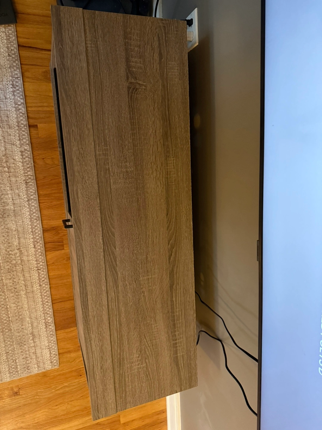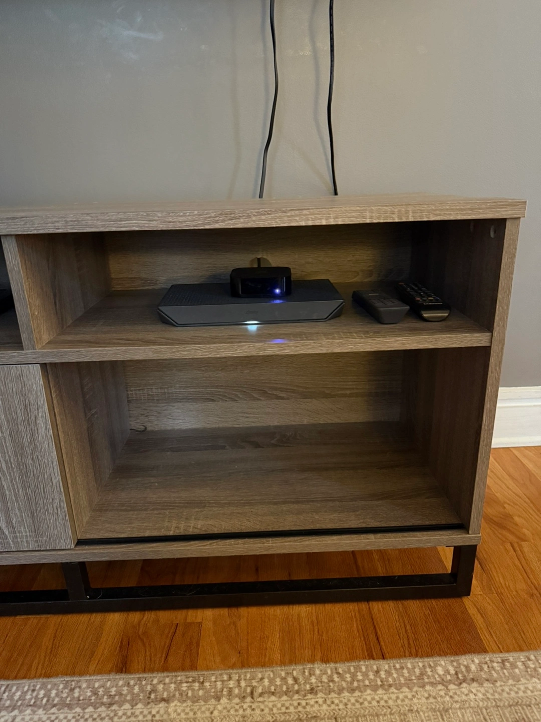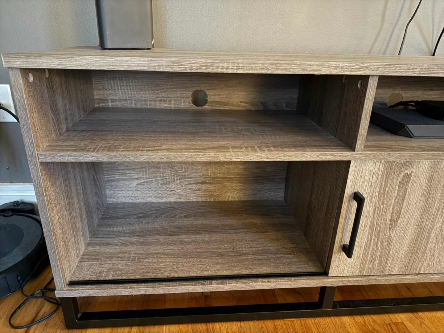 Selling a wood TV stand! It has a modern look with a light gray wood grain finish and a black metal base. There's open shelving on top and one side and a cabinet with a sliding door on the other, perfect for storage.