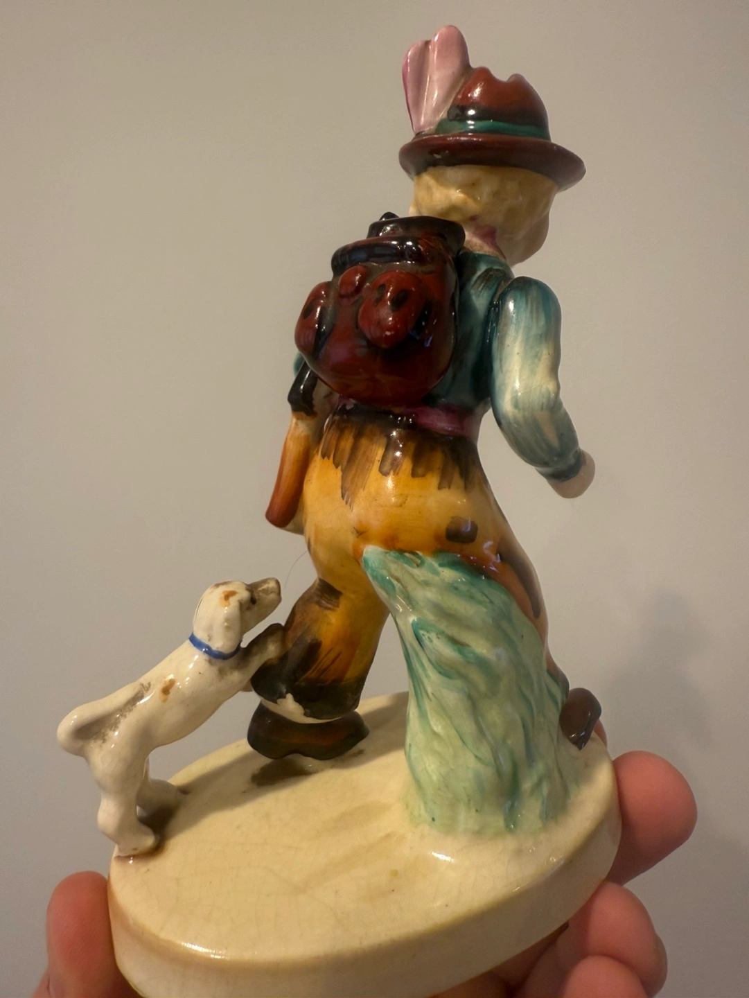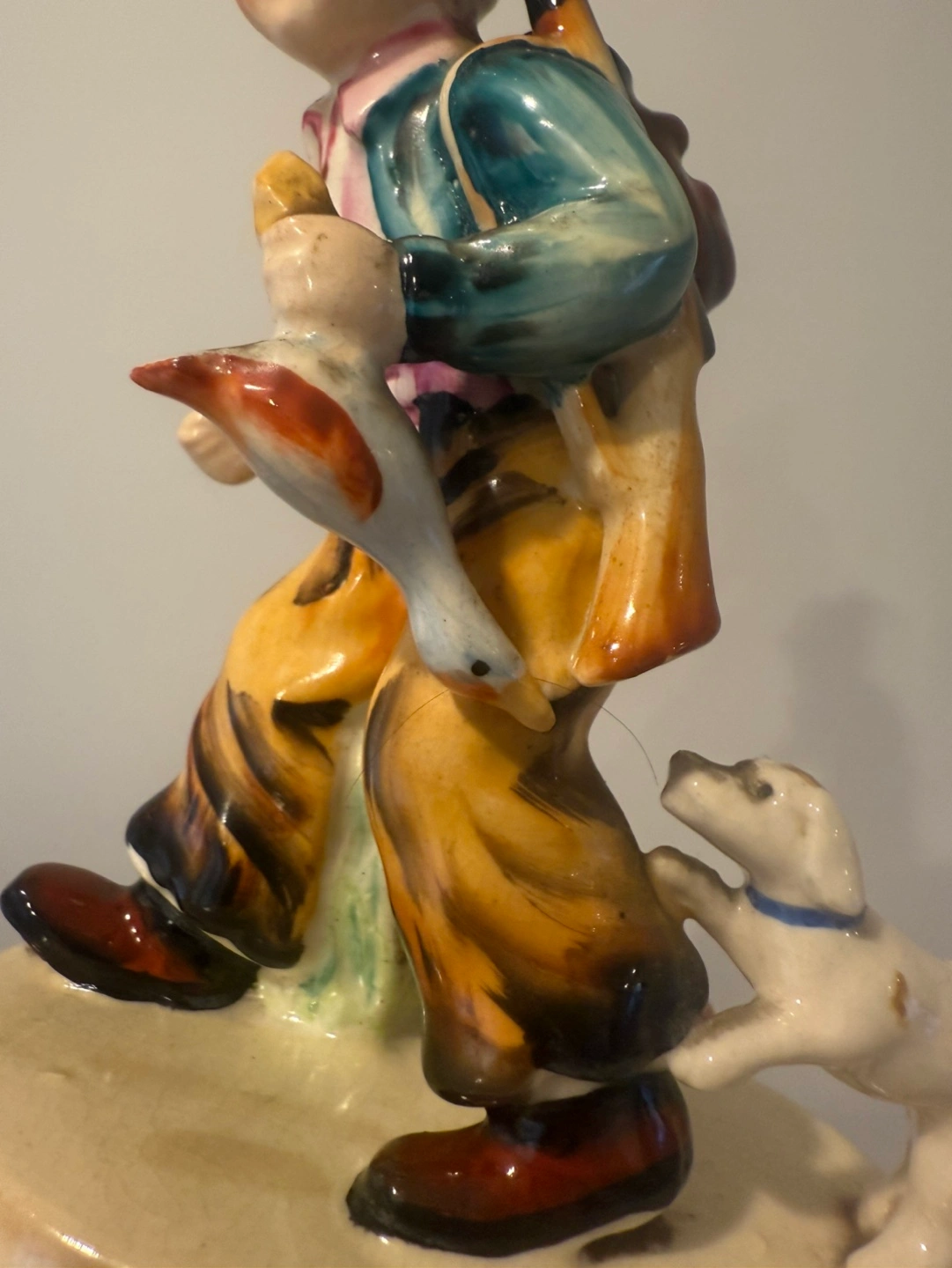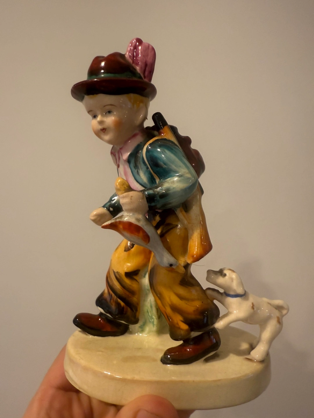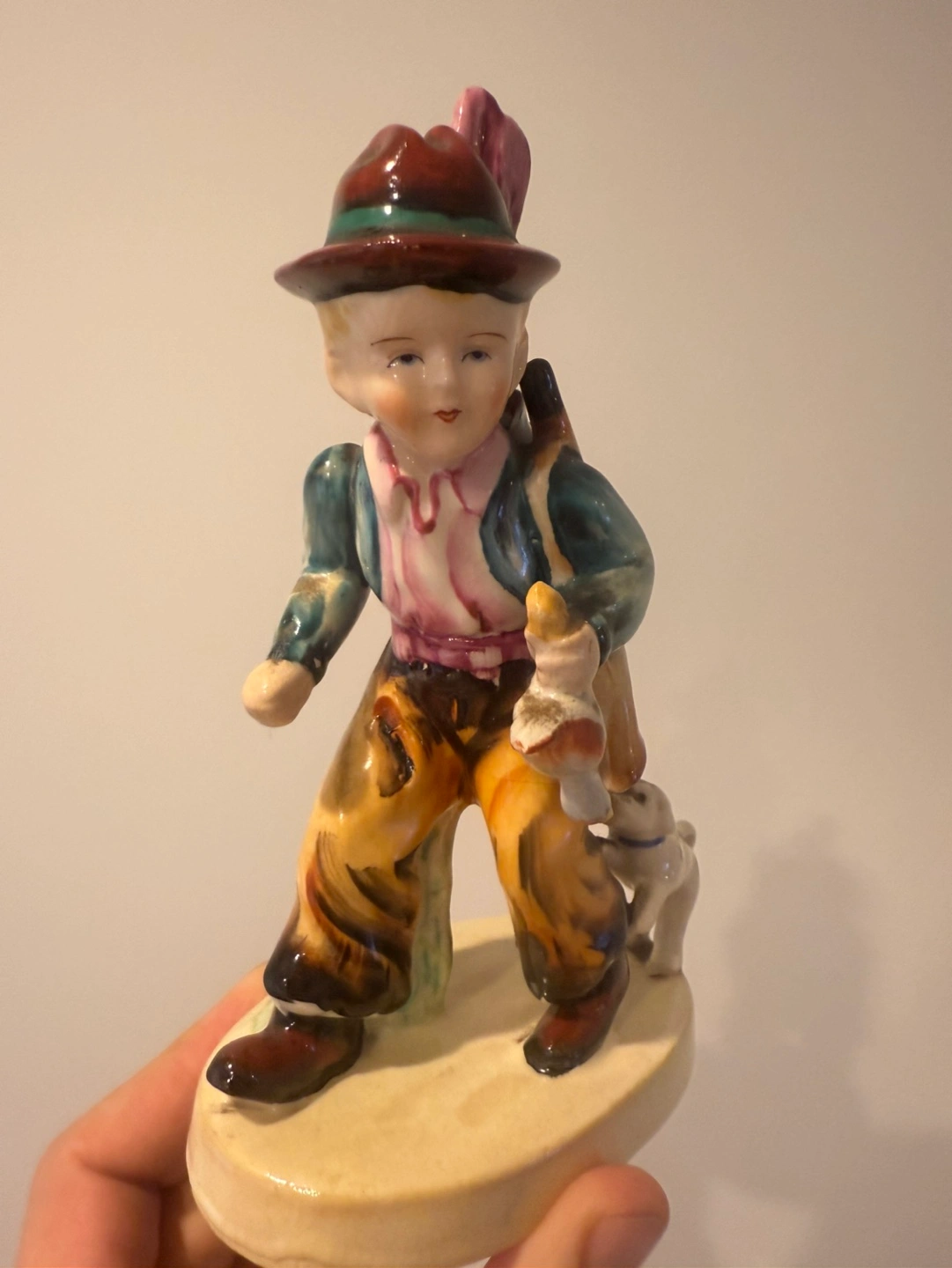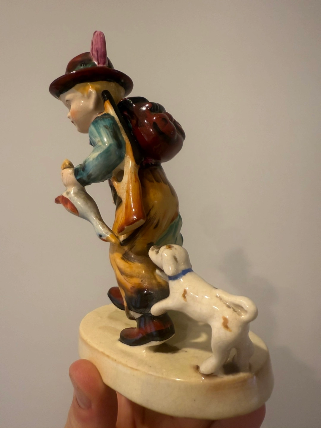 Guebel figurine Shepherd boy with dog on hunting. Vintage hand painted porcelain Hand-painted ceramic figurine. Features a boy carrying a gun and game, accompanied by a small dog. Detailed clothing and accessories. Oval base. Shows some minor wear consistent with age.