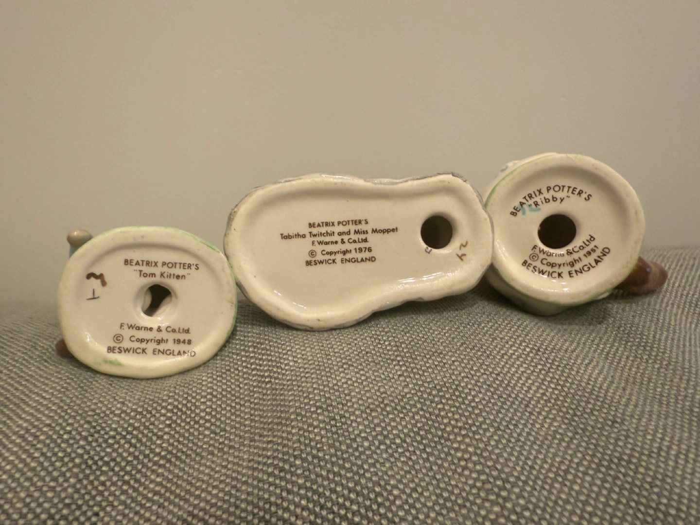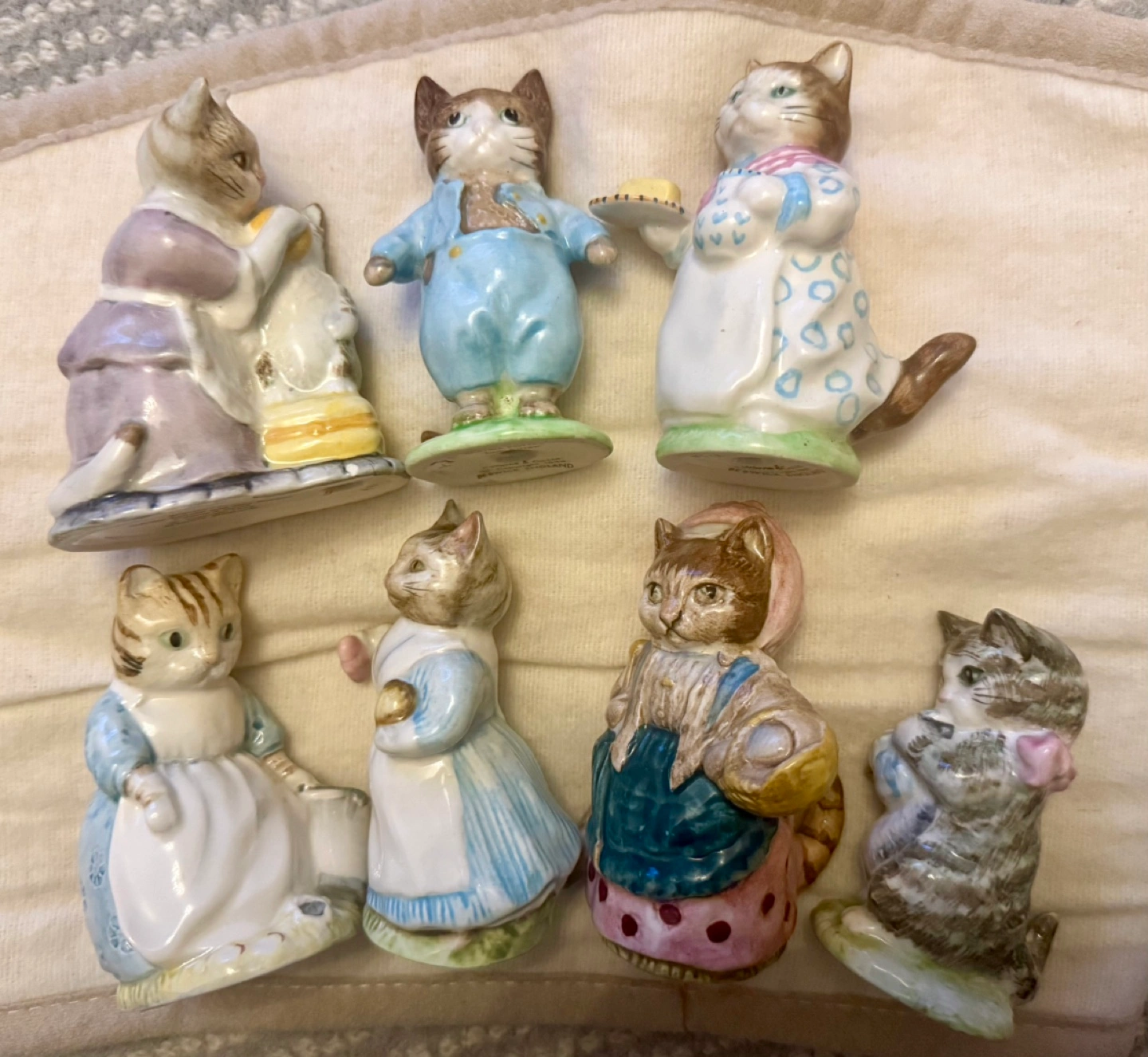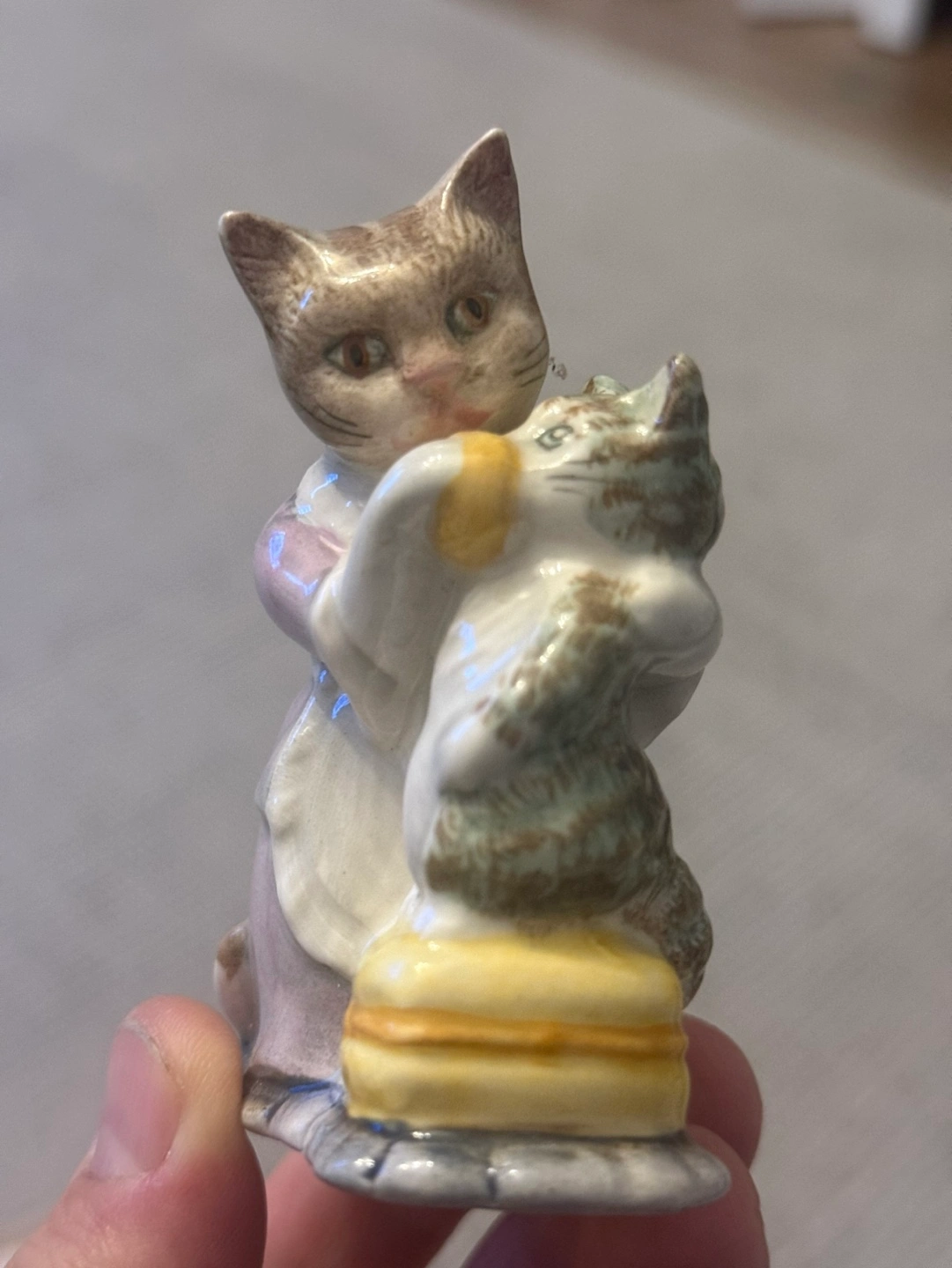 Beatrix Potter's 7 cats porcelain figurines Miss Moppet, Tabitha, Mrs Ribby, Tom, Patty Pan. Set of eight ceramic cat figurines. Adorable and charming. Collectible. Great condition. vintage In excellent condition. no chips or cracks. 1. Cat BEATRIX POTTER’S Ribby and patty pan F. Warne & Co Ltd. 1991 ©️ 1992 ROYAL ALBERT LTD with original Box. 📦 - $22 2. Cat BEATRIX POTTER’S “Tabitha Twitchett” F. Warne & Co Ltd. ©️ Copyright 1961 BESWICK ENGLAND - $22 3. Cat BEATRIX POTTER’S “Miss. Moppet” F. Warne & Co Ltd. ©️ Copyright 1954 BESWICK ENGLAND - $22 4. Cat It has the BP-6a back-stamp. BEATRIX POTTER’S Tabitha Twitchit and Miss Moppet F. Warne & Co Ltd. ©️ Copyright 1970 BESWICK ENGLAND - $24 5. Cat BEATRIX POTTER’S “Cousin Ribby” F. Warne & Co Ltd. ©️ Copyright 1976 BESWICK ENGLAND - $22 6. Cat BEATRIX POTTER’S “Tom Kitten” 🐈⬛ F. Warne & Co Ltd. ©️ Copyright 1948 BESWICK ENGLAND - $22 7. Cat BEATRIX POTTER’S “Ribby” F. Warne & Co Ltd. ©️ Copyright 1951 BESWICK ENGLAND - $22 For each 1 piece - $22 All set 7 figurines with discount, for $105 You can pickup 🛻 in NewYork, Brooklyn or I can mail, to another city, state. Let me know if you are interested.k