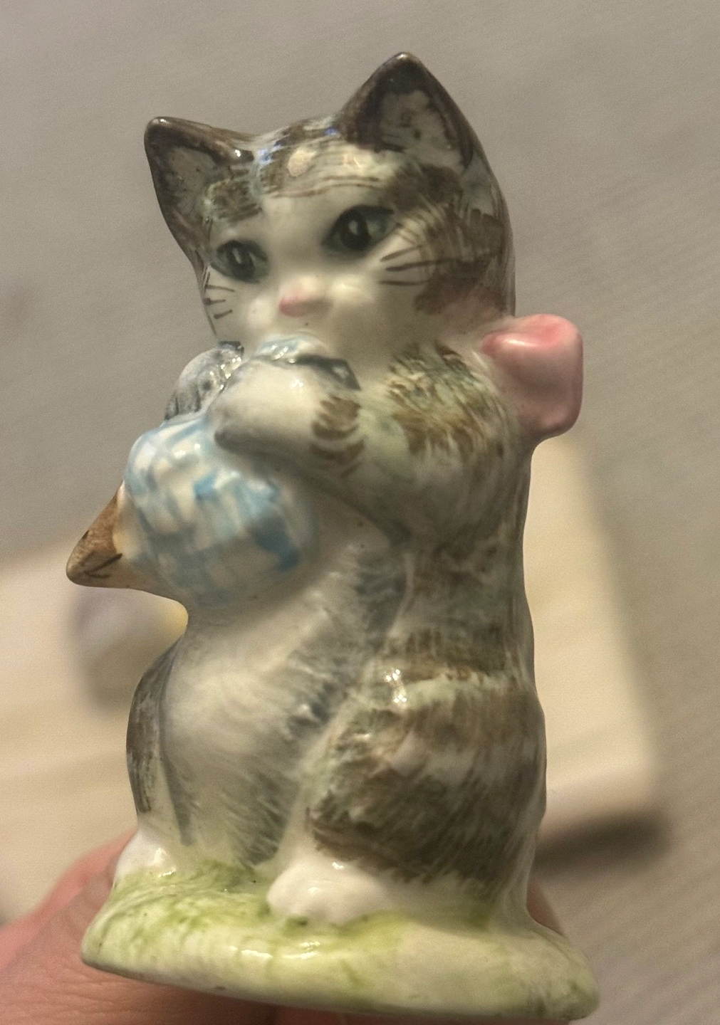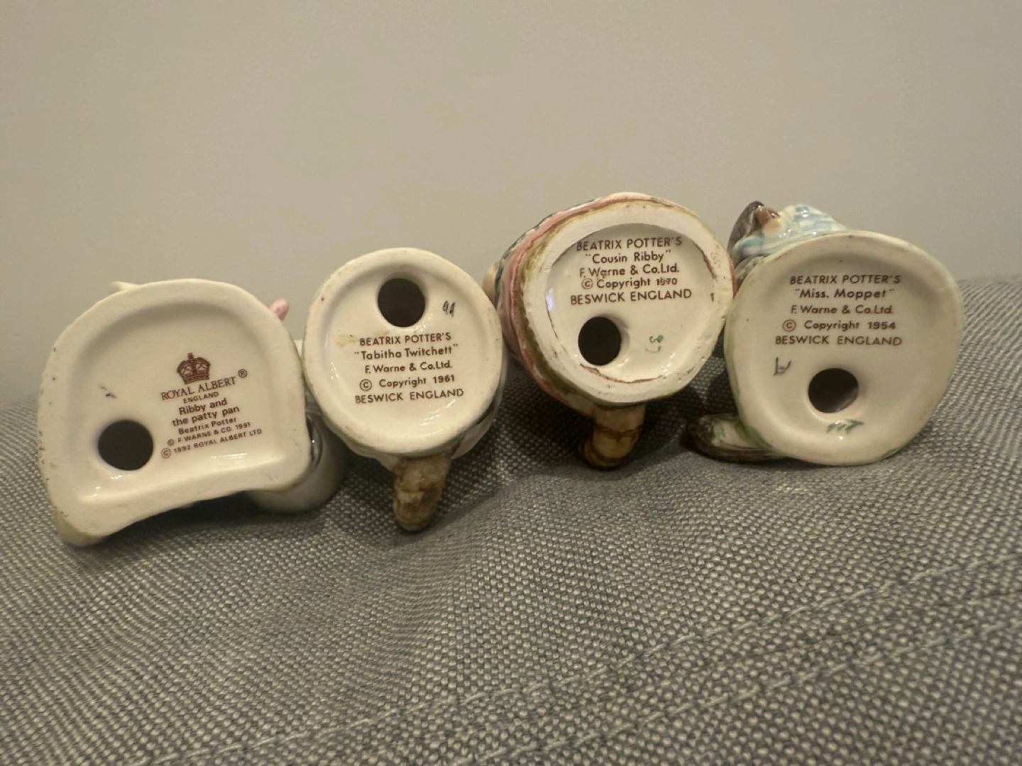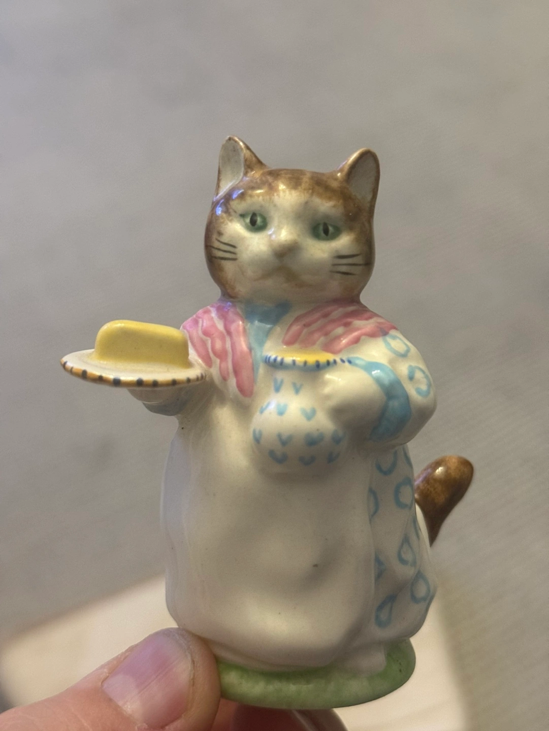 Beatrix Potter's 7 cats porcelain figurines Miss Moppet, Tabitha, Mrs Ribby, Tom, Patty Pan. Set of eight ceramic cat figurines. Adorable and charming. Collectible. Great condition. vintage In excellent condition. no chips or cracks. 1. Cat BEATRIX POTTER’S Ribby and patty pan F. Warne & Co Ltd. 1991 ©️ 1992 ROYAL ALBERT LTD with original Box. 📦 - $22 2. Cat BEATRIX POTTER’S “Tabitha Twitchett” F. Warne & Co Ltd. ©️ Copyright 1961 BESWICK ENGLAND - $22 3. Cat BEATRIX POTTER’S “Miss. Moppet” F. Warne & Co Ltd. ©️ Copyright 1954 BESWICK ENGLAND - $22 4. Cat It has the BP-6a back-stamp. BEATRIX POTTER’S Tabitha Twitchit and Miss Moppet F. Warne & Co Ltd. ©️ Copyright 1970 BESWICK ENGLAND - $24 5. Cat BEATRIX POTTER’S “Cousin Ribby” F. Warne & Co Ltd. ©️ Copyright 1976 BESWICK ENGLAND - $22 6. Cat BEATRIX POTTER’S “Tom Kitten” 🐈⬛ F. Warne & Co Ltd. ©️ Copyright 1948 BESWICK ENGLAND - $22 7. Cat BEATRIX POTTER’S “Ribby” F. Warne & Co Ltd. ©️ Copyright 1951 BESWICK ENGLAND - $22 For each 1 piece - $22 All set 7 figurines with discount, for $105 You can pickup 🛻 in NewYork, Brooklyn or I can mail, to another city, state. Let me know if you are interested.k