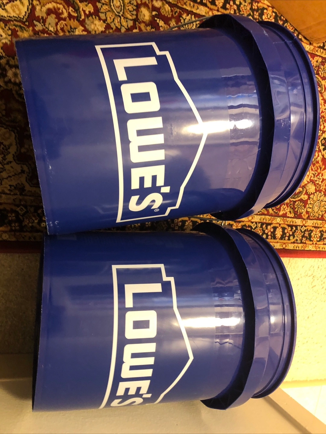 30Pair of blue plastic 5-gallon buckets. Lowe's logo. Great for storage or DIY projects. Still new, good condition.