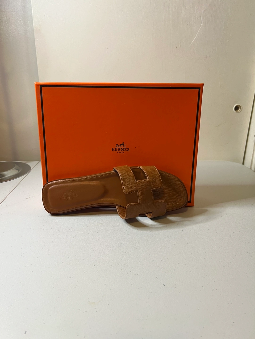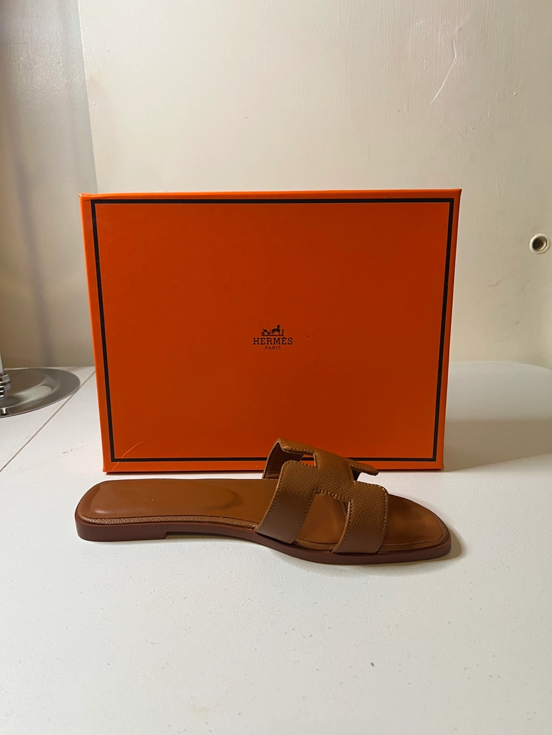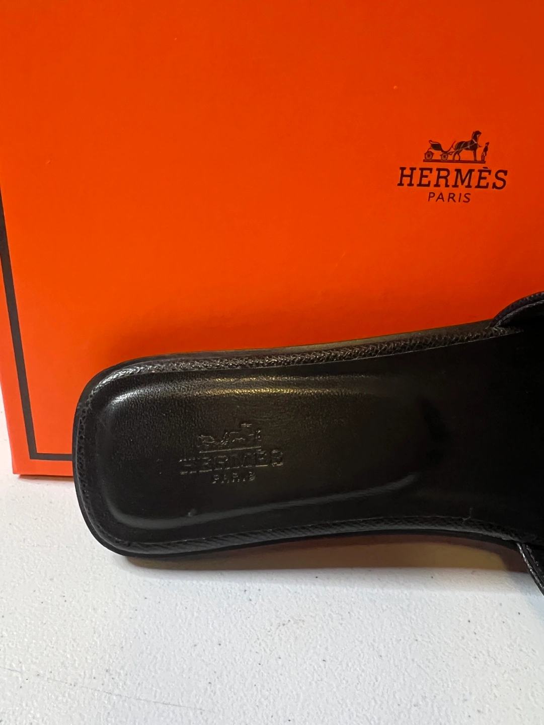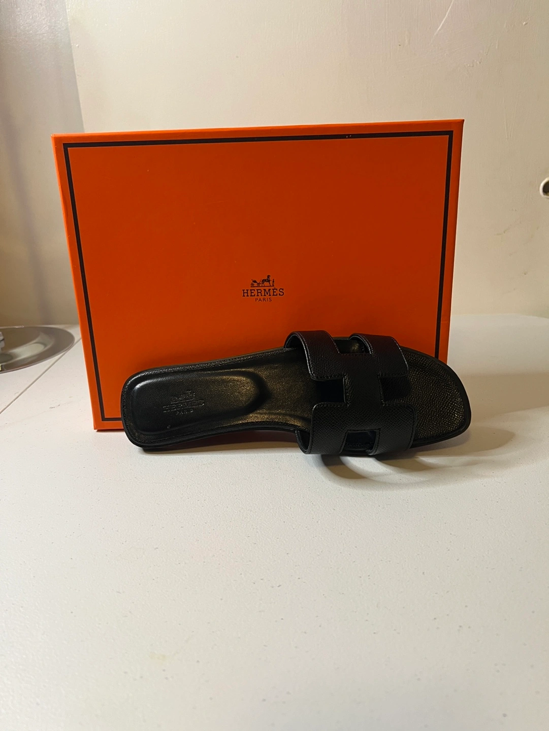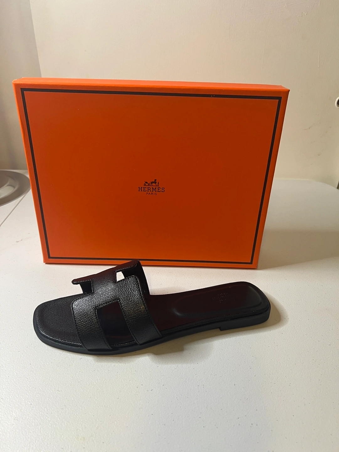 105Hermes Oran inspired sandals. Three pairs available: two black, one brown. Flat sandals. Leather. Come with original box. Black pair, are size 8, 9 and the brown are a size 8
