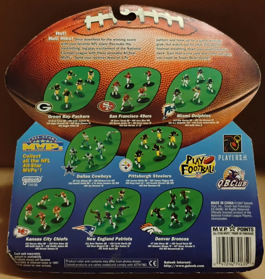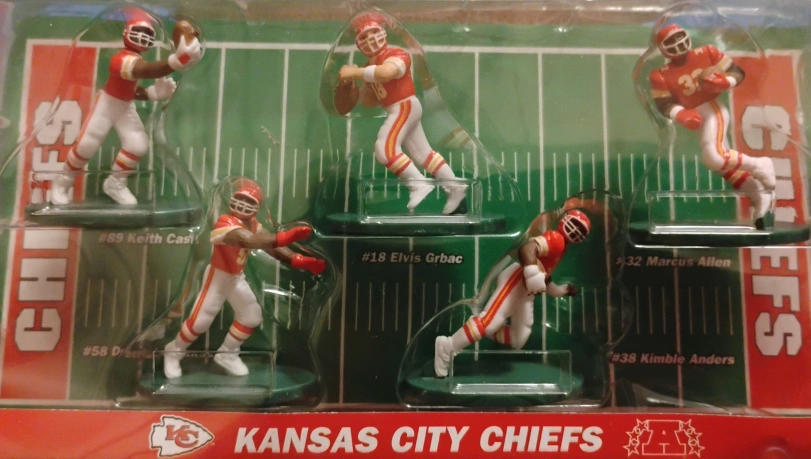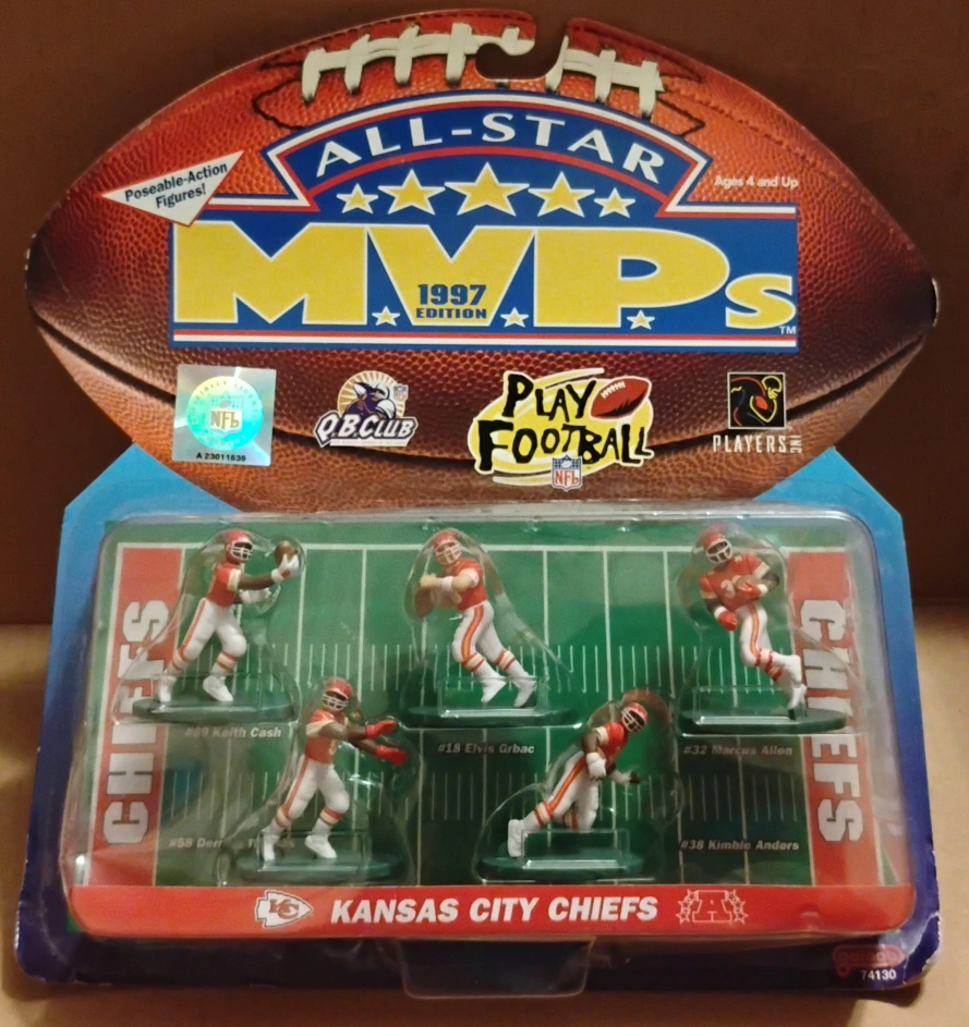 67Set of five posable Kansas City Chiefs football players. Includes Keith Cash, Elvis Grbac, Marcus Allen, and Kimble Anders. 1997 All-Star MVPs edition. Sealed in original packaging. Cash and Meet up only😃