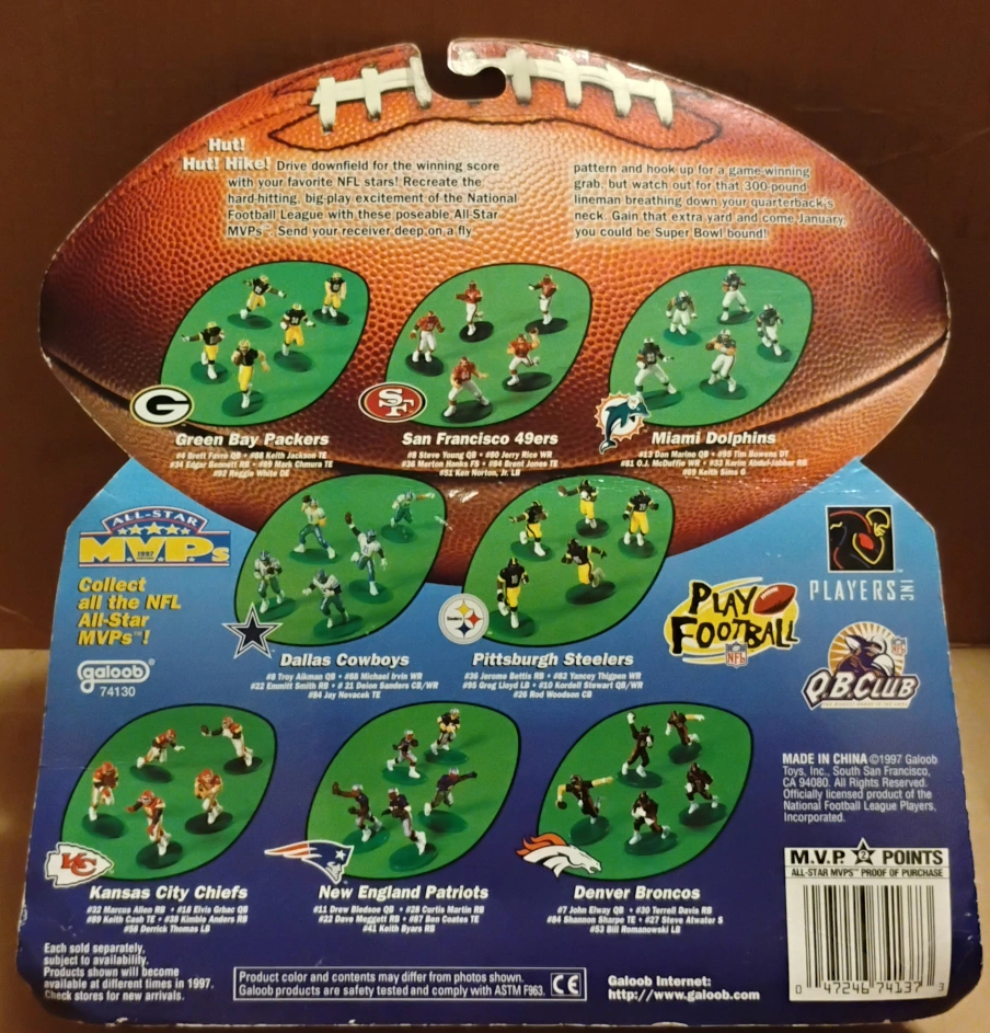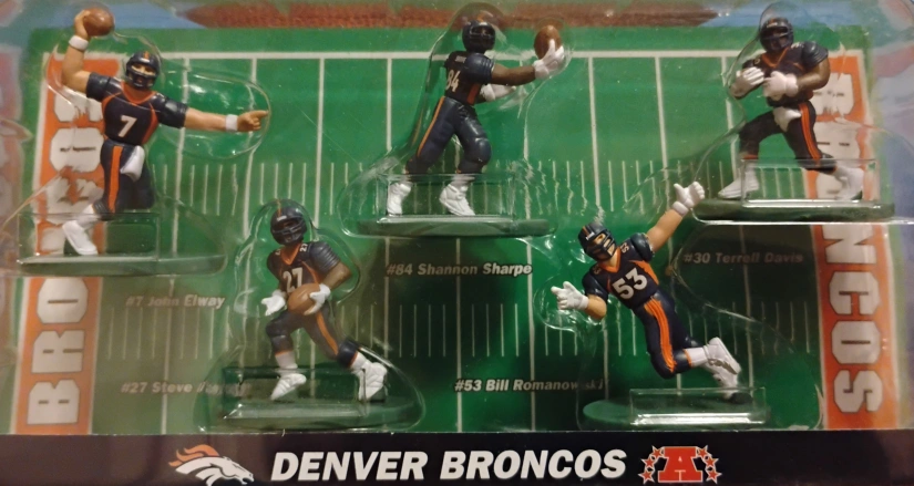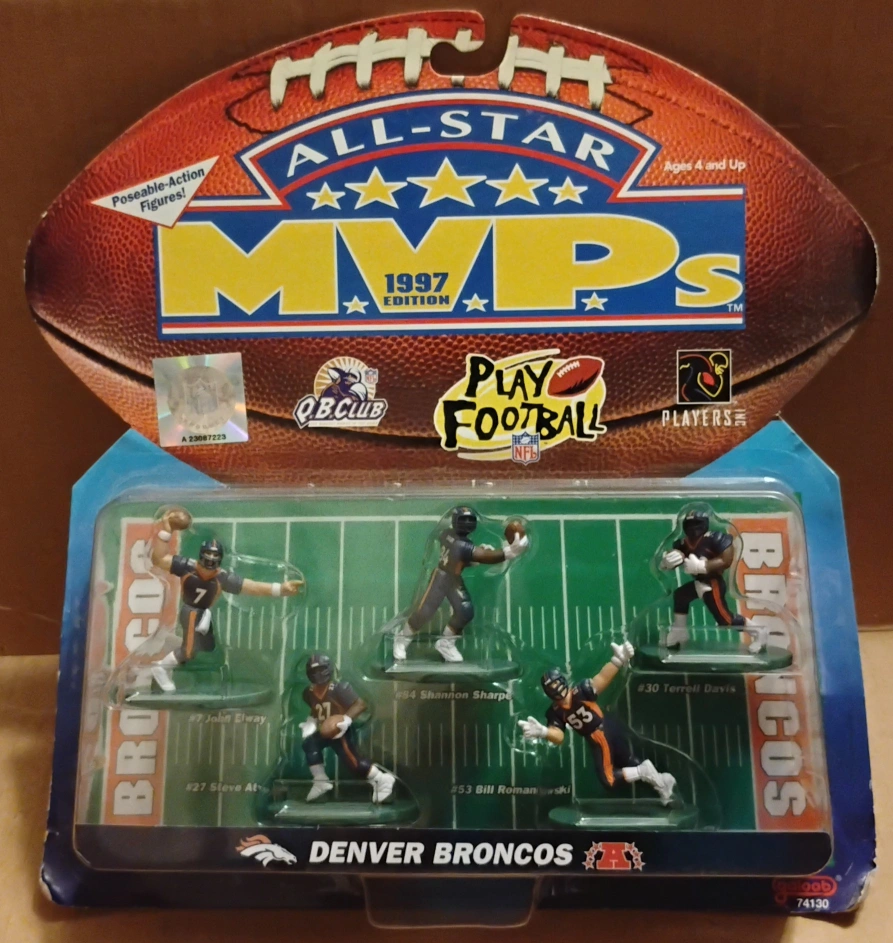 67Collectible 1997 Galoob All-Star MVPs Denver Broncos Play Football figures. Posable-action figures. Includes John Elway, Shannon Sharpe, Bill Romanowski, and Terrell Davis. Mint condition in original packaging. Cash and Meet up only😃