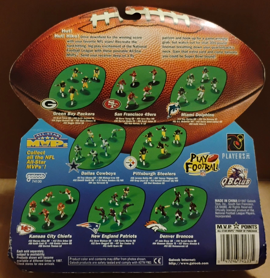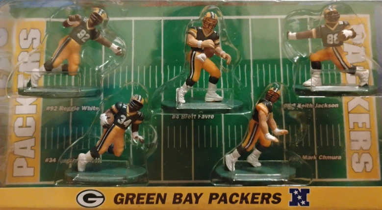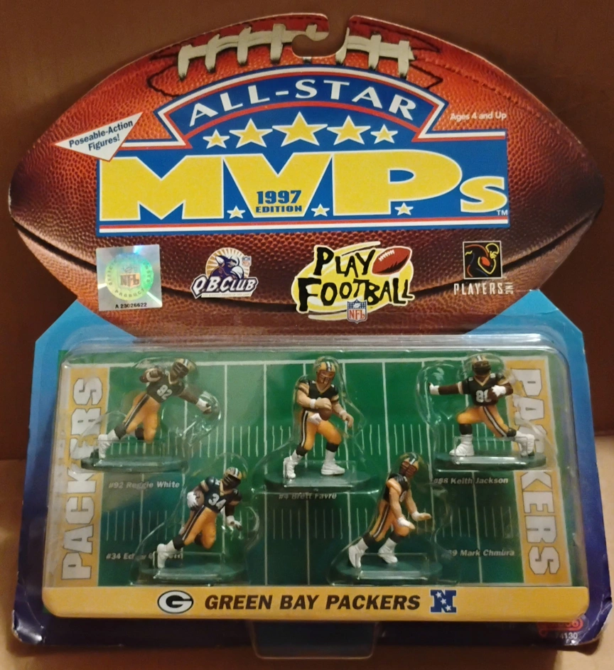 67Collectible Green Bay Packers football player figurines. Five players included: Reggie White, Brett Favre, Keith Jackson, and Mark Chmura. Part of the 1997 All-Star MVPs Play Football series by Galoob. Cash and Meet up only😃