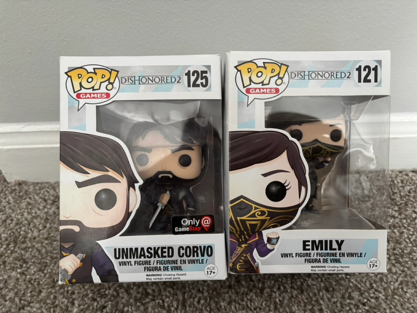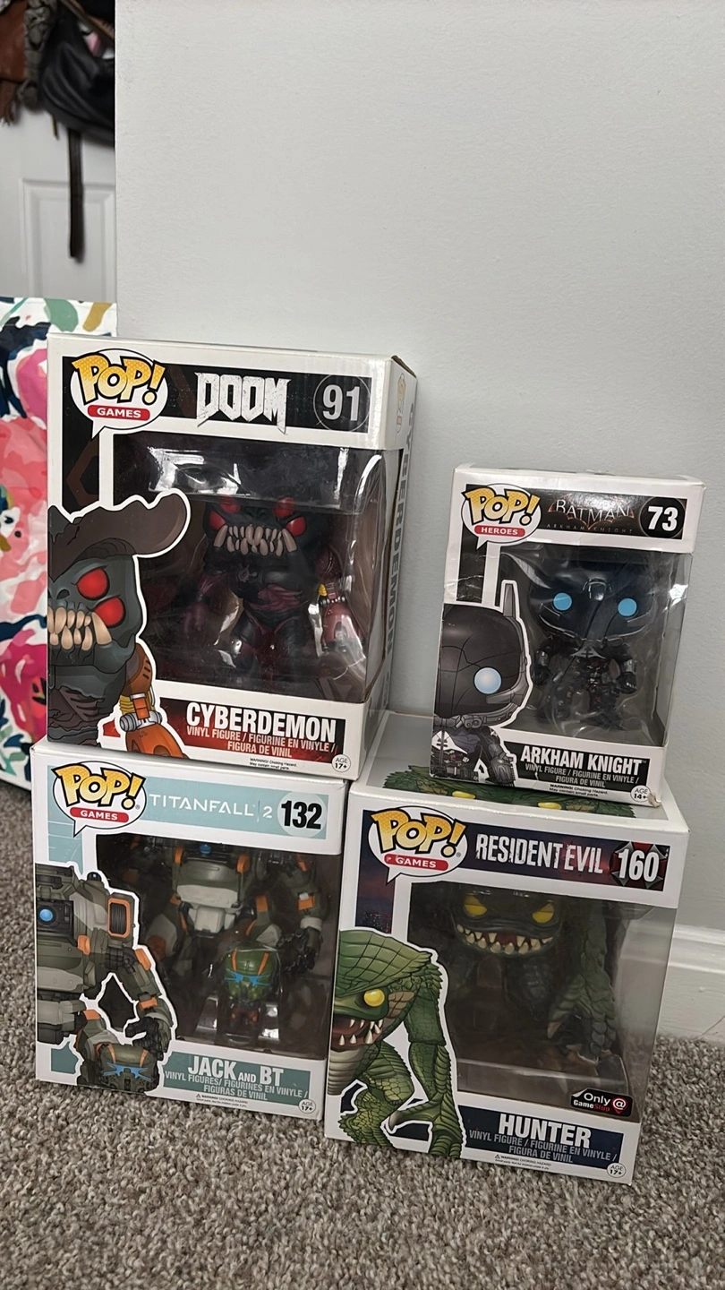 Six Funko Pop! Games vinyl figures. Includes Dishonored 2 Corvo and Emily, Doom Cyberdemon, Batman Arkham Knight, Titanfall 2 Jack and BT, and Resident Evil Hunter. All new in box. $30 for each or $55 for both cash only