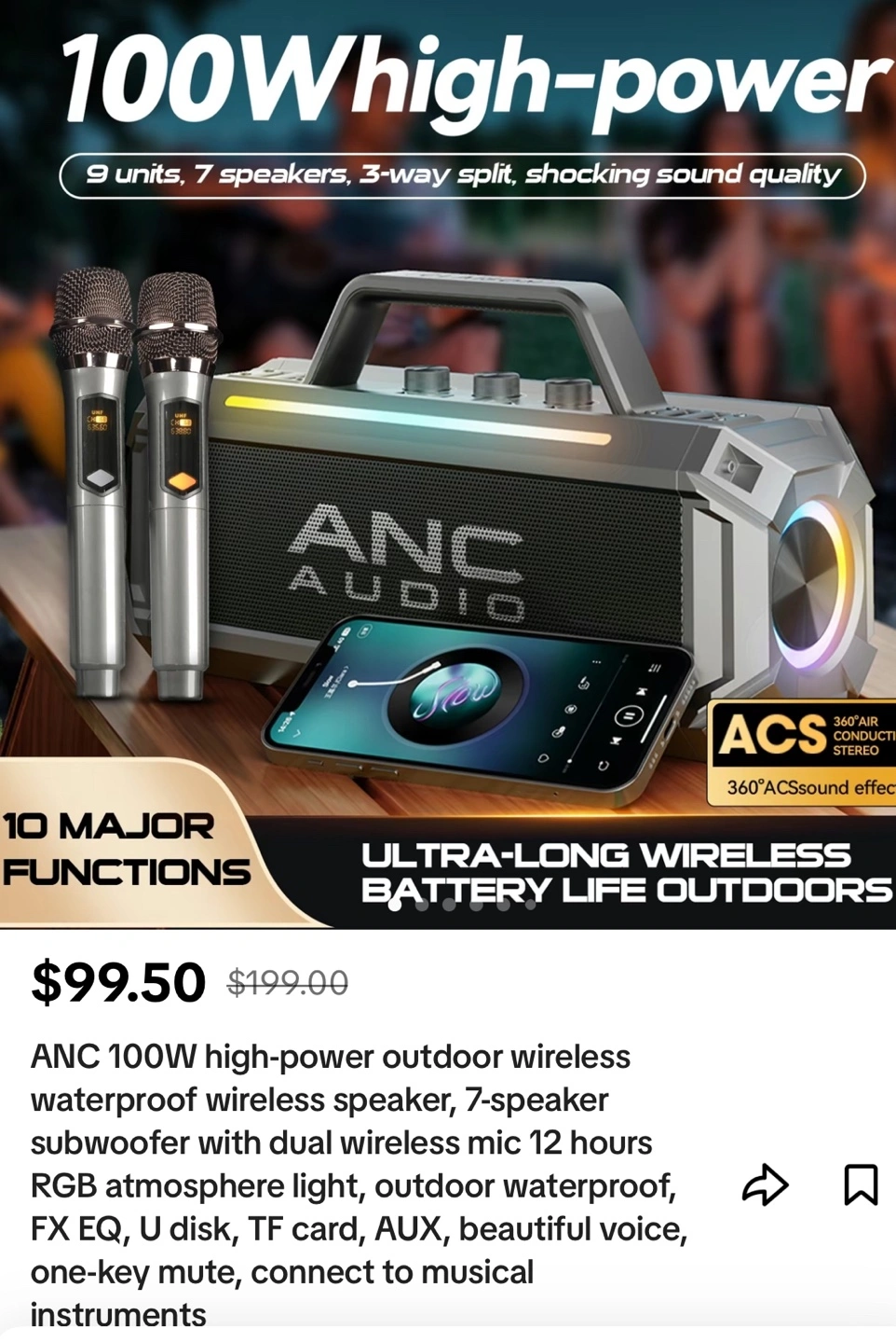 100W high-power outdoor wireless waterproof speaker. 7-speaker subwoofer with dual wireless mics. 12-hour battery life. RGB lighting. Outdoor waterproof. FX EQ, U disk, TF card, AUX input. One-key mute. Connects to musical instruments.
