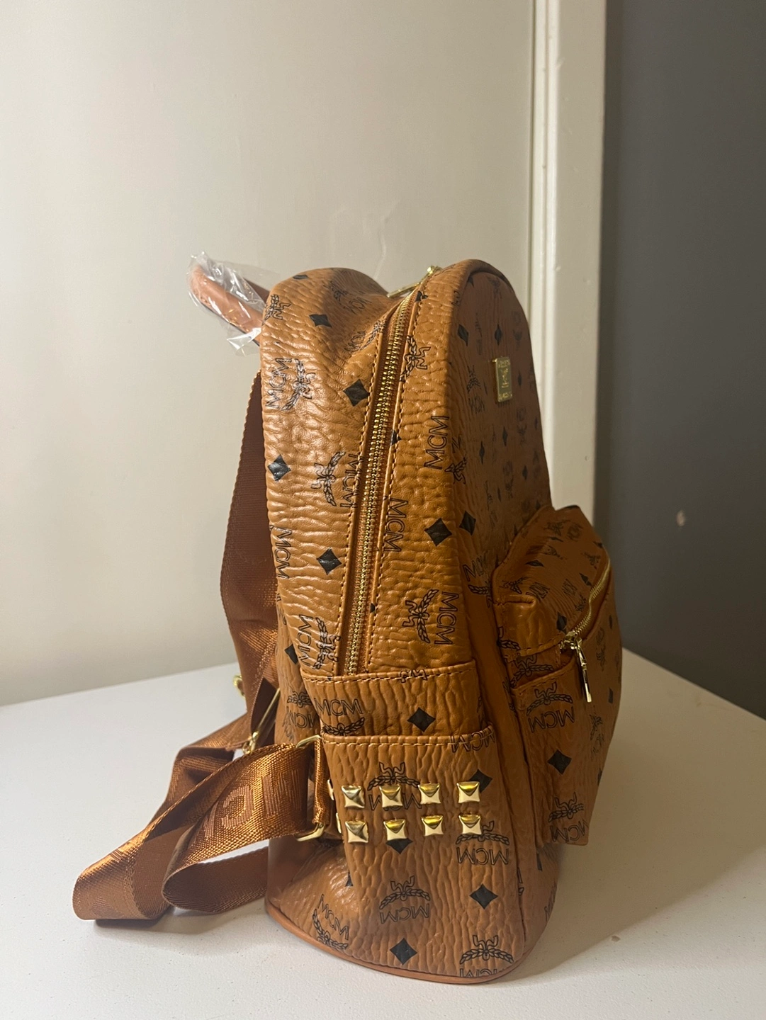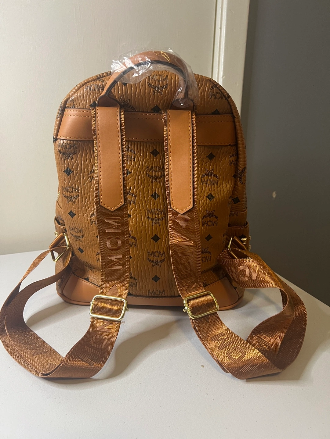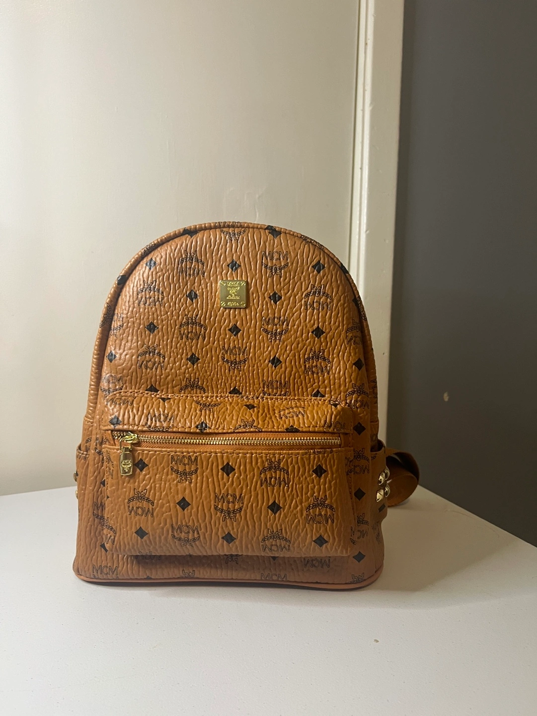 105Medium backpack. Brown leather. MCM logo print all over. Gold hardware. Adjustable straps. Small front pocket.