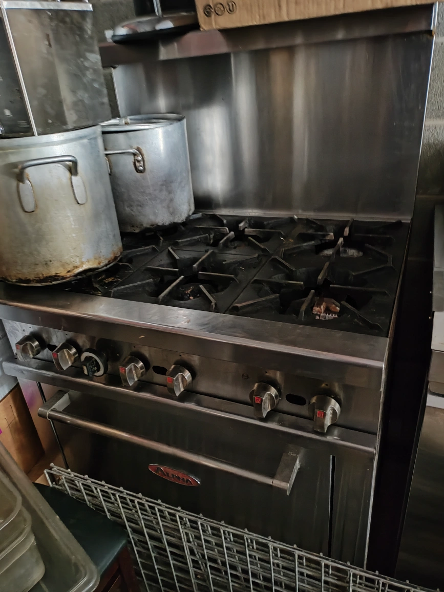 Six burner gas stove. it does have an oven but the oven doesn't work. There is a part that needs to be replaced. (if I remember correctly it needs a gas valve) 2-3 years old. Used commercial kitchen equipment. Stainless steel. Located in storage unit in River Grove.