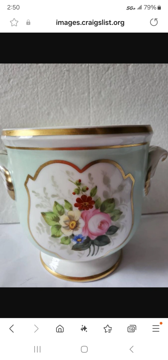 97BEAUTIFUL VINTAGE PORCELAIN VASE HAND PAINTED FLORAL DESIGN LIGHT GREEN BACKGROUND GOLD ACCENTS Made in Portugal. $35 BUYER HAS TO PICK UP CASH ONLY