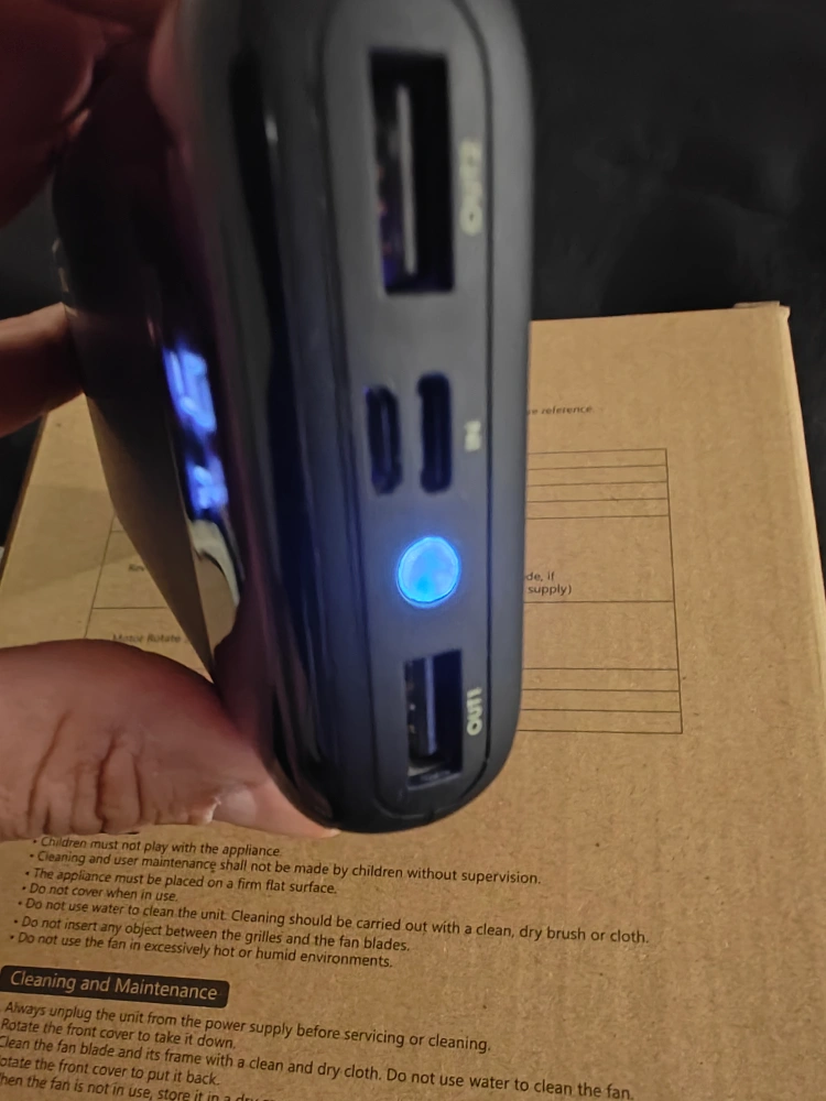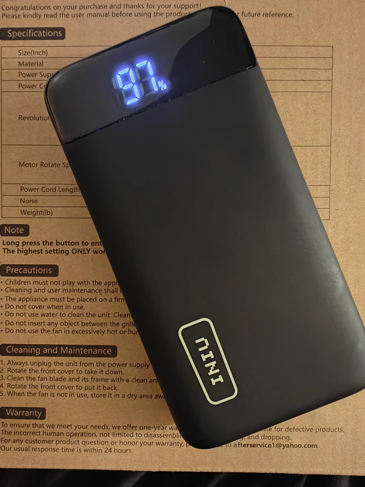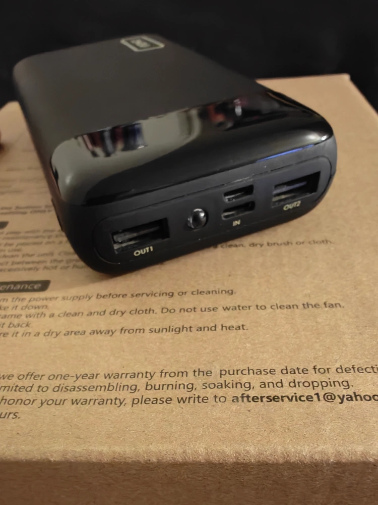 Black portable charger. Multiple USB ports. Slim design. LED battery indicator. Rechargeable.
