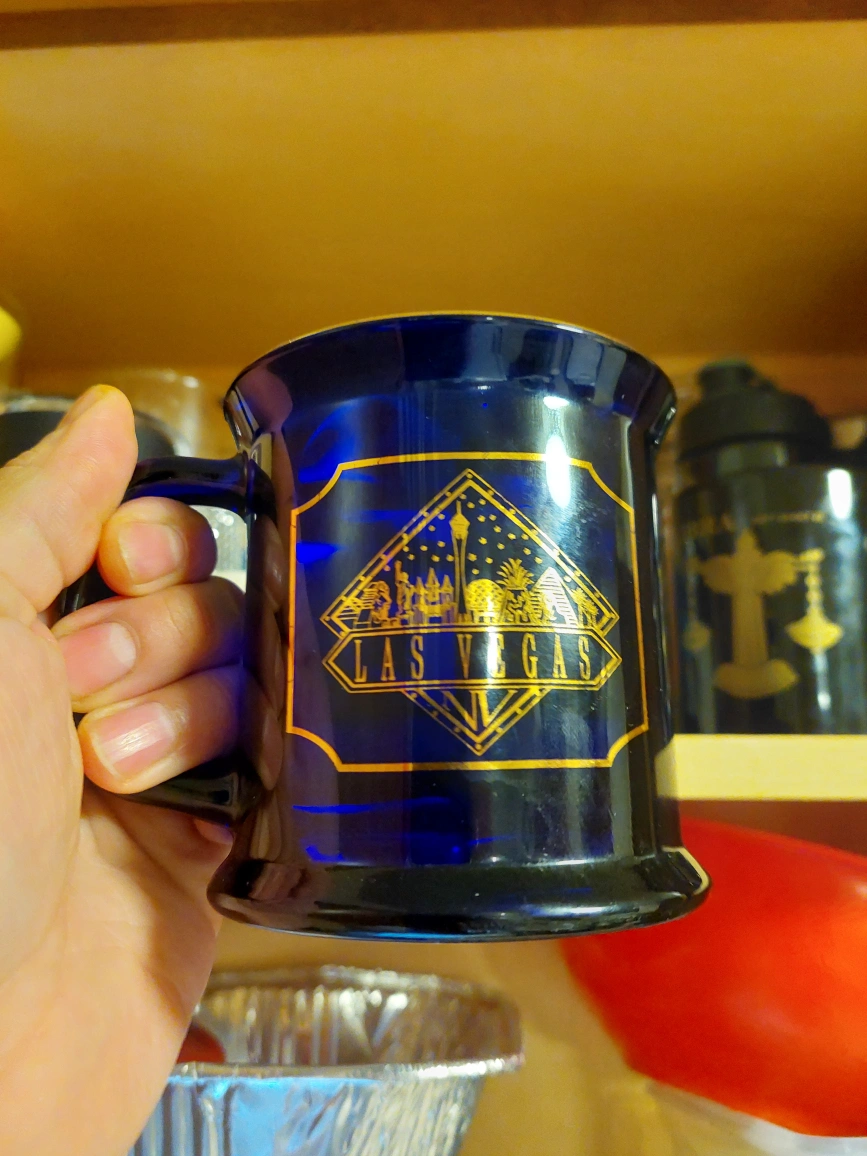 Collectible mug. Features a gold Las Vegas design on a deep blue glass body. Unique keepsake.