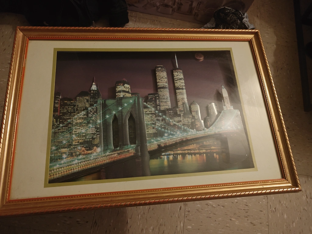 Framed 3D image of the New York City skyline at night. Features the Brooklyn Bridge and the Twin Towers. Gold frame.