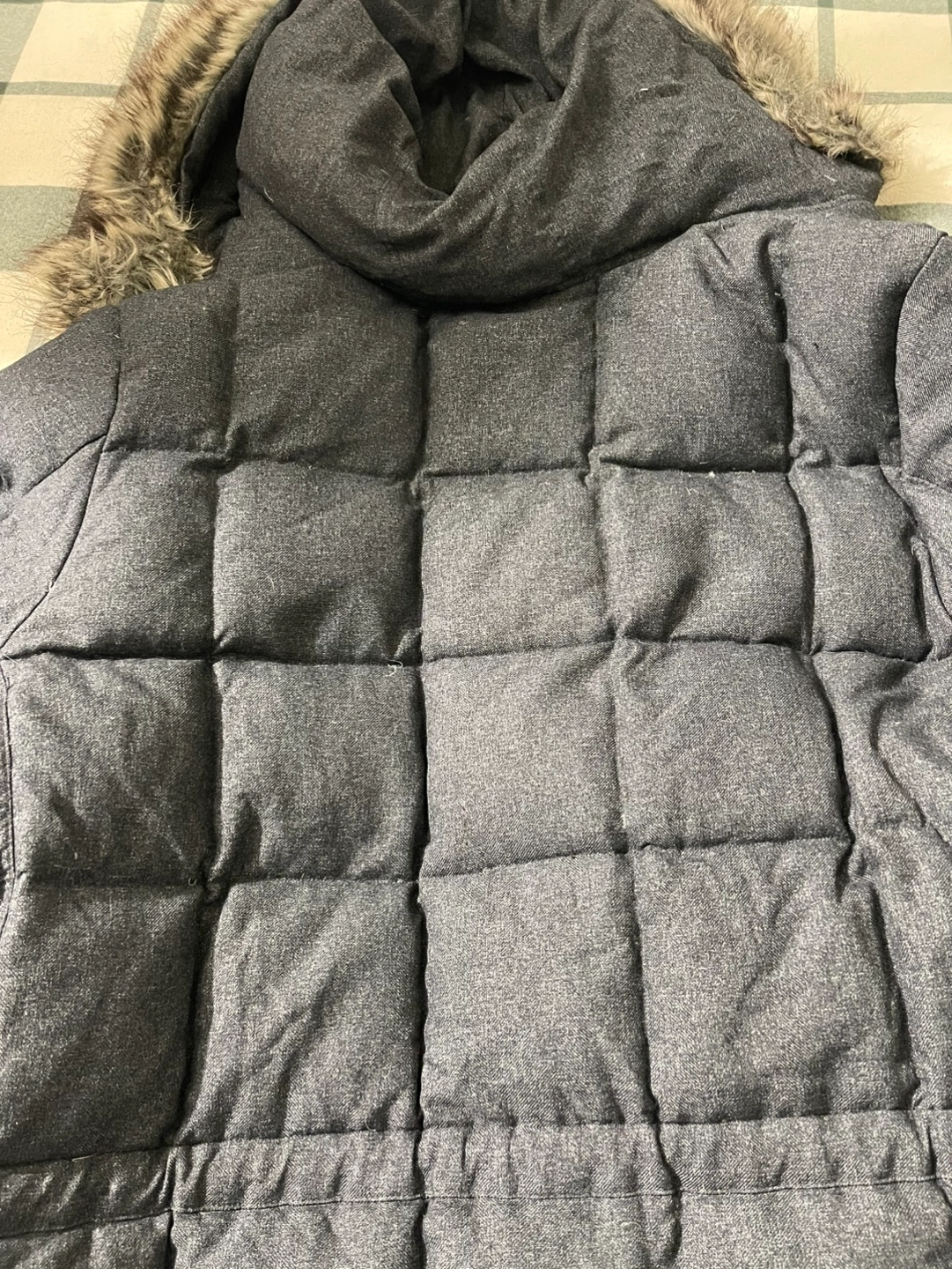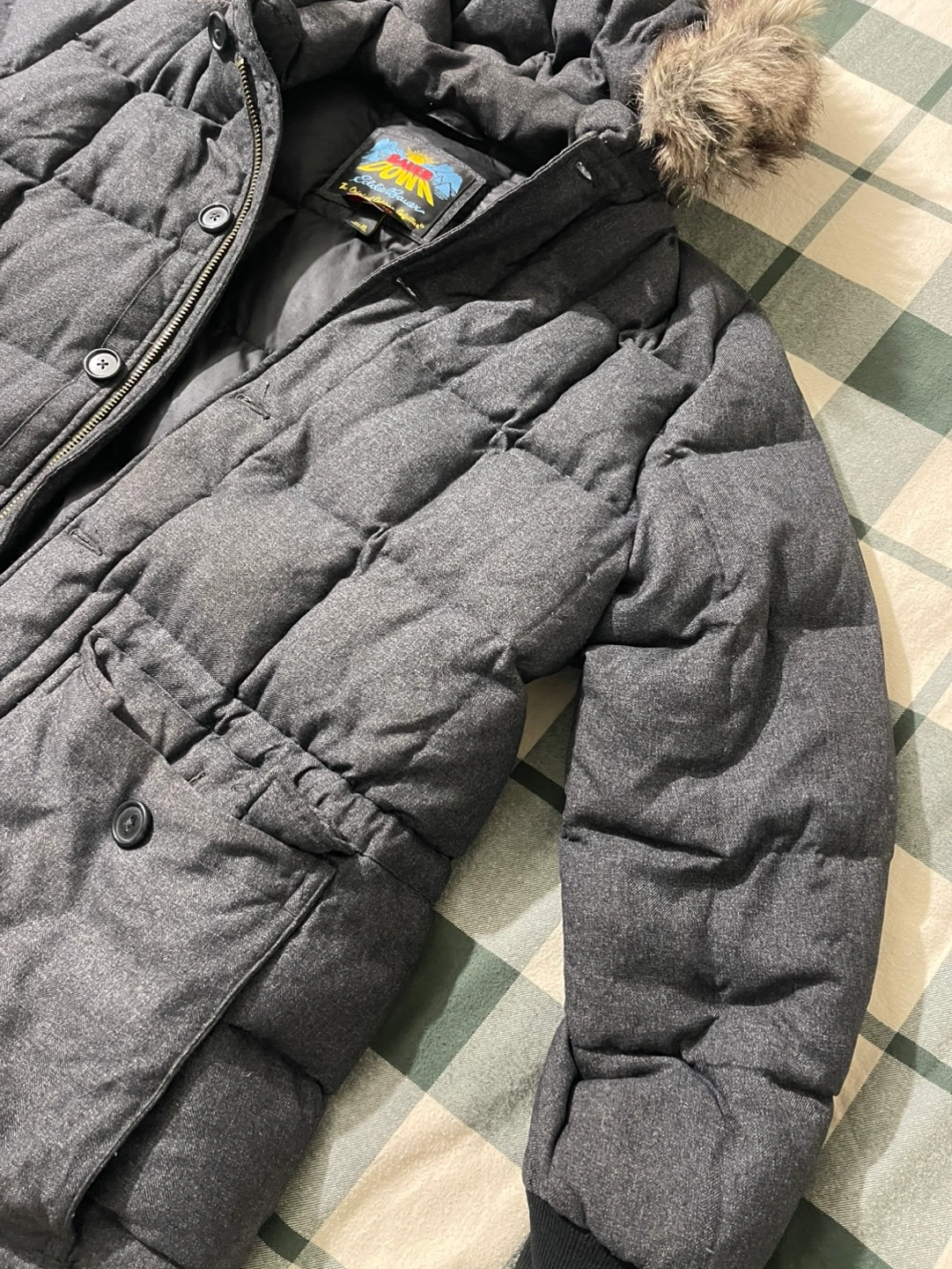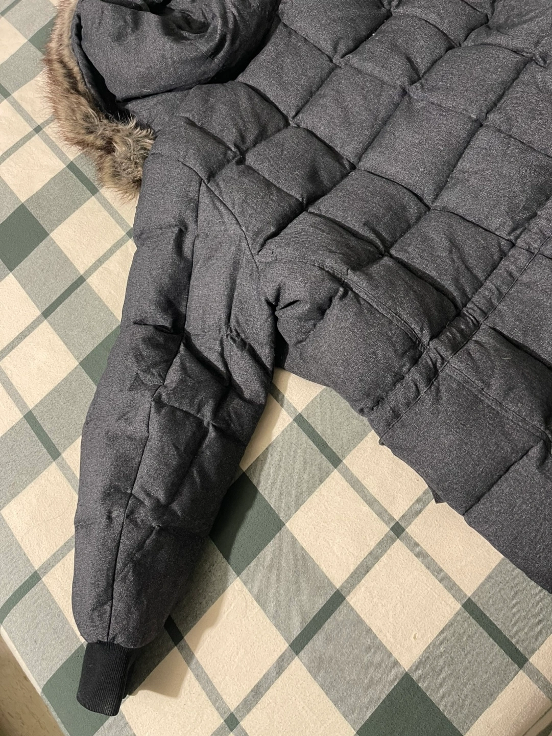 262Gray puffer jacket. Features a faux fur trimmed hood and button closures. Down filled. Excellent for cold weather.