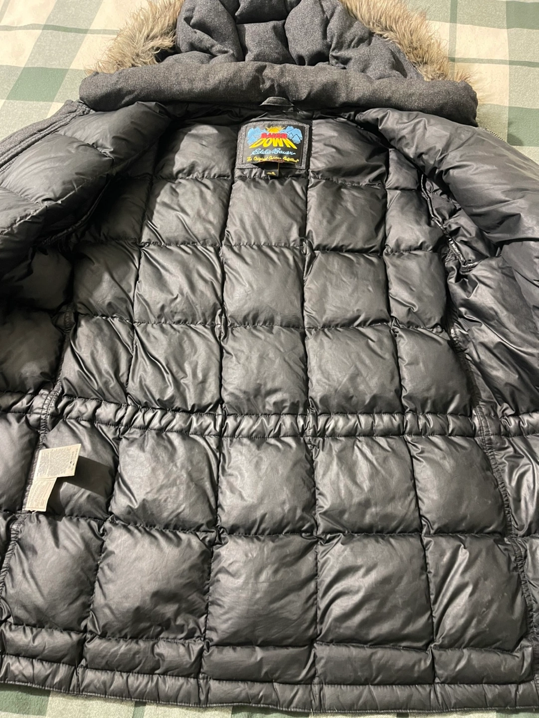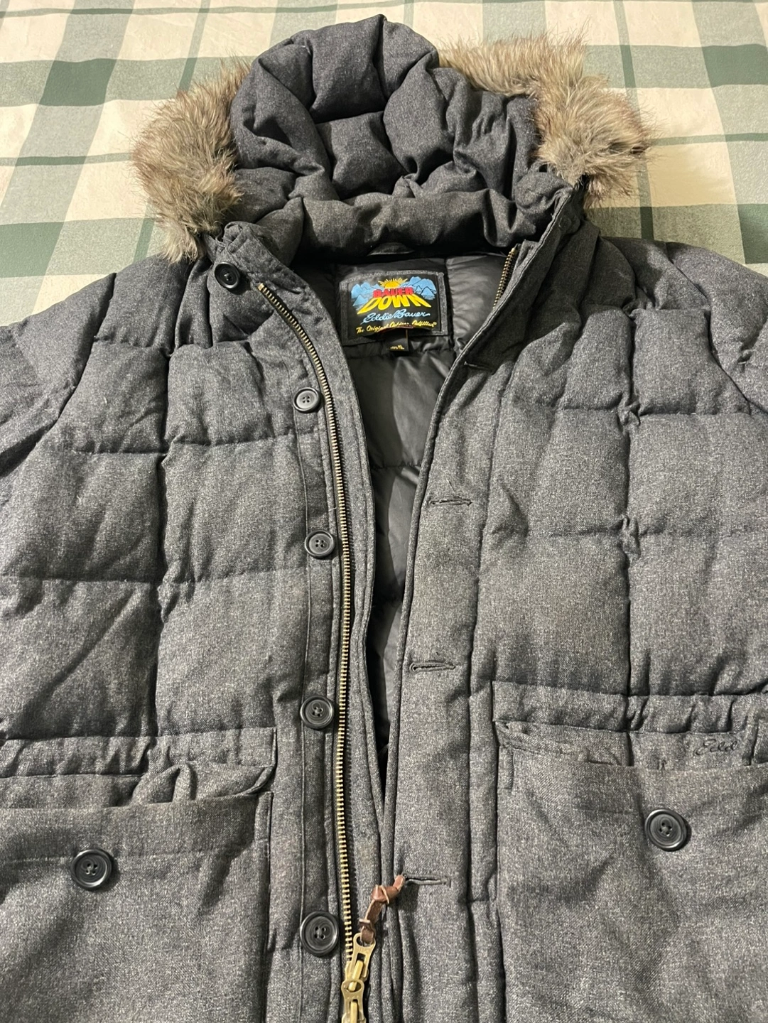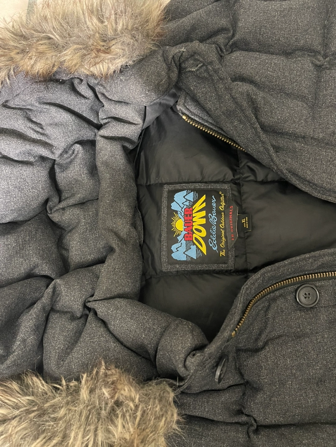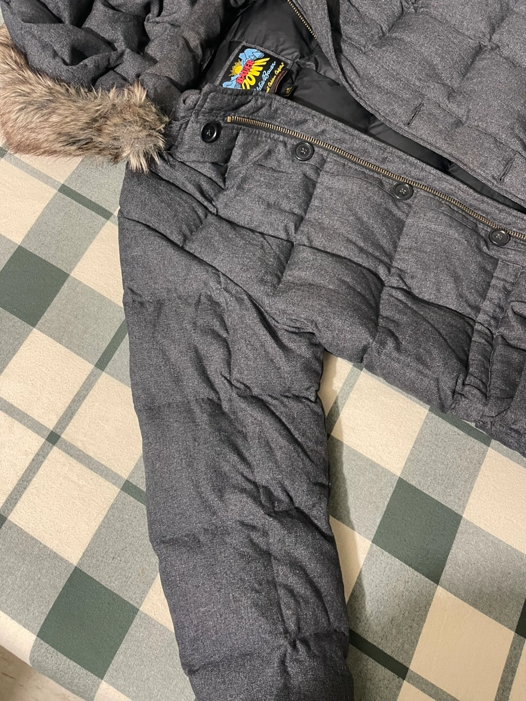 262Gray puffer jacket. Features a faux fur trimmed hood and button closures. Down filled. Excellent for cold weather.