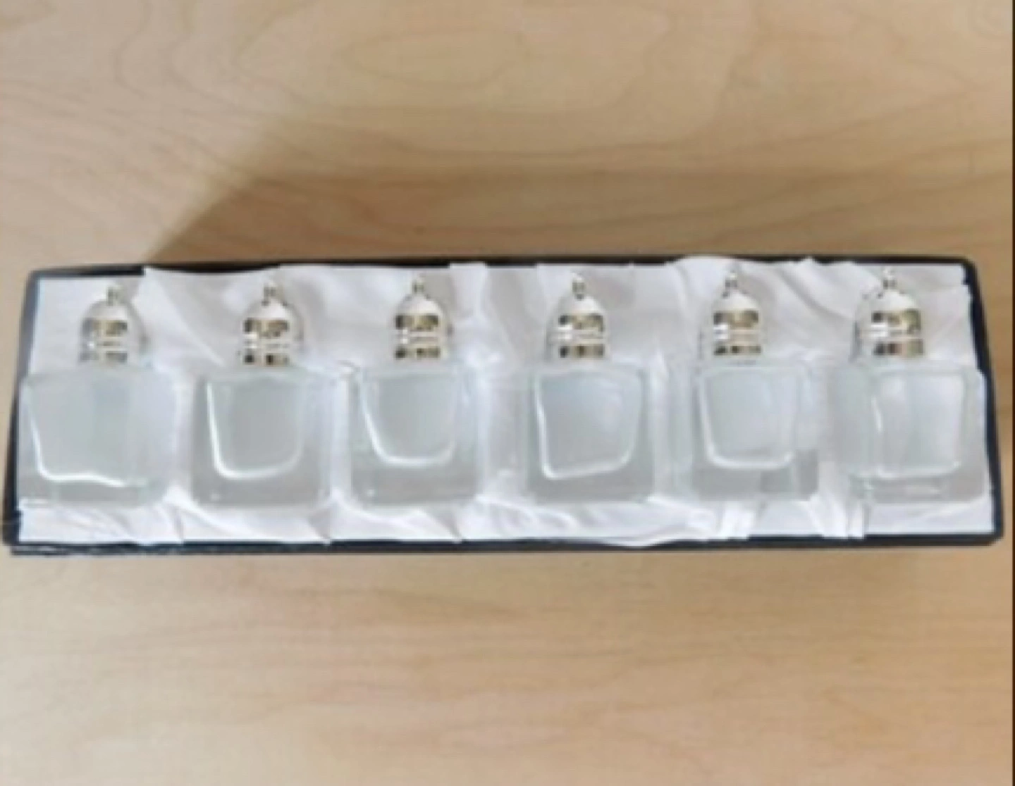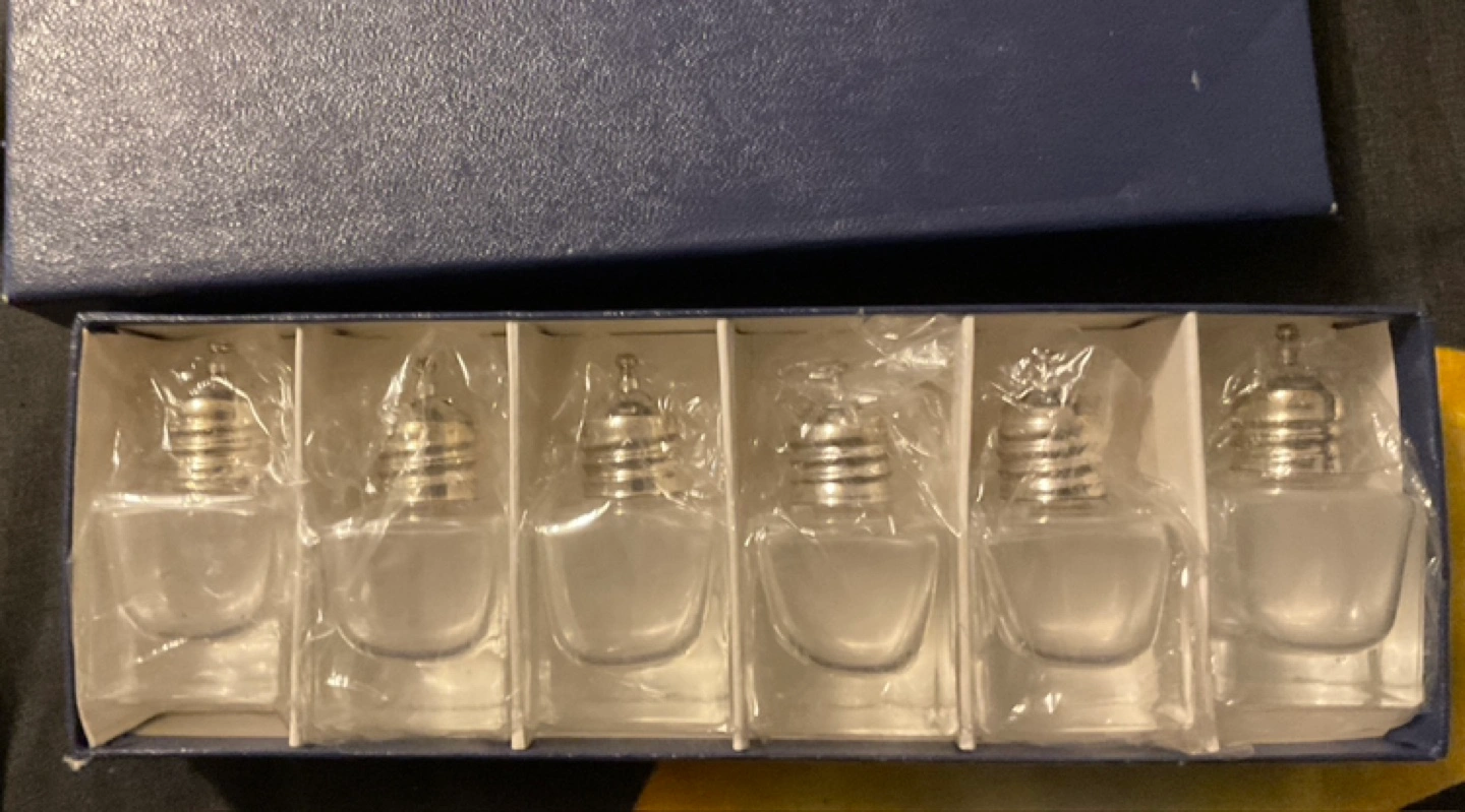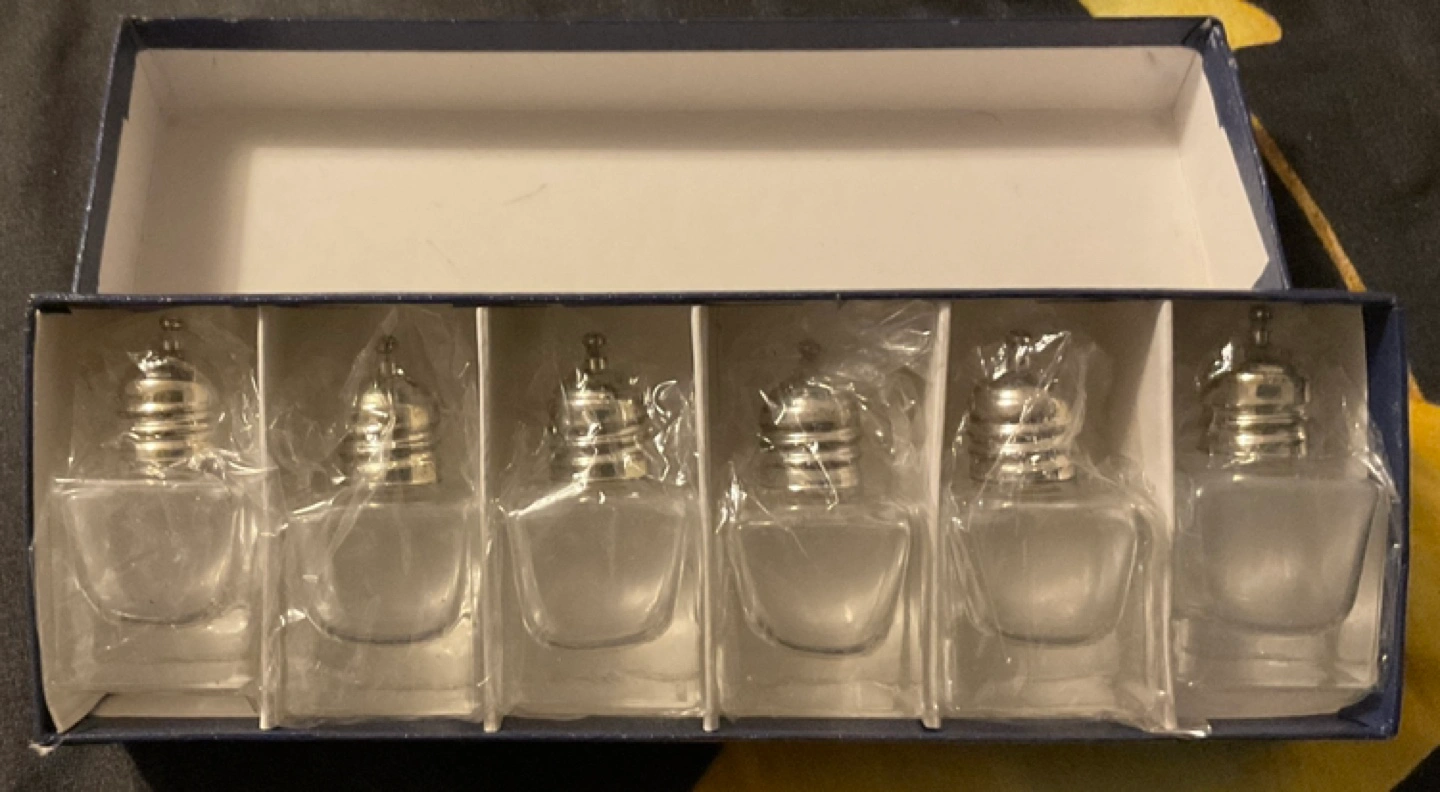 Vintage Set of six miniature glass salt and pepper shakers. Clear glass bodies with silver-toned tops. New, in original box. Perfect for small spaces or travel.