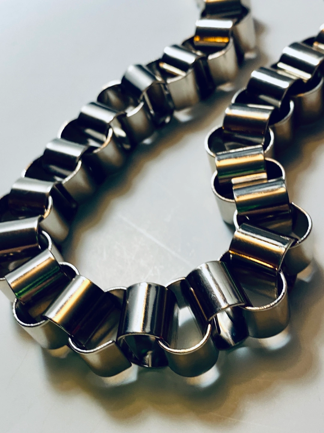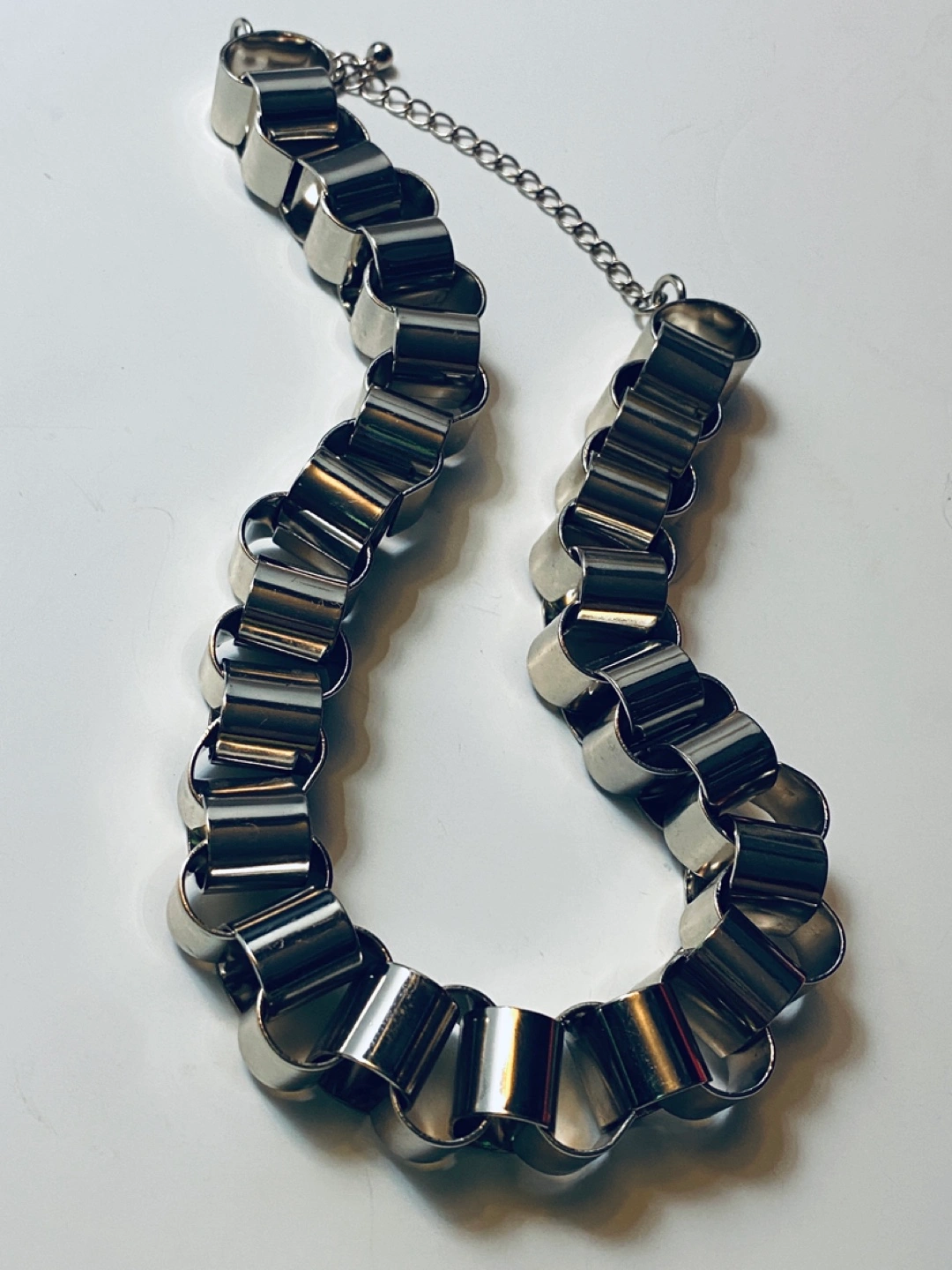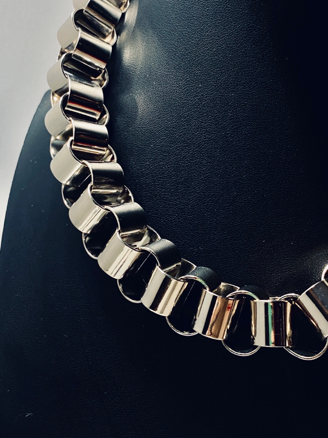 Unique statement choker necklace. Silver metallic chunky interlocking links. Bold design. Great for adding a modern touch to any outfit. Adjustable extender up to three inches.