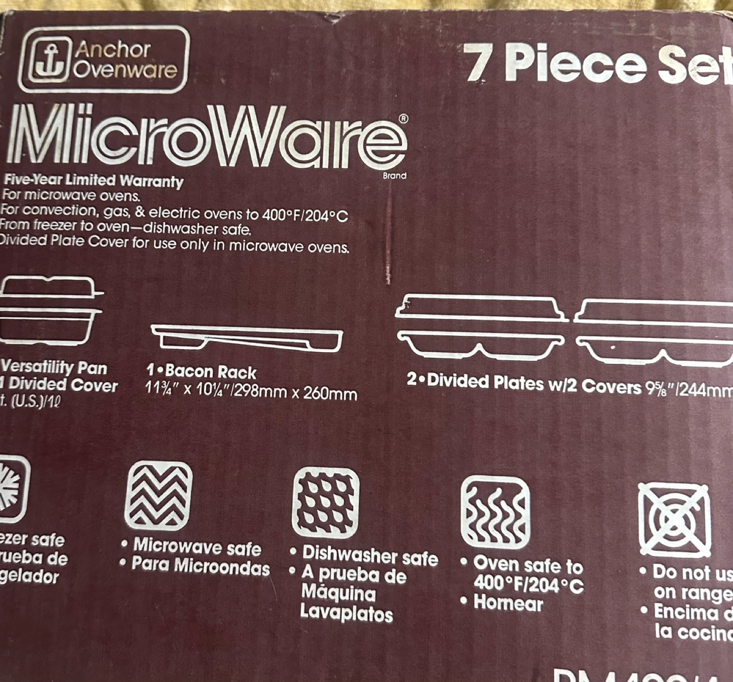 7-piece microwave cookware set. Includes versatility pan with divided cover, bacon rack, and two divided plates with covers. Oven safe to 400°F/204°C. Freezer and dishwasher safe. Five-year limited warranty.