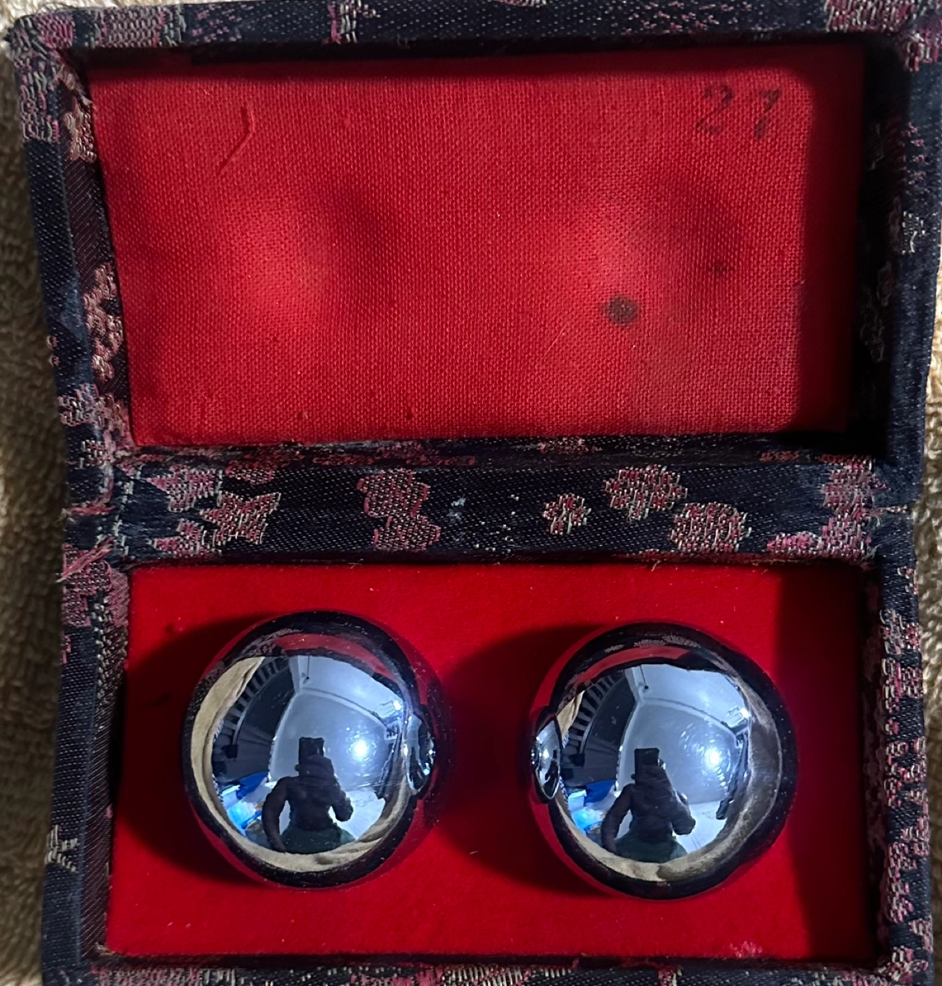 Pair of metal Baoding balls. Comes in ornate box. Great for stress relief and hand exercise.
