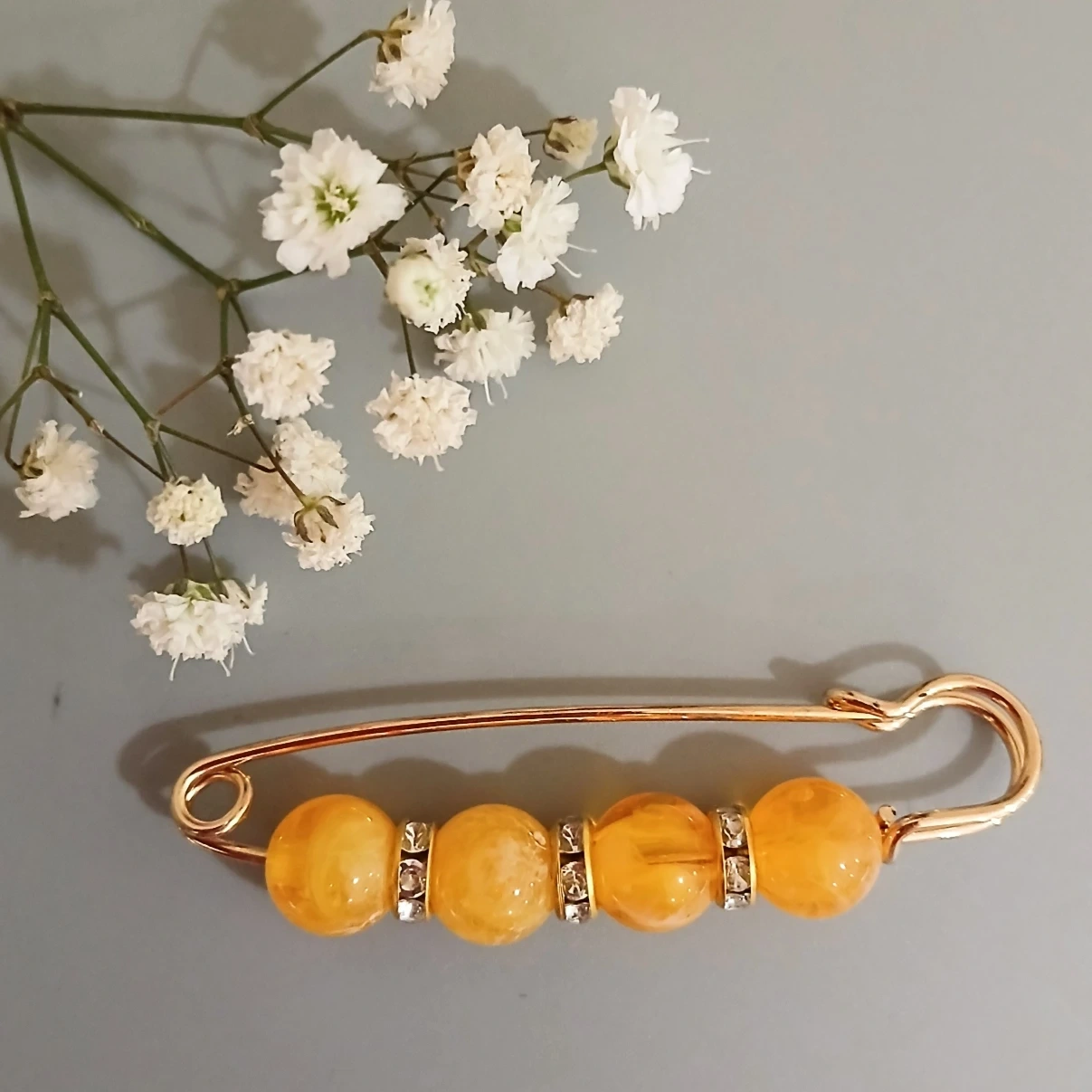 1000+Medium size brooch with three round orange beads with clear rhinestone accents. Elegant design.