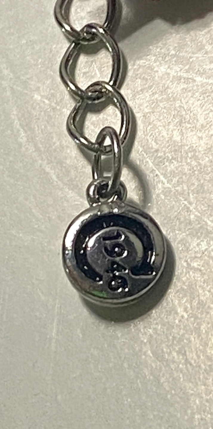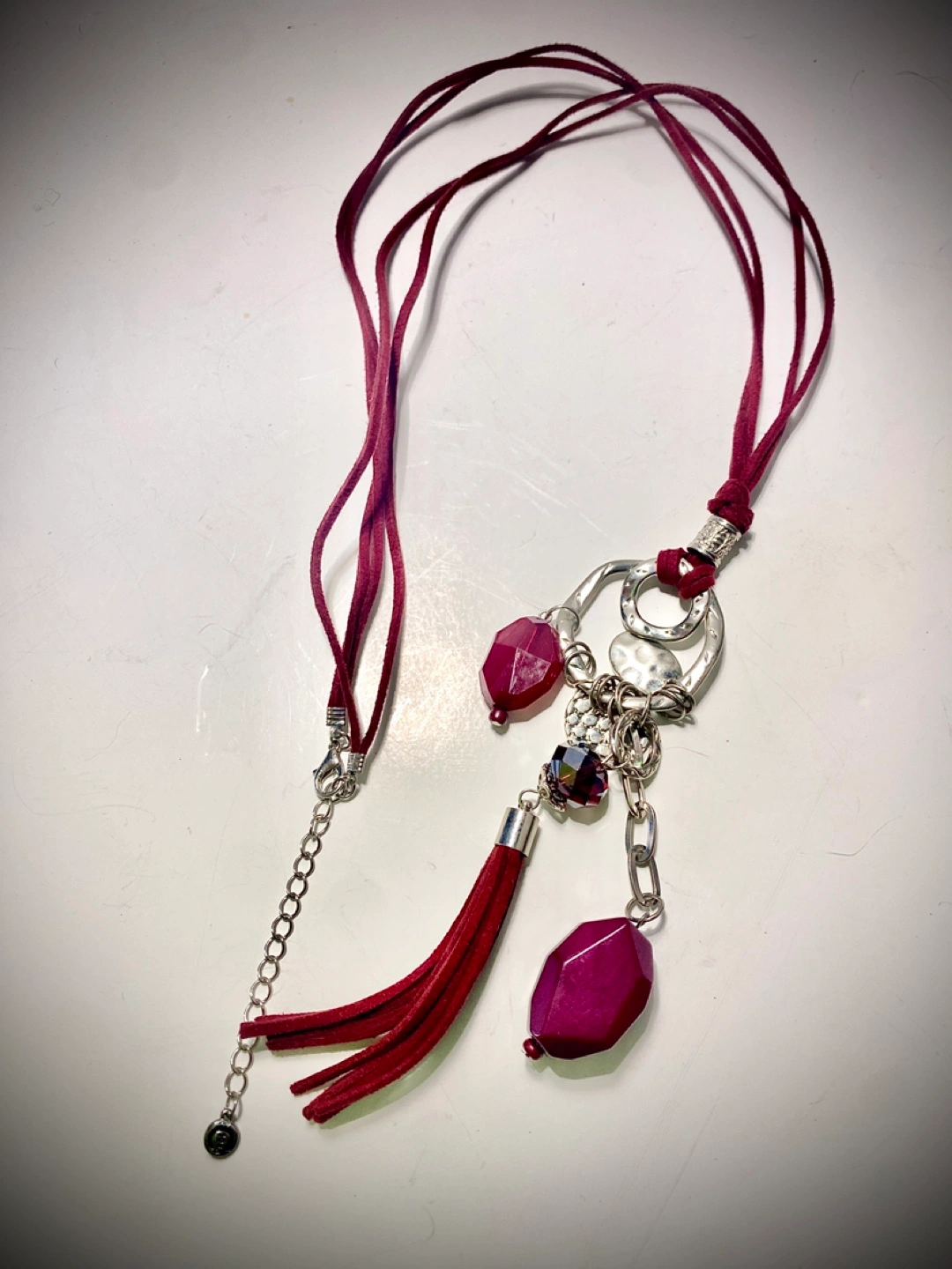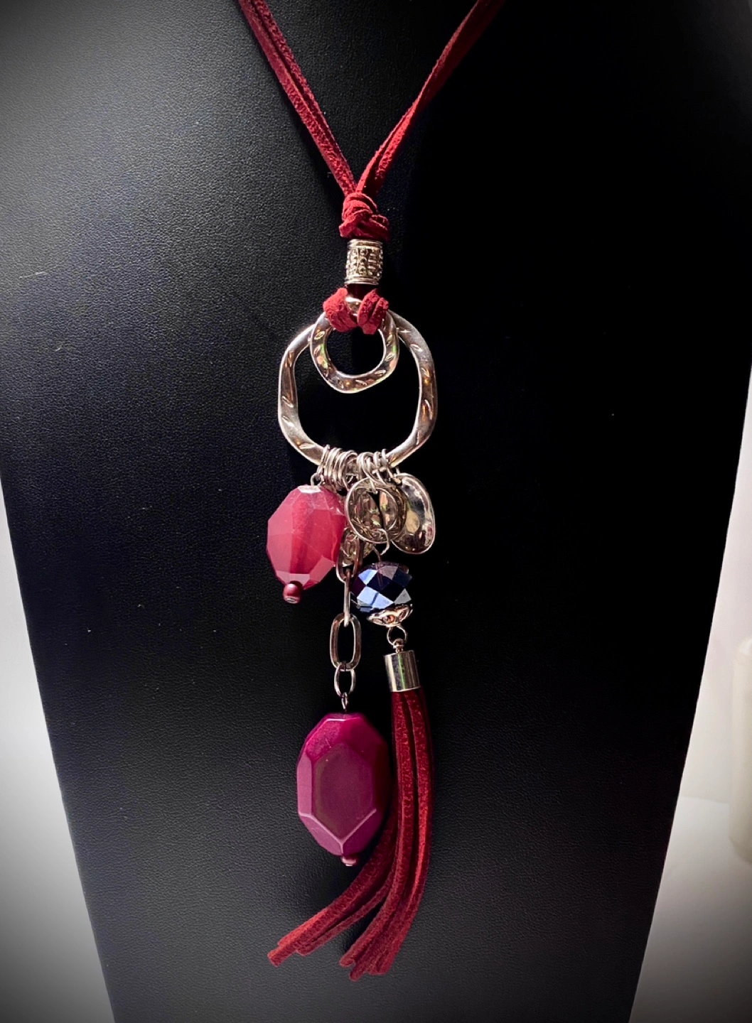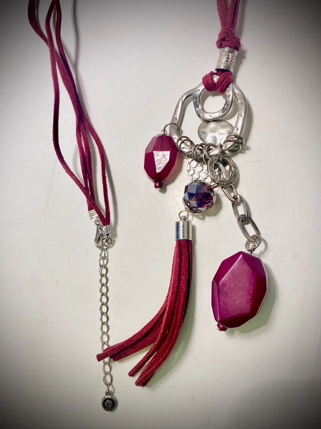 Long burgundy suede cord necklace. Features a silver metal circle pendant with multiple charms. Includes faceted red and dark purple stones. Silver chain accents and a burgundy suede tassel. Vintage C1946 probably late nineties to early 2000’s. Could also make a fabulous bag charm!